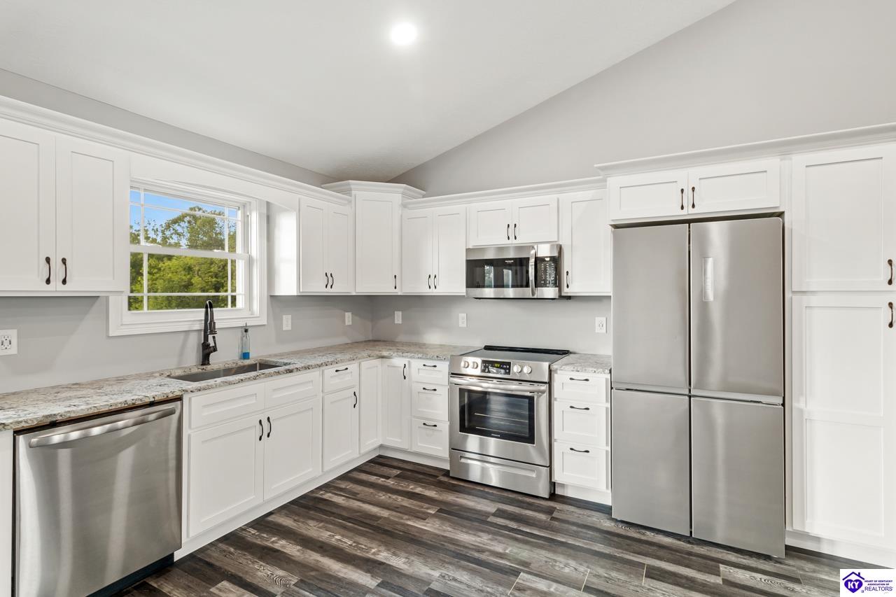 Realtor's notes: You don't want to miss out on this absolute gem of a home located on a spacious lot just outside of Hodgenville! This 3 bedroom, 2 bath ranch home features an open floor plan, partially finished basement, and a 2 car attached garage! When you enter the home you will find a soaring vaulted ceiling in the great room allowing natural light to flow throughout the space. The kitchen offers lots of cabinet and counterspace as well as stainless steel appliances. Just off the kitchen is a door leading to the deck that overlooks the sprawling fenced back yard where you will find a chicken coop and lots of space to create the yard of your dreams! Make your way to the primary bedroom where you will have a spa-like en suite bathroom with a tile shower and separate soaking tub. There is a huge walk-in closet for storing all of your clothing and accessories. Both the bathroom and the closet have attractive sliding bard doors offering a level of charm to the room. There are 2 additional bedrooms and a full bat with a shower/tub combo. Rounding out the first floor is the laundry room that is conveniently located on the main level with the bedrooms. You will love the partially finished basement that provides a second living area as well as a bonus room that can be used as an office or whatever suits your needs. The unfinished portion allows for extra storage space. The AC, furnace, water heater, and roof are all only 3 years old. Make sure you get a chance to see this home while it is still available - schedule a private tour today!