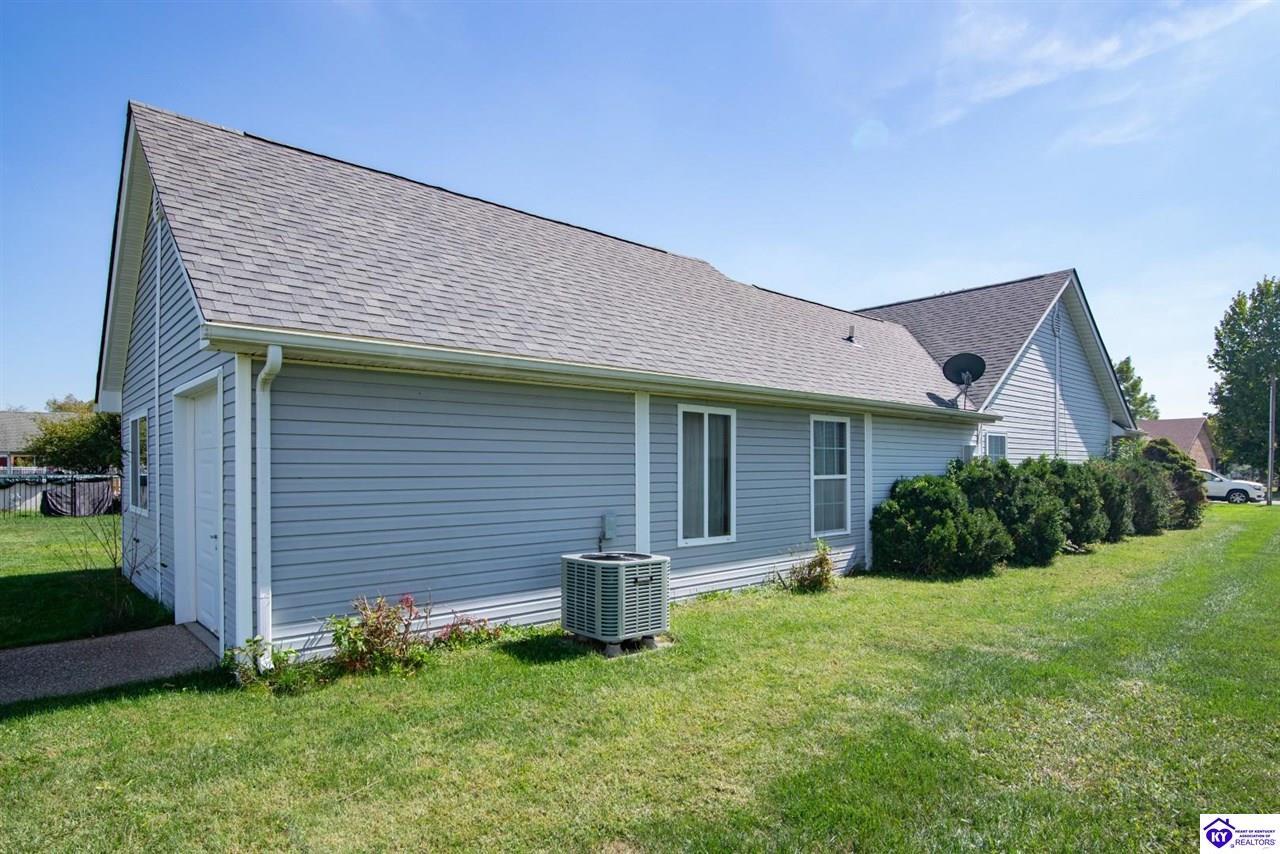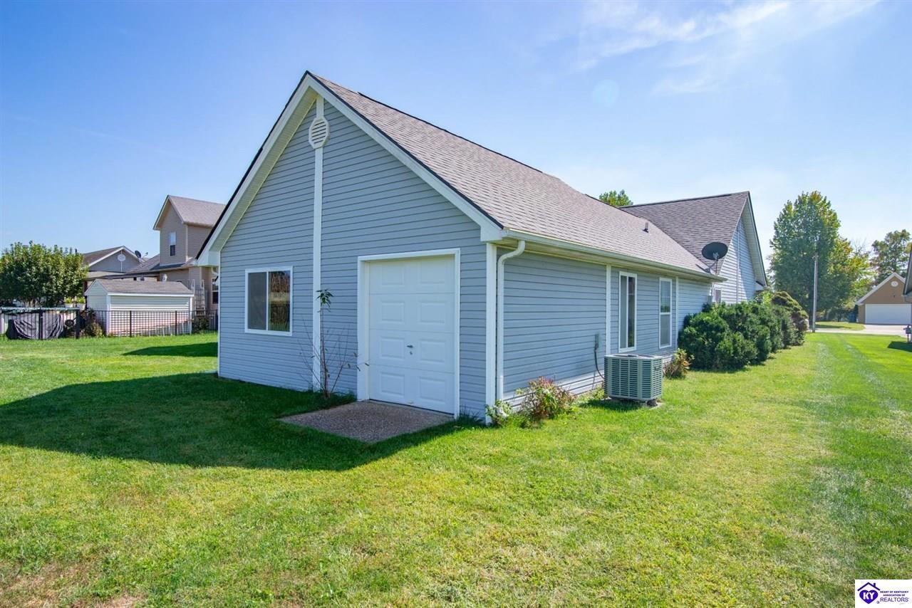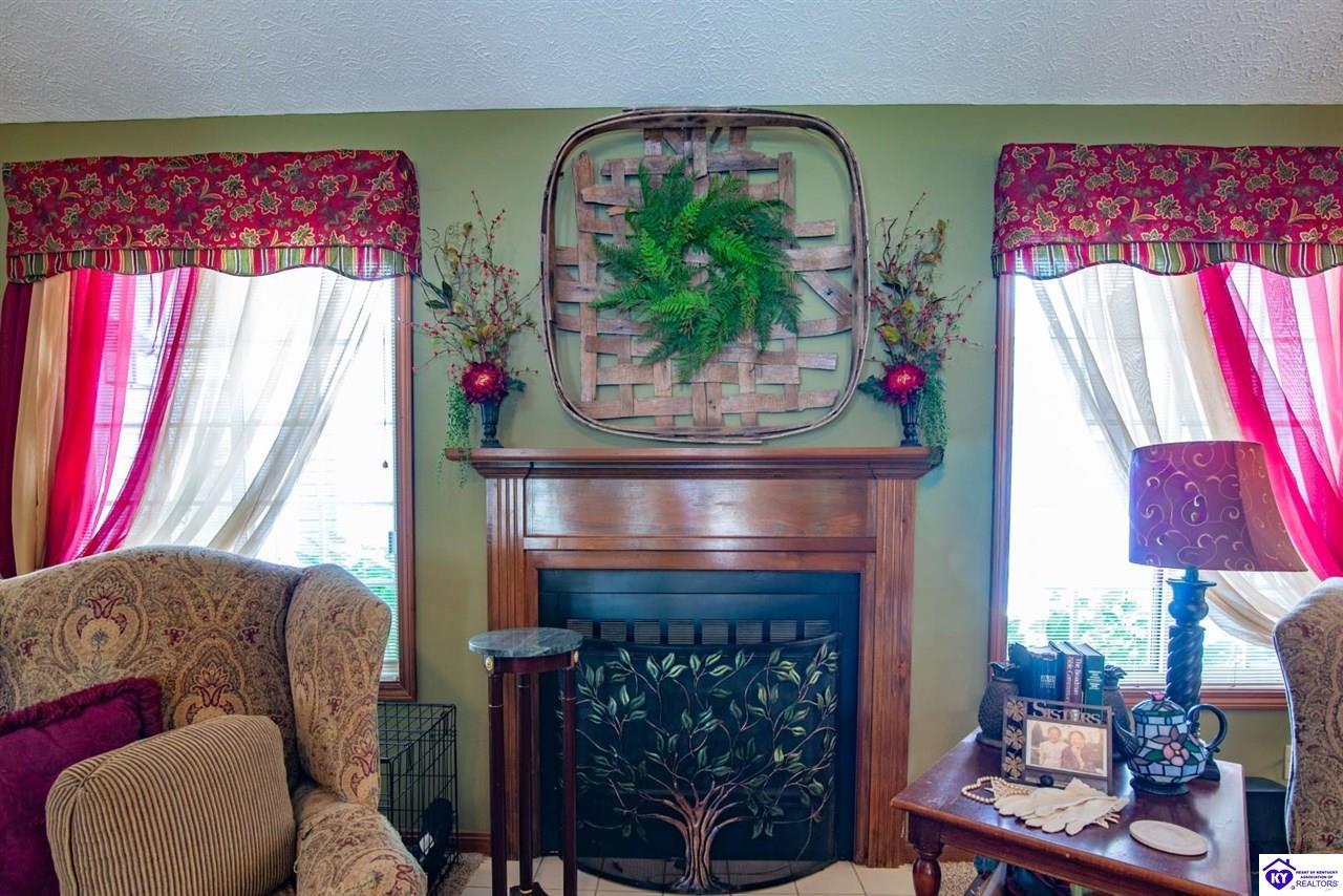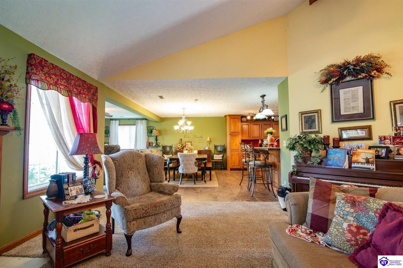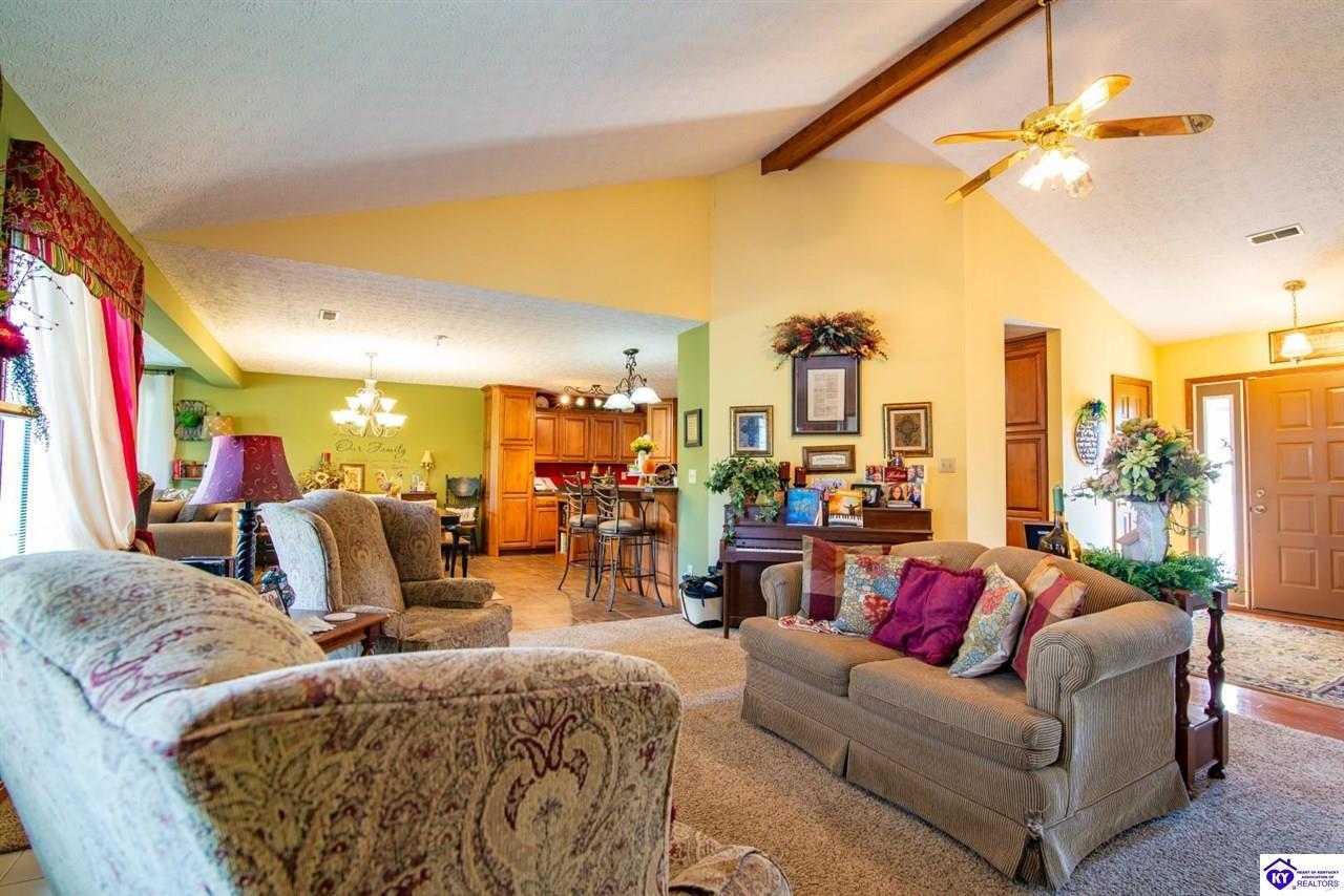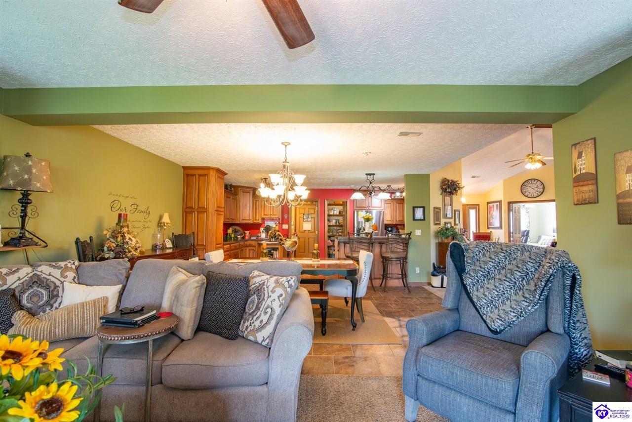 Realtor's notes: Beautiful Home Backing Up to the 11th Fairway of Heartland Golf Course! Enjoy golf-course living at its best in this stunning home located on the desirable north side of Elizabethtown. The welcoming foyer opens to a bright kitchen featuring beautiful cabinetry, a breakfast bar, and a spacious kitchen/dining area—perfect for family meals or entertaining. A comfortable family room leads out to a covered patio where you can relax and take in serene views of the fairway. The home also includes a living room with a cozy fireplace, creating a warm atmosphere for gatherings. The private master suite offers vaulted ceilings, a walk-in closet, and a full bath with a double vanity. There are three additional bedrooms and another full bath, providing ample space for family or guests. The backyard has underground pet fencing. The home’s combination of hardwood, tile, and carpet flooring adds both style and comfort throughout. Outside, you’ll appreciate a two-car attached garage plus a dedicated golf cart/mower garage, ideal for your active lifestyle. This property blends comfort, function, and location—offering peaceful golf-course views just minutes from everything Elizabethtown has to offer!