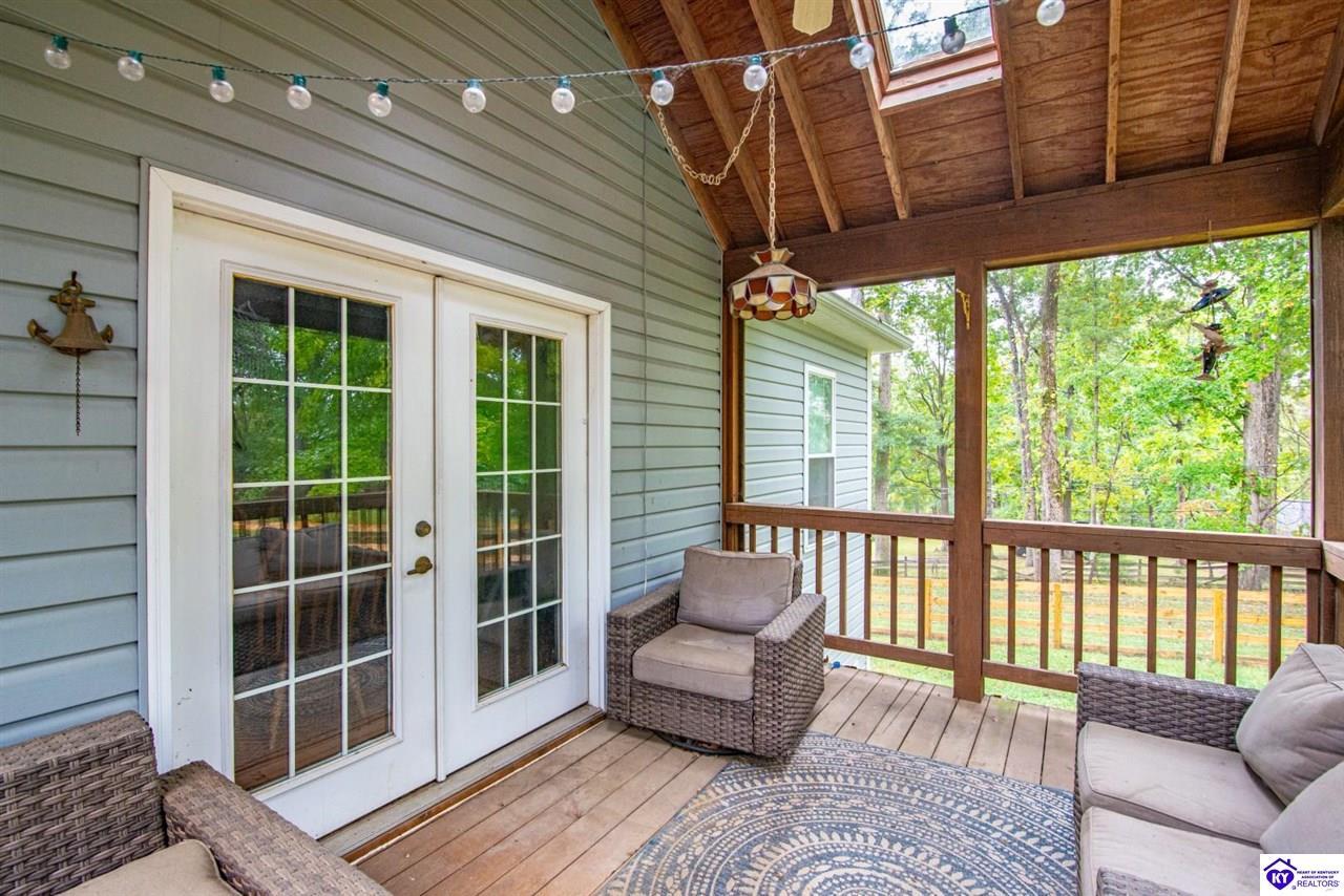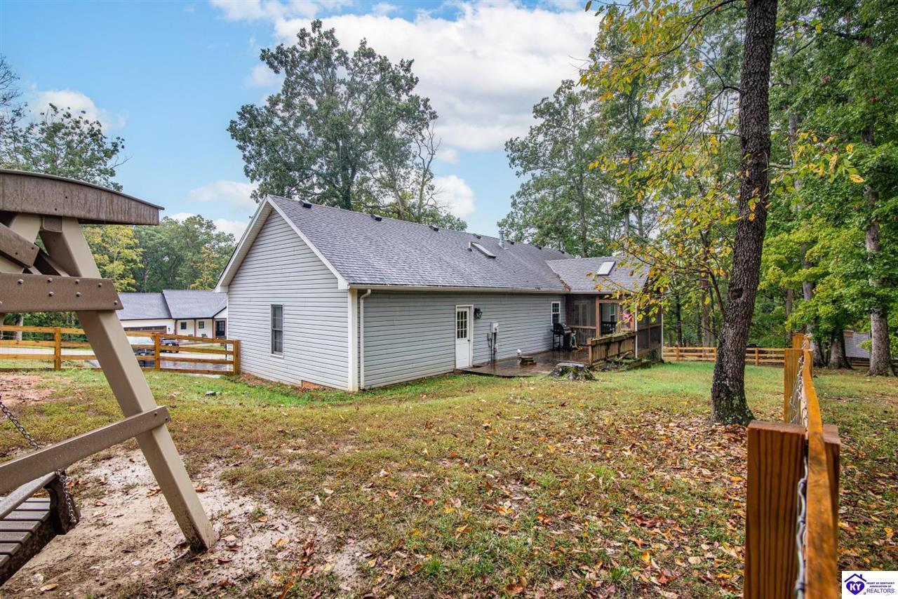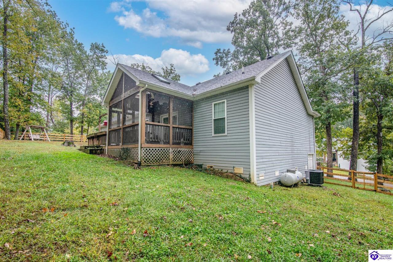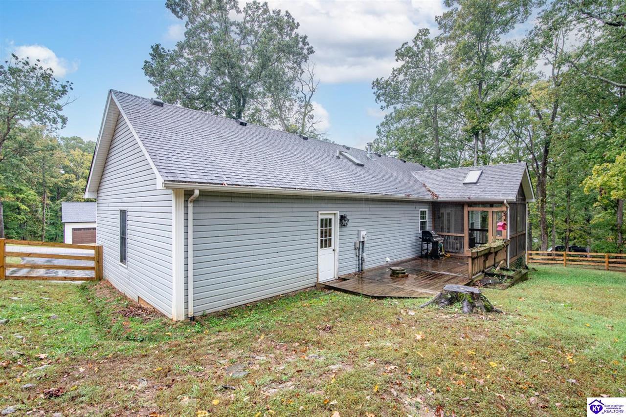 Realtor's notes: Discover the charm of this 3 bedroom, 2 bath ranch home nestled on a spacious corner lot in the desirable gated community of Doe Valley. This thoughtfully designed split floor plan offers comfort and functionality, featuring a cozy living area with a gas log fireplace and outside, a screened-in porch—perfect for relaxing and watching the local wildlife. The primary suite is a true retreat, complete with a skylight and a beautifully tiled walk-in shower. A two-car attached garage provides added convenience and storage space. Enjoy all that Doe Valley has to offer, including a community lake with two beaches, a pool, marina, golf course, Swim and Tennis Club and restaurant, tennis and basketball courts, and more. Conveniently located just minutes from local shops and dining, and an easy commute to Fort Knox, Elizabethtown, and Louisville.