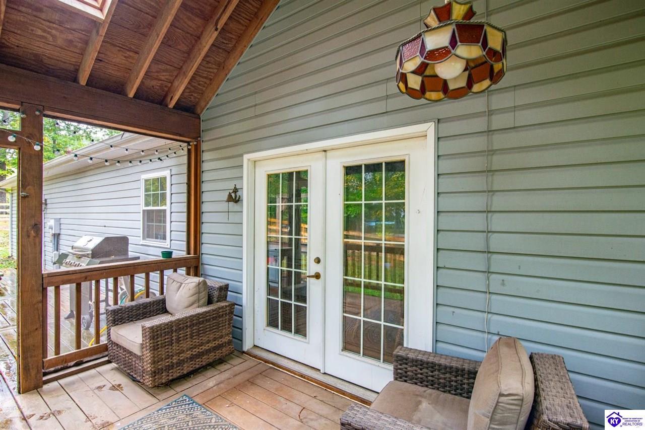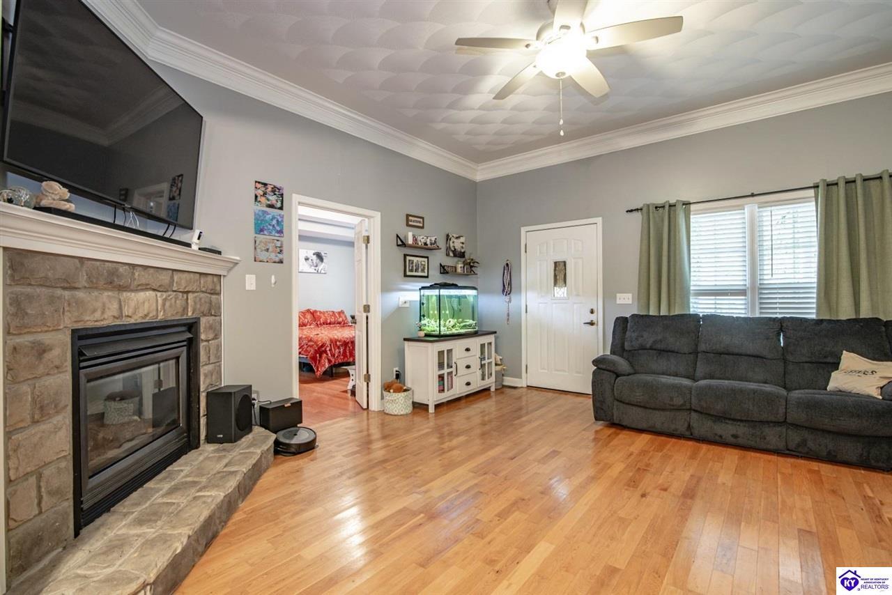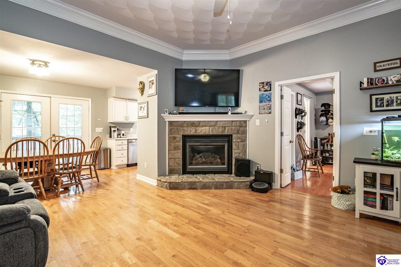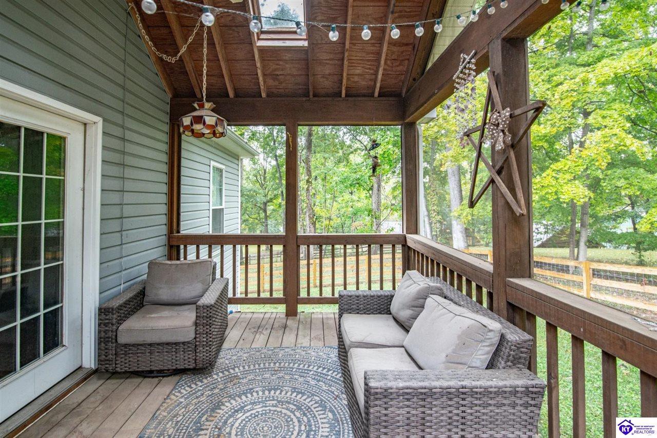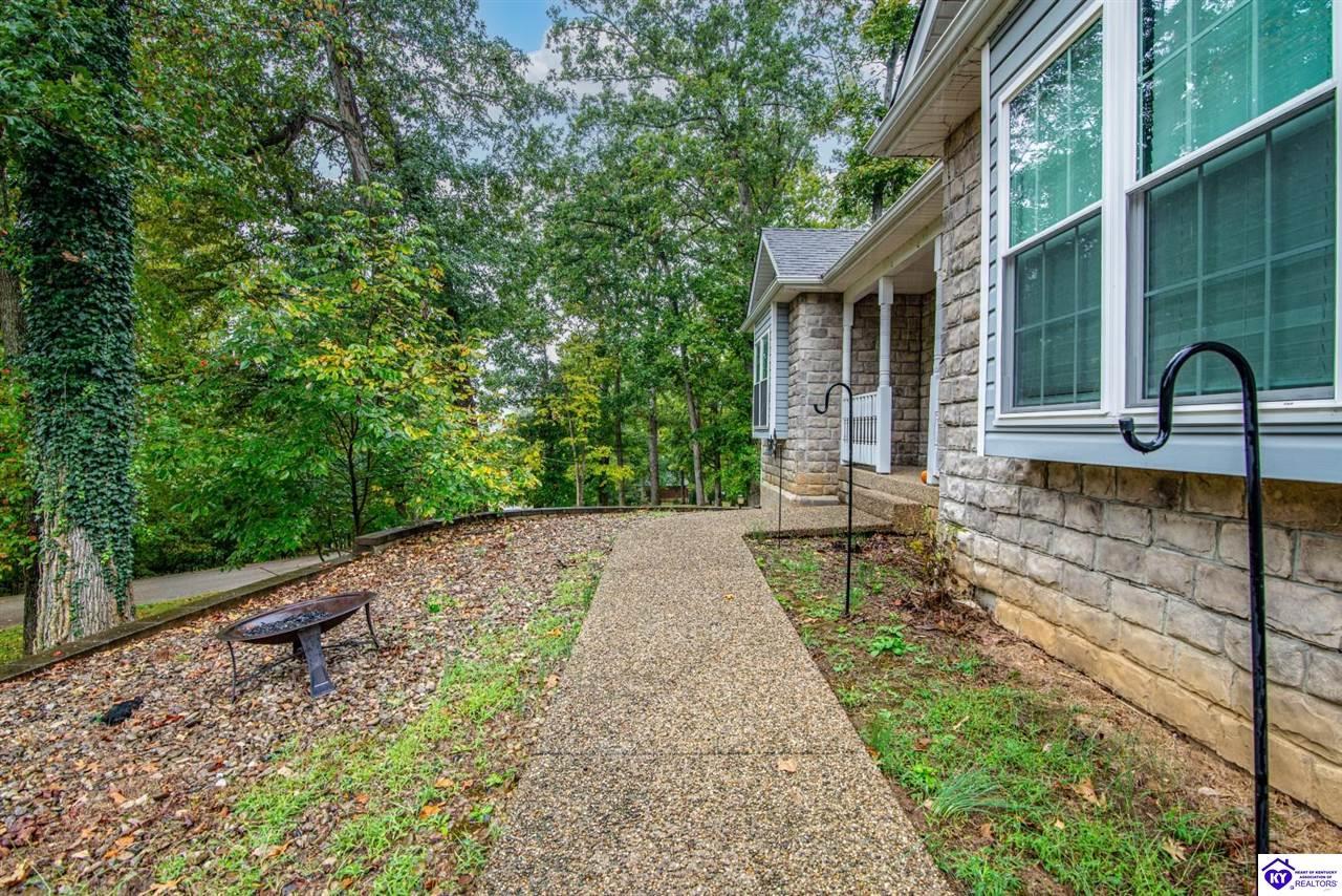Realtor's notes: Discover the charm of this 3 bedroom, 2 bath ranch home nestled on a spacious corner lot in the desirable gated community of Doe Valley. This thoughtfully designed split floor plan offers comfort and functionality, featuring a cozy living area with a gas log fireplace and outside, a screened-in porch—perfect for relaxing and watching the local wildlife. The primary suite is a true retreat, complete with a skylight and a beautifully tiled walk-in shower. A two-car attached garage provides added convenience and storage space. Enjoy all that Doe Valley has to offer, including a community lake with two beaches, a pool, marina, golf course, Swim and Tennis Club and restaurant, tennis and basketball courts, and more. Conveniently located just minutes from local shops and dining, and an easy commute to Fort Knox, Elizabethtown, and Louisville.