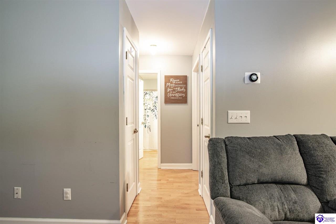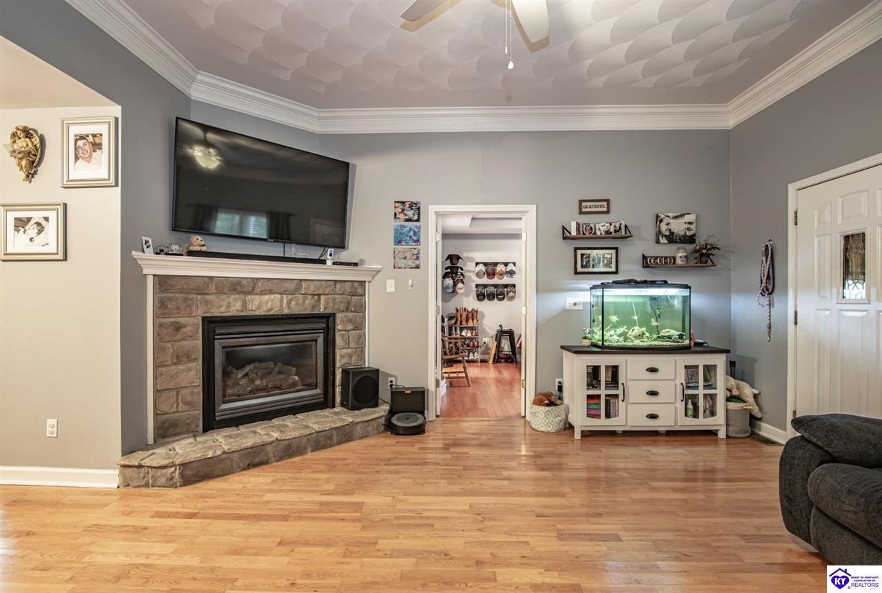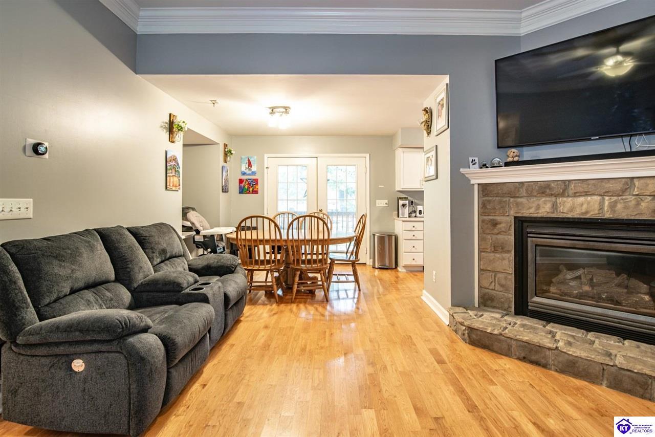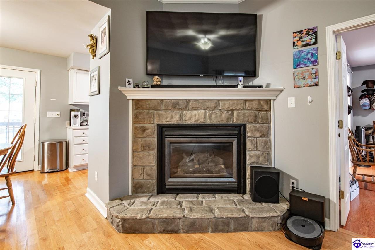 Realtor's notes: Discover the charm of this 3 bedroom, 2 bath ranch home nestled on a spacious corner lot in the desirable gated community of Doe Valley. This thoughtfully designed split floor plan offers comfort and functionality, featuring a cozy living area with a gas log fireplace and outside, a screened-in porch—perfect for relaxing and watching the local wildlife. The primary suite is a true retreat, complete with a skylight and a beautifully tiled walk-in shower. A two-car attached garage provides added convenience and storage space. Enjoy all that Doe Valley has to offer, including a community lake with two beaches, a pool, marina, golf course, Swim and Tennis Club and restaurant, tennis and basketball courts, and more. Conveniently located just minutes from local shops and dining, and an easy commute to Fort Knox, Elizabethtown, and Louisville.