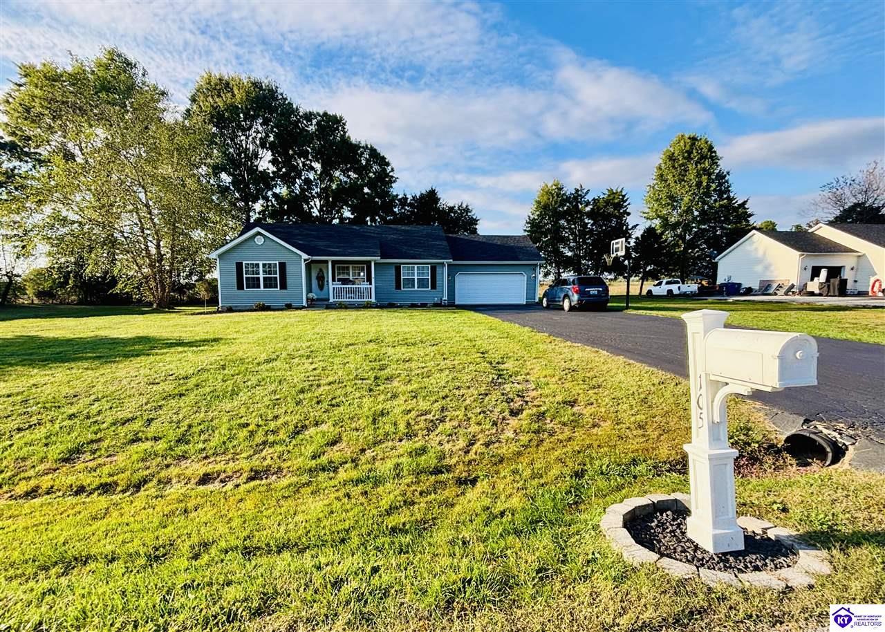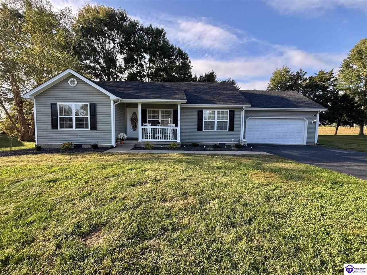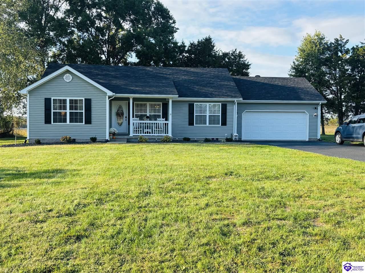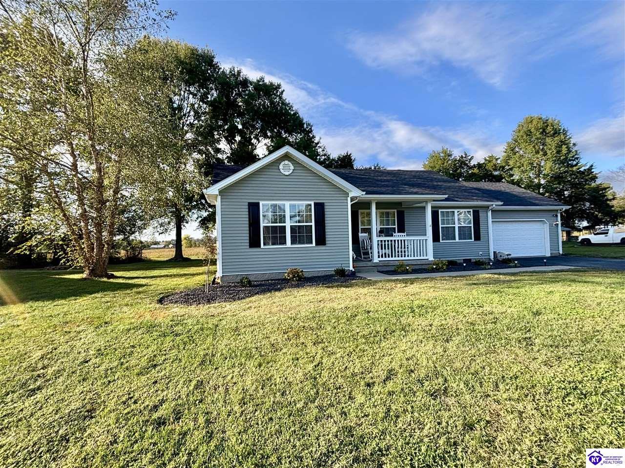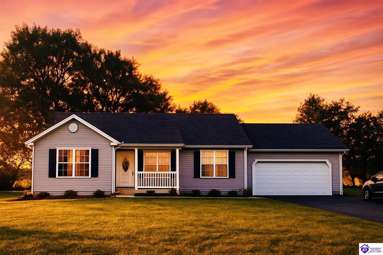 Realtor's notes: ADORABLE HOME! This stunning residence has just been listed on the market. The property boasts numerous desirable features, including a charming covered front porch. Upon entering the home, you'll appreciate the sought-after split floor plan. The main living area showcases beautiful hardwood floors and vaulted ceilings. The exquisite crown molding in the home adds a touch of luxury. The primary suite offers a walk-in closet, tray ceilings, and beautiful crown molding, while the primary bathroom is equally impressive. The expansive kitchen is a focal point, featuring stylish flooring, newer stainless steel appliances, and an osmosis system. The picturesque view from the kitchen window is an added bonus. Two additional bedrooms are conveniently located on the opposite side of the home, split with a full-size bathroom. The rear of the property boasts a newer deck, perfect for relaxation, entertainment, and enjoying the breathtaking sunsets. The yard is generously sized, and the shed remains with the property. Enjoy relaxing moments by the fire pit that STAYS! A two-car garage with an overhead door provides ample parking and storage space. Currently utilized as an exercise room and workshop, the garage offers endless possibilities. Additional features include a Blink security system and two security key locks. SO MUCH TO LOVE! Located in the Heart of Kentucky, this residence is mere miles from Green River Lake and offers convenient access to shopping, restaurants, boutiques, a hospital, and the Campbellsville Country Club. Data believed to be correct but not guaranteed. Buyer to verify data prior to offer.