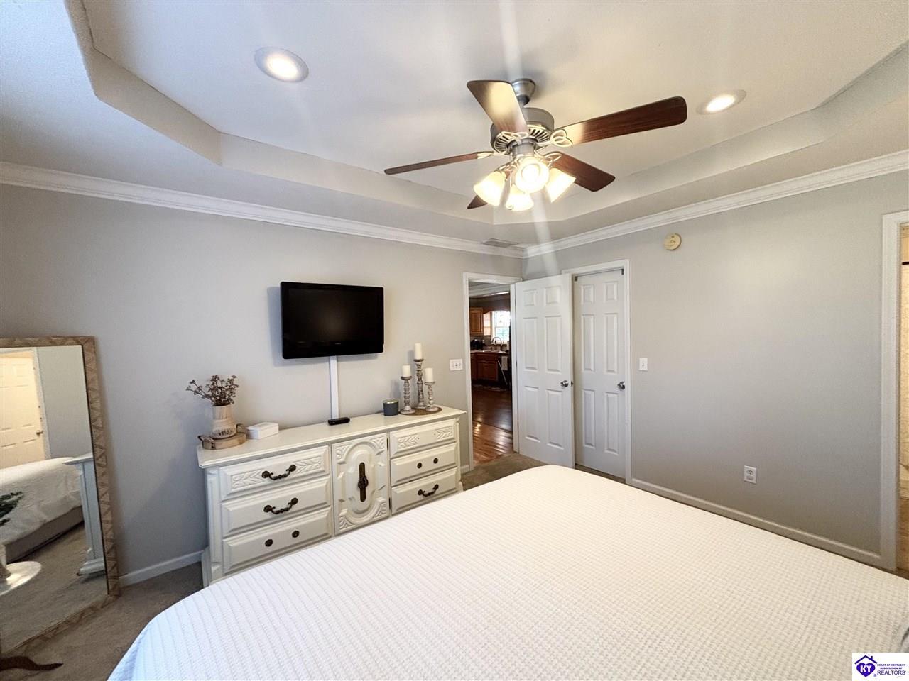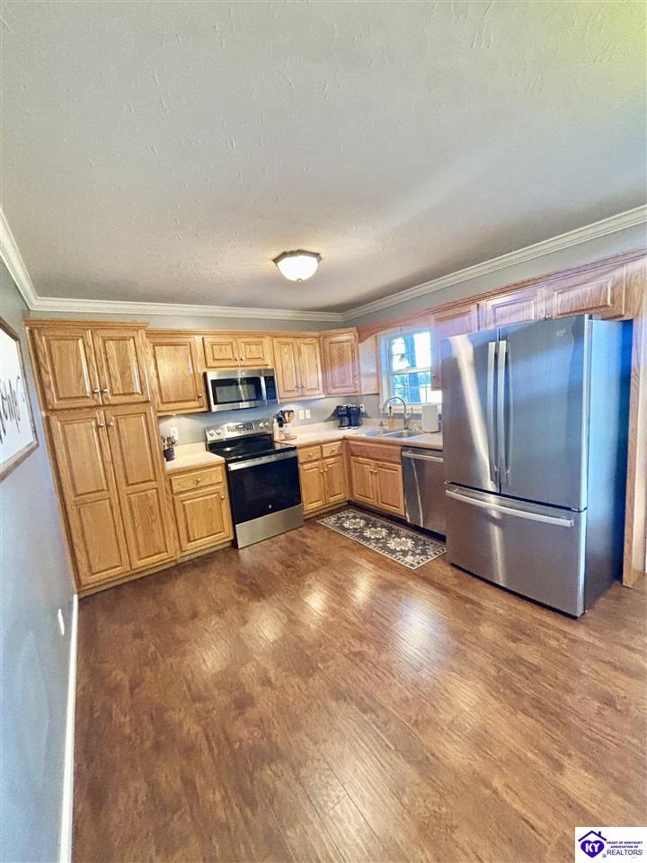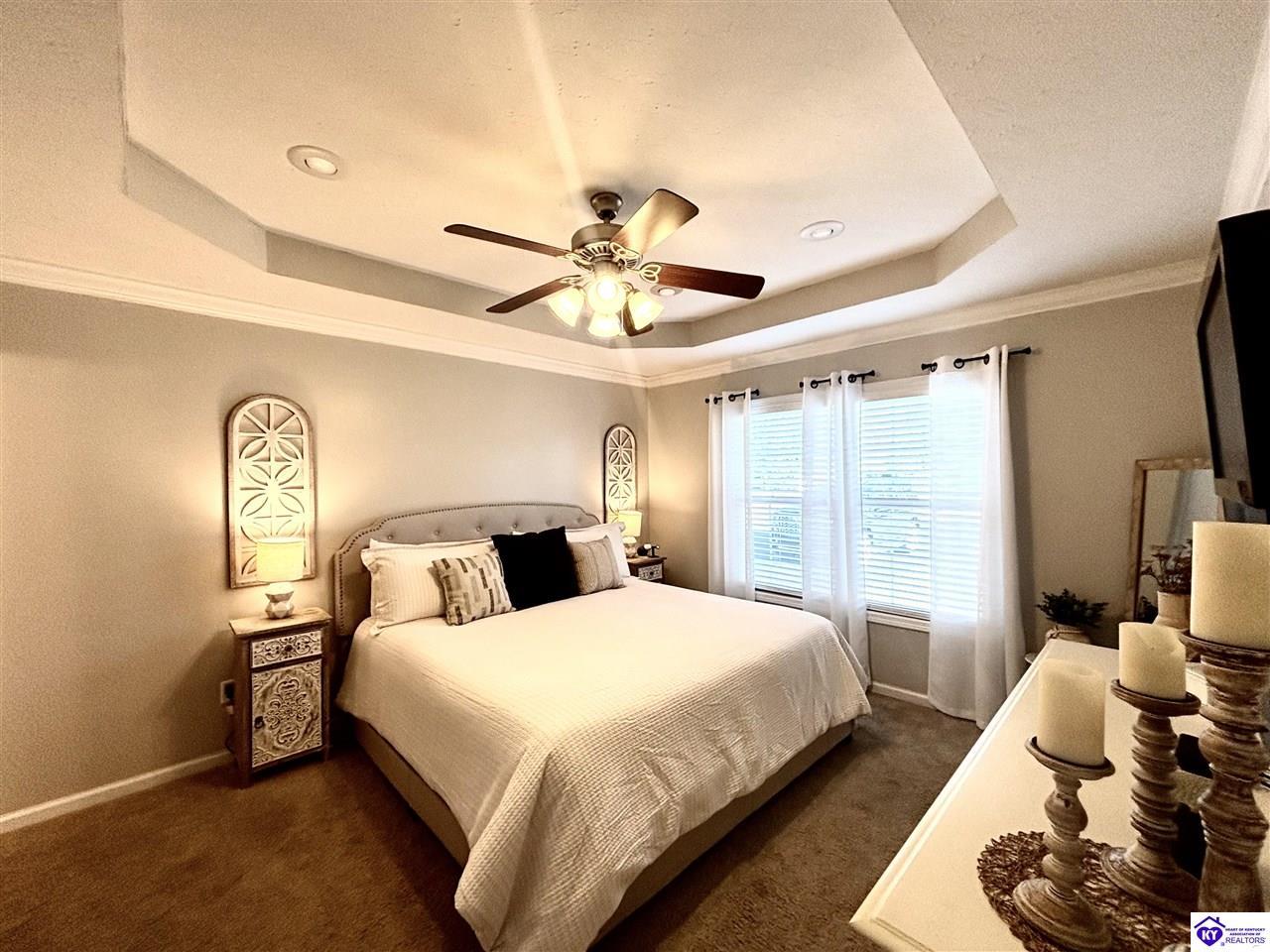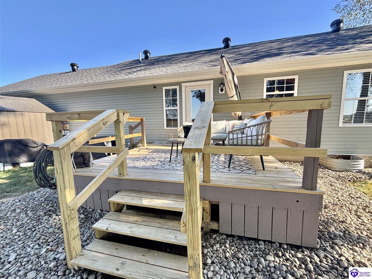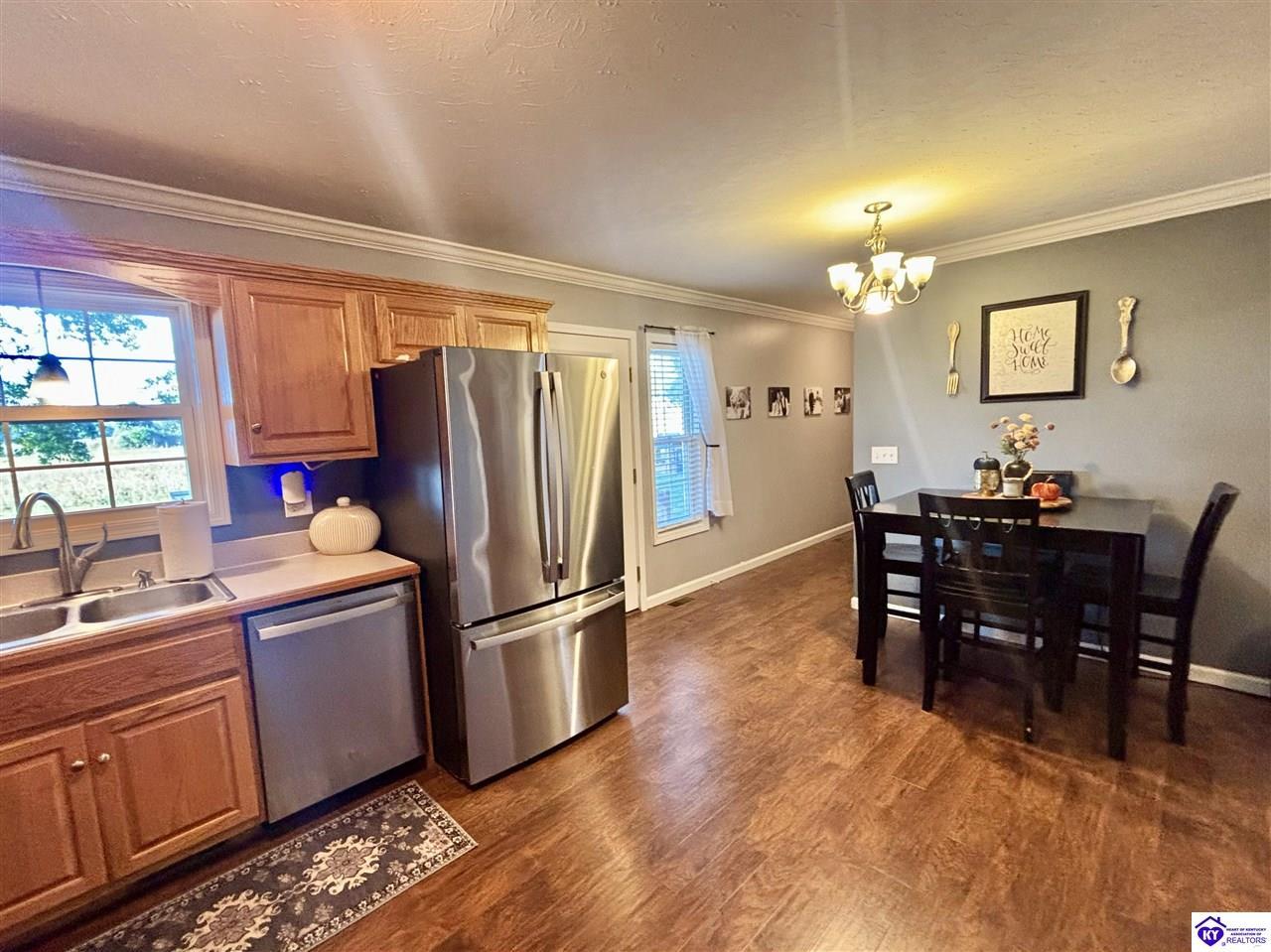 Realtor's notes: ADORABLE HOME! This stunning residence has just been listed on the market. The property boasts numerous desirable features, including a charming covered front porch. Upon entering the home, you'll appreciate the sought-after split floor plan. The main living area showcases beautiful hardwood floors and vaulted ceilings. The exquisite crown molding in the home adds a touch of luxury. The primary suite offers a walk-in closet, tray ceilings, and beautiful crown molding, while the primary bathroom is equally impressive. The expansive kitchen is a focal point, featuring stylish flooring, newer stainless steel appliances, and an osmosis system. The picturesque view from the kitchen window is an added bonus. Two additional bedrooms are conveniently located on the opposite side of the home, split with a full-size bathroom. The rear of the property boasts a newer deck, perfect for relaxation, entertainment, and enjoying the breathtaking sunsets. The yard is generously sized, and the shed remains with the property. Enjoy relaxing moments by the fire pit that STAYS! A two-car garage with an overhead door provides ample parking and storage space. Currently utilized as an exercise room and workshop, the garage offers endless possibilities. Additional features include a Blink security system and two security key locks. SO MUCH TO LOVE! Located in the Heart of Kentucky, this residence is mere miles from Green River Lake and offers convenient access to shopping, restaurants, boutiques, a hospital, and the Campbellsville Country Club. Data believed to be correct but not guaranteed. Buyer to verify data prior to offer.