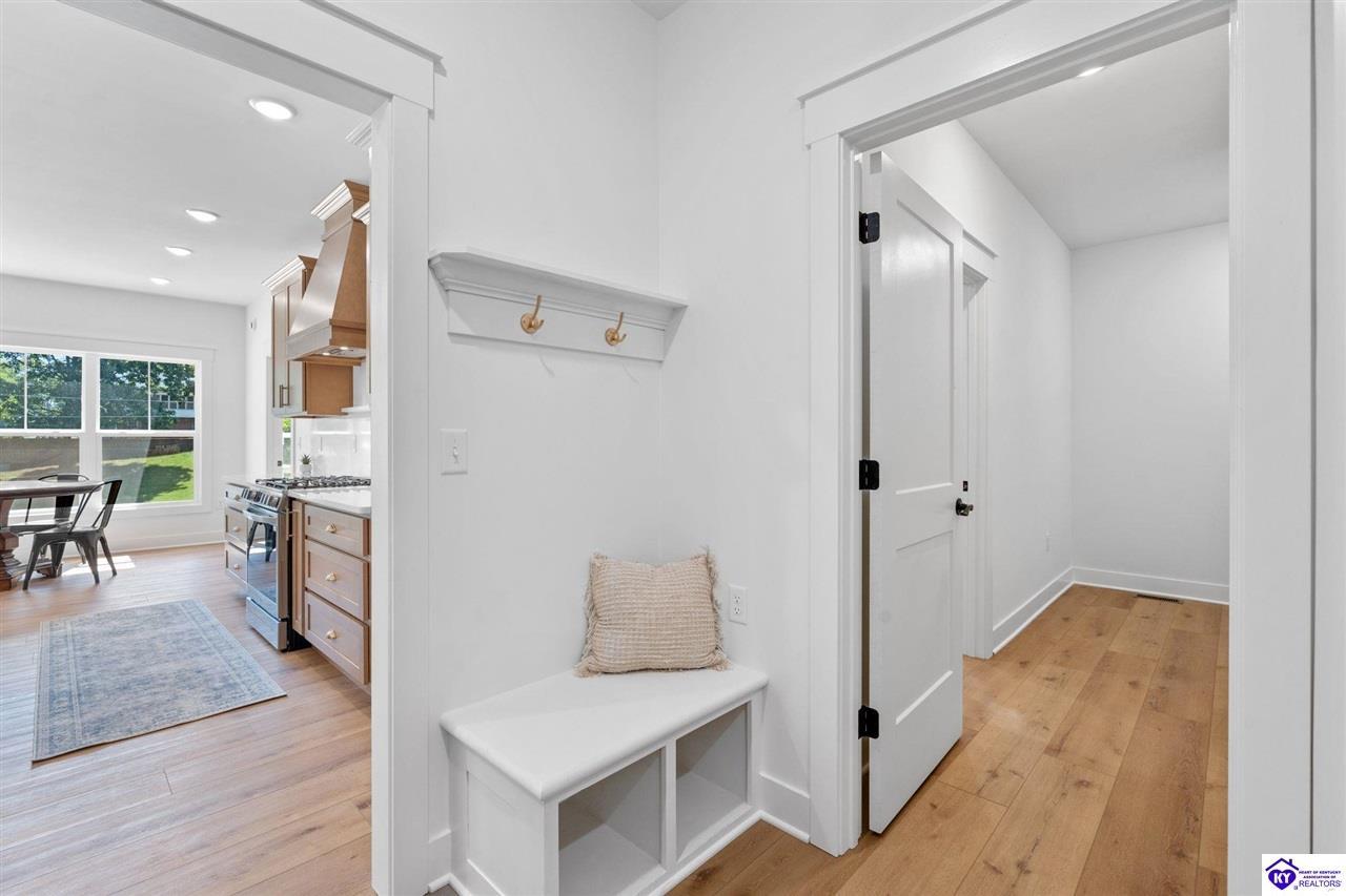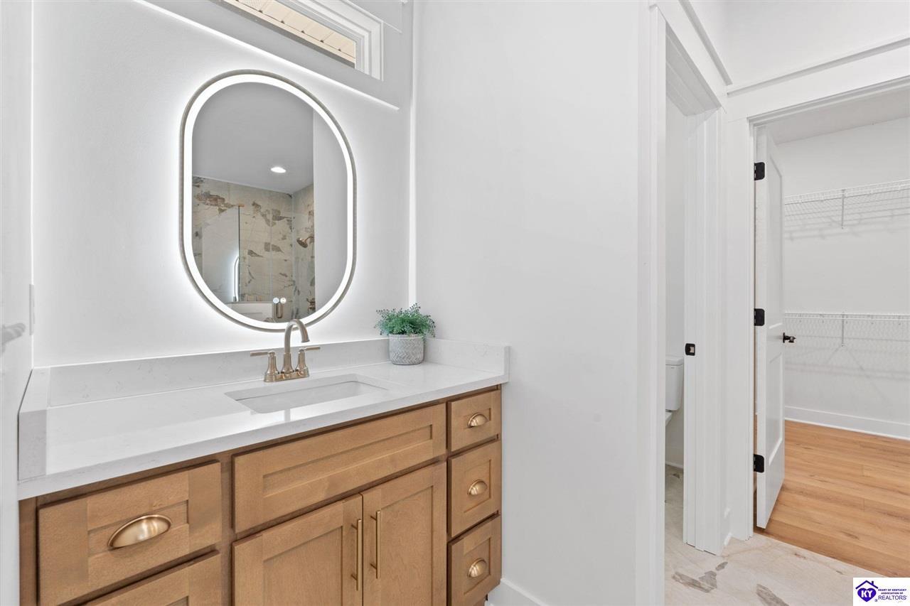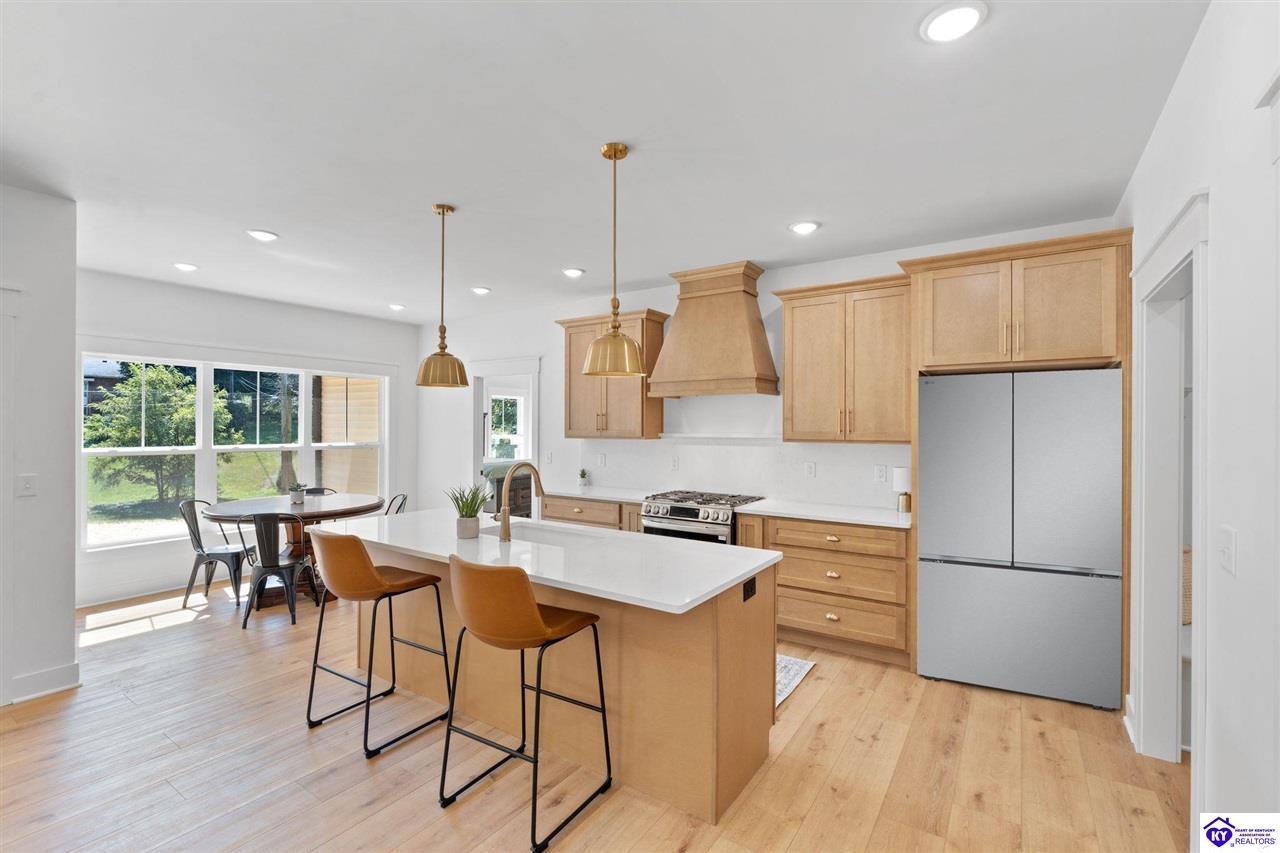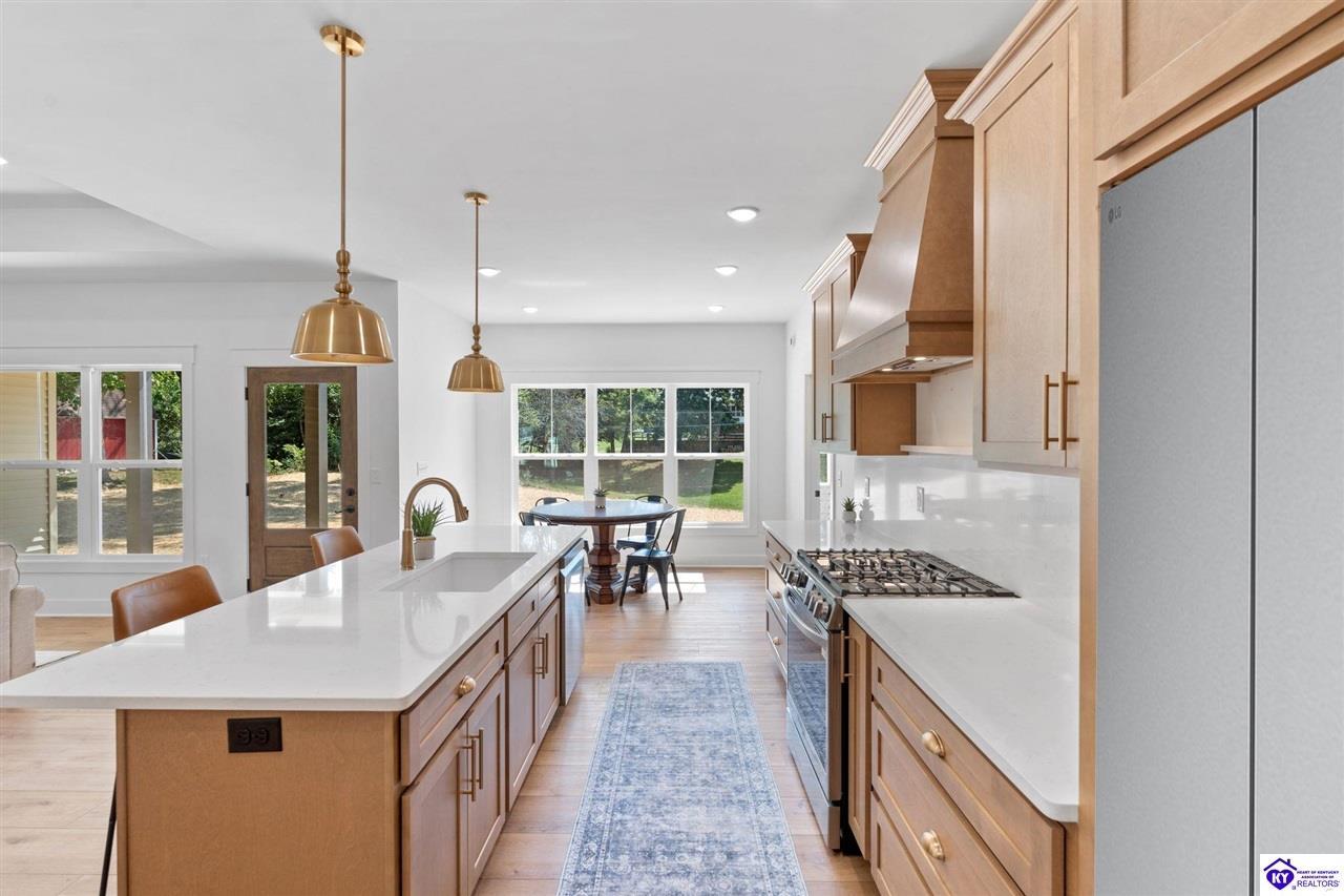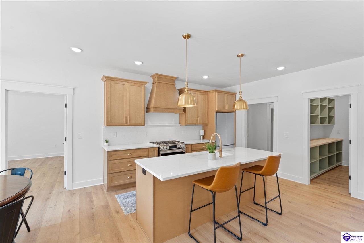 Realtor's notes: Welcome to this stunning, custom-level new construction home offering an elevated lifestyle just minutes from downtown Elizabethtown and the Sports Park. This 4-bedroom, 3-bath residence is thoughtfully designed with an open-concept layout, ideal for modern living and effortless entertaining. The gourmet kitchen features stainless steel appliances, a massive center island, and a walk-in pantry, flowing seamlessly into a sun-drenched living area with expansive windows and natural light throughout. A spacious laundry and mudroom provide everyday convenience, while the main-level primary suite serves as a luxurious retreat with a spa-inspired bath—complete with a walk-in tiled shower, dual vanities, and a private water closet. Two additional main-level bedrooms share a beautifully appointed full bath, while the walkout basement boasts soaring ceilings, a generous family room, and a private fourth bedroom with an additional full bathroom—perfect for guests or multi-generational living. Enjoy serene views from the covered back porch overlooking the flat backyard, and take in the elevated vantage point this home offers from its prime location above Elizabethtown. With a two-car garage and exceptional craftsmanship throughout, this home is the perfect blend of luxury, comfort, and convenience.