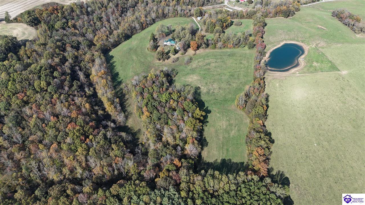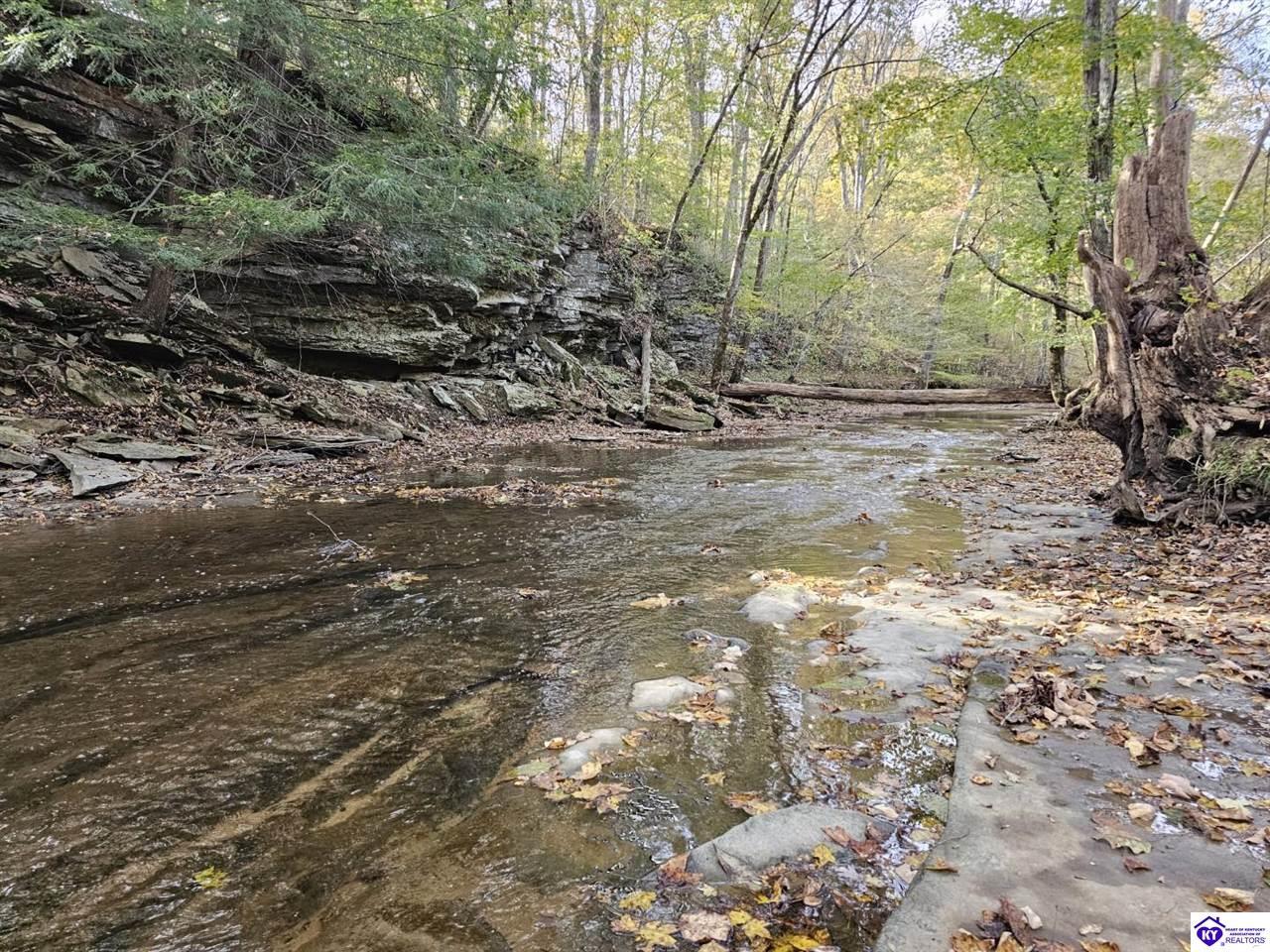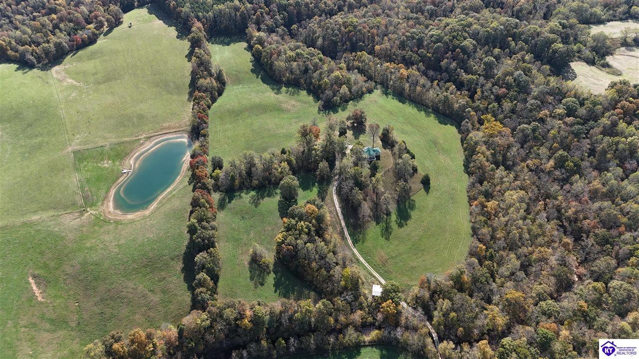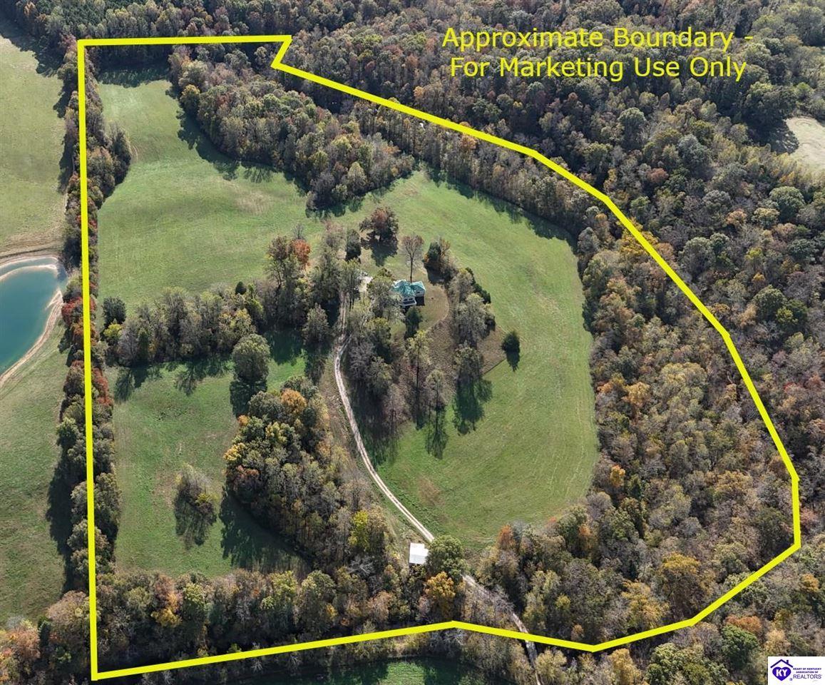 Realtor's notes: WELCOME TO PARADISE!!! LOG HOME ON NEARLY 40 ACRES WITH 1/2 MILE FRONTAGE ON LITTLE BRUSH CREEK! This secluded 2,300 square-foot log home with basement is constructed of logs from the Daniel Boone National Forest. The home boasts custom hickory flooring throughout, two suites with full baths, and large great room with woodstove. The home is in the center of the property with wonderful views from the extensive porches and decking to enjoy outdoor living. Enjoy your own personal retreat with seclusion, quiet, and privacy! Go play in Little Brush Creek and set up a great hunting property with ABUNDANT wildlife. This home is ready for a new owner to make their dreams a reality. New HVAC units were installed in 2024. The land is mixed woodland with gently rolling and level open land, ready for you to set up your own farm if desired. Log homes and land tracts at this price point are scarce; DON'T MISS OUT! Property is approximately 45 minutes from Elizabethtown, 30 minutes from Hodgenville, and 25 minutes from Campbellsville. Professional photos coming soon.