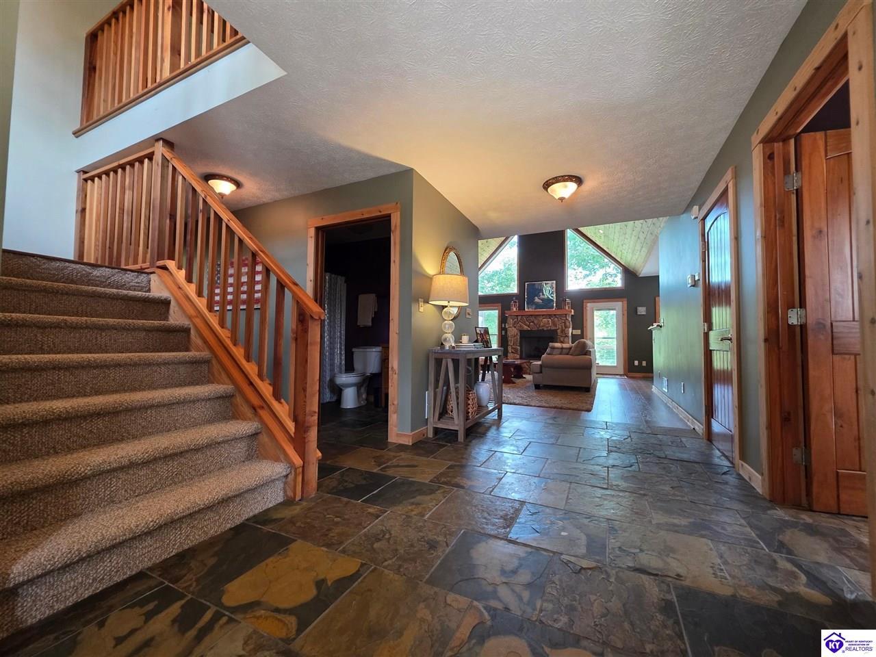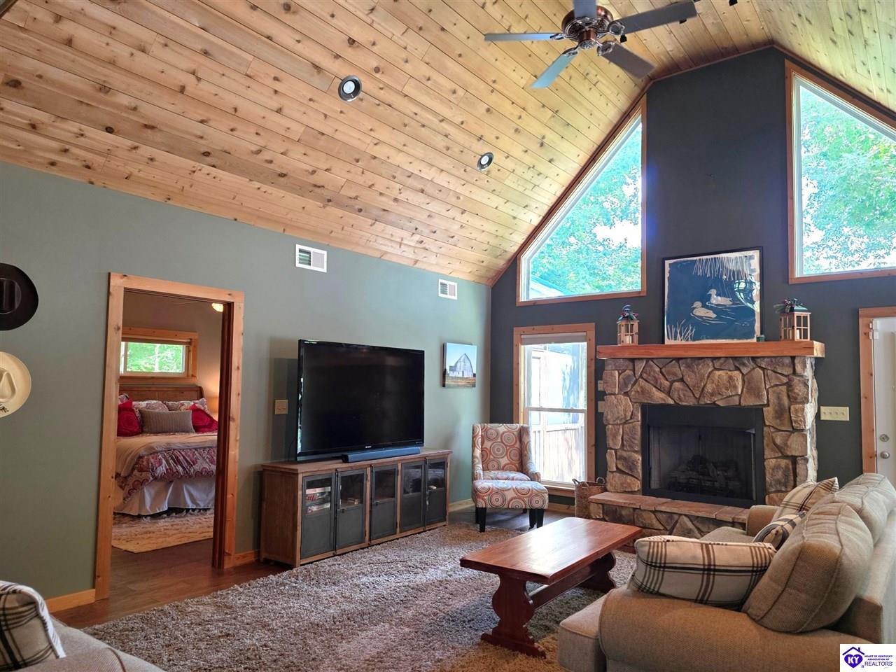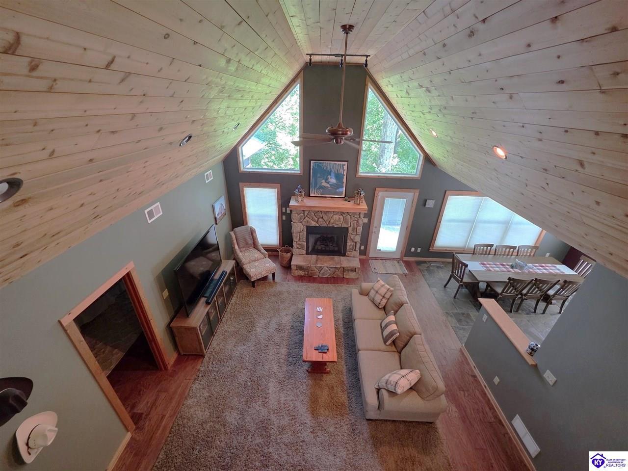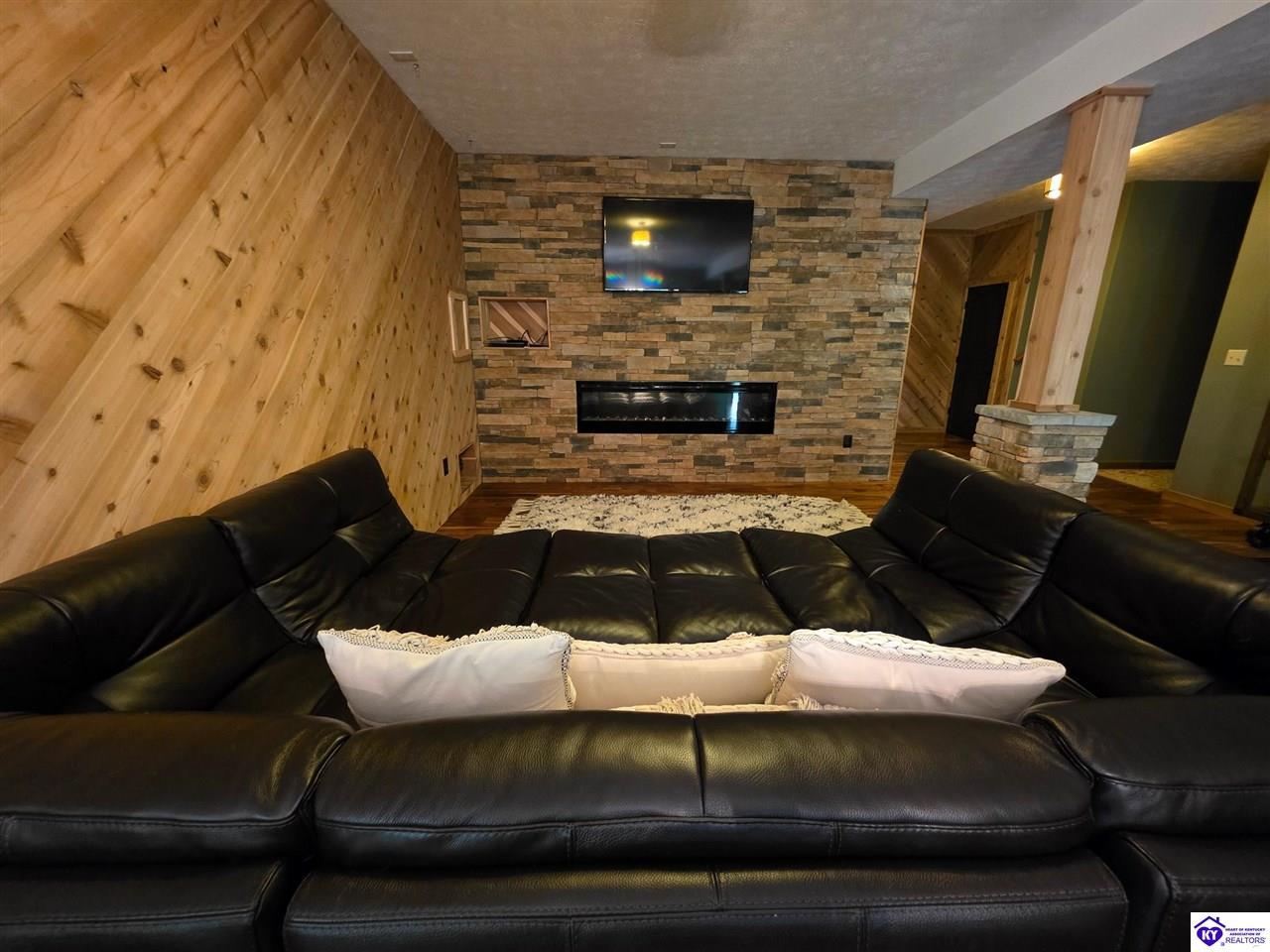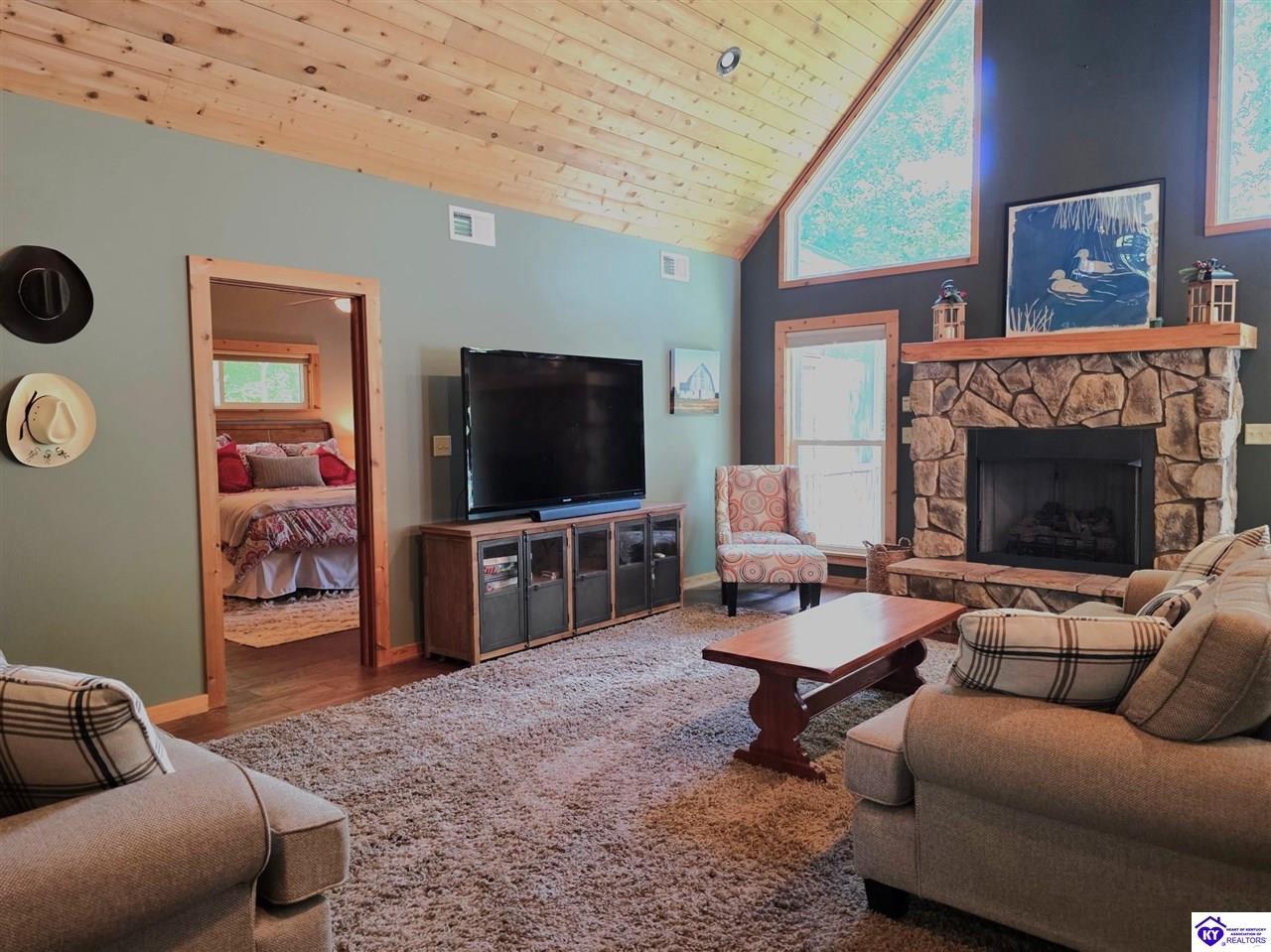 Realtor's notes: Discover the charm of this stunning waterfront home, perfectly situated on two lots with two docks at the bottom of the property. This residence offers a blend of modern amenities and cozy living spaces, making it an ideal retreat for families and friends. 4 bedrooms and a 5th sleeping area or multi-purpose room - and TONS of parking, you can bring your family and friends and still have some privacy! Multiple decks let you spread out there too! TWO waterfront lots, TWO docks (one with 2 jet ski ports that stay!) Furniture is available too! Located in a beautiful neighborhood near two ramps, this home is in the middle of everything by land and by water. The super chill location on a cove off Long Lick Creek is perfect for kayaking, floating, or sunbathing on the docks. Step inside and be instantly greeted by cozy, warm colors that blend perfectly with the natural setting of this lake home. Just off the large foyer is a guest bedroom, full bath, stairs to the loft sleeping area AND catch your first glimpse of that beautiful great room! This open-concept living area is where you'll find that BIG, stone fireplace as the centerpiece of the lake-side wall. Beautiful stone floors help to set the mood for living at the lake! The great room opens up to the main living areas, providing a spacious and inviting atmosphere. With lots of sleeping areas and tons of parking options, there's plenty of room for everyone! There's even room for a large camper or RV in the detached, multipurpose shed! Adjacent to the fireplace is a crowd-sized dining area with a window wall and adjoining kitchen. The custom kitchen comes with tons of cabinets and upgrades, making it a chef's dream! The main level laundry is conveniently located near the outdoors, adding to the home's practicality. The primary bedroom suite on the main level includes a bath with heated floors, a tile shower, and a vintage-style tub. There's also a screen porch off the primary bedroom for morning coffee or afternoon naps. The lower level features a family area with an electric fireplace that changes colors, a dining or card table, and another lounging area to relax. The bunk room on this level comfortably sleeps eight, and there's another sleeping area or multi-purpose room that's plumbed for a future bar. Storage is abundant both inside and outside the home, including a huge RV-sized shed with tall overhead doors that let you drive THROUGH the building!
