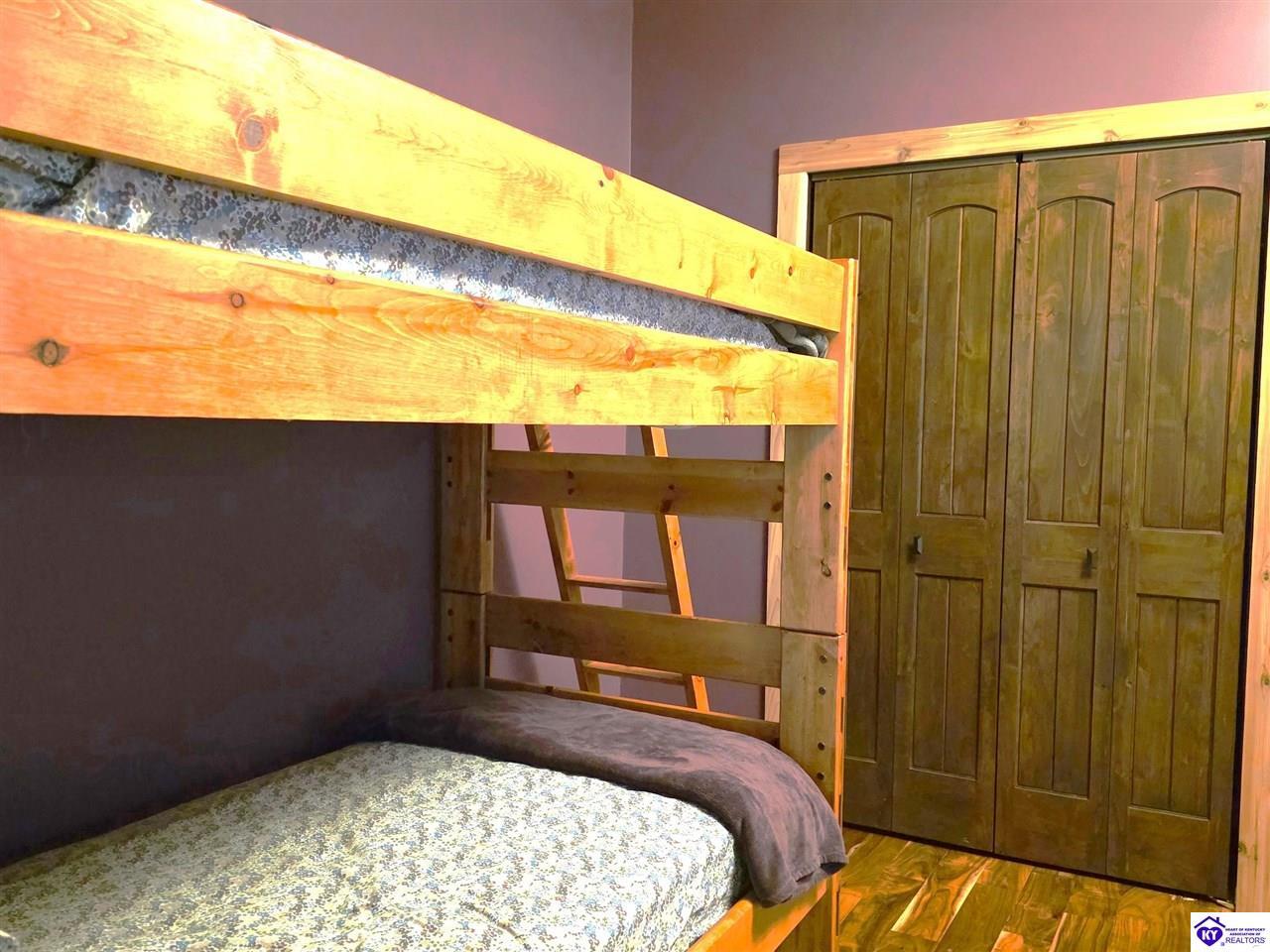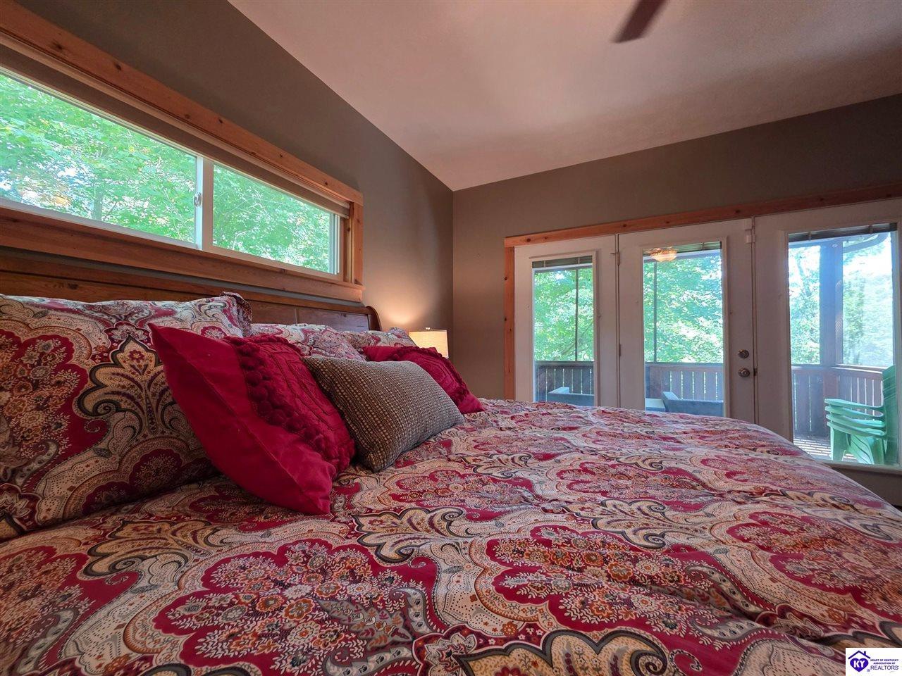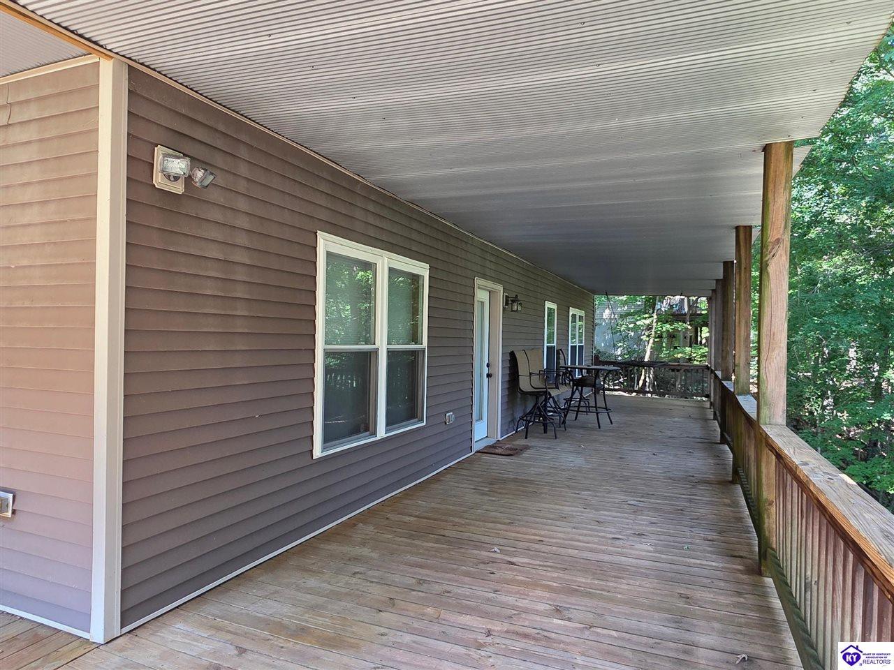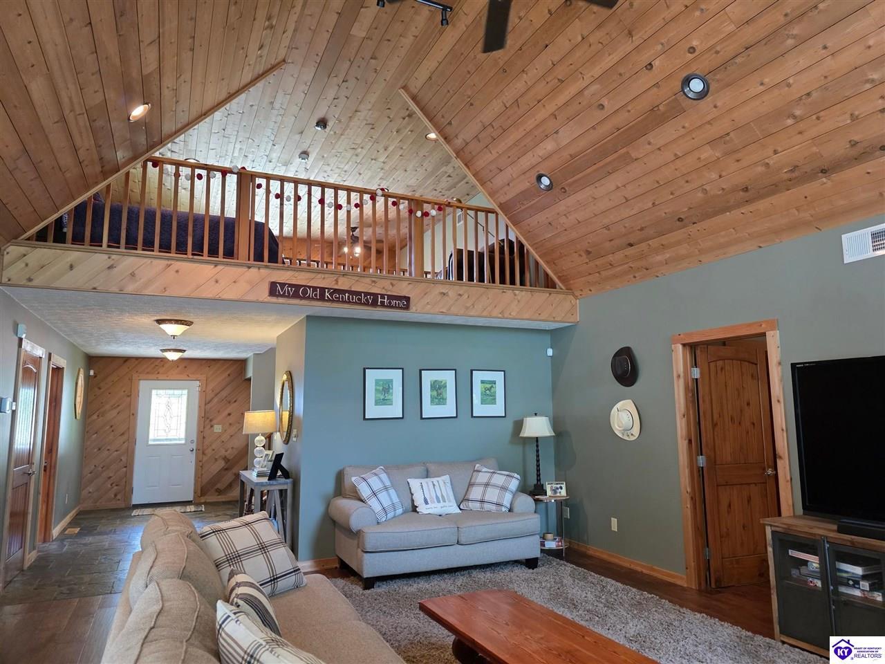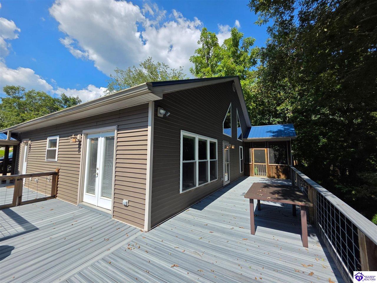 Realtor's notes: Discover the charm of this stunning waterfront home, perfectly situated on two lots with two docks at the bottom of the property. This residence offers a blend of modern amenities and cozy living spaces, making it an ideal retreat for families and friends. 4 bedrooms and a 5th sleeping area or multi-purpose room - and TONS of parking, you can bring your family and friends and still have some privacy! Multiple decks let you spread out there too! TWO waterfront lots, TWO docks (one with 2 jet ski ports that stay!) Furniture is available too! Located in a beautiful neighborhood near two ramps, this home is in the middle of everything by land and by water. The super chill location on a cove off Long Lick Creek is perfect for kayaking, floating, or sunbathing on the docks. Step inside and be instantly greeted by cozy, warm colors that blend perfectly with the natural setting of this lake home. Just off the large foyer is a guest bedroom, full bath, stairs to the loft sleeping area AND catch your first glimpse of that beautiful great room! This open-concept living area is where you'll find that BIG, stone fireplace as the centerpiece of the lake-side wall. Beautiful stone floors help to set the mood for living at the lake! The great room opens up to the main living areas, providing a spacious and inviting atmosphere. With lots of sleeping areas and tons of parking options, there's plenty of room for everyone! There's even room for a large camper or RV in the detached, multipurpose shed! Adjacent to the fireplace is a crowd-sized dining area with a window wall and adjoining kitchen. The custom kitchen comes with tons of cabinets and upgrades, making it a chef's dream! The main level laundry is conveniently located near the outdoors, adding to the home's practicality. The primary bedroom suite on the main level includes a bath with heated floors, a tile shower, and a vintage-style tub. There's also a screen porch off the primary bedroom for morning coffee or afternoon naps. The lower level features a family area with an electric fireplace that changes colors, a dining or card table, and another lounging area to relax. The bunk room on this level comfortably sleeps eight, and there's another sleeping area or multi-purpose room that's plumbed for a future bar. Storage is abundant both inside and outside the home, including a huge RV-sized shed with tall overhead doors that let you drive THROUGH the building!