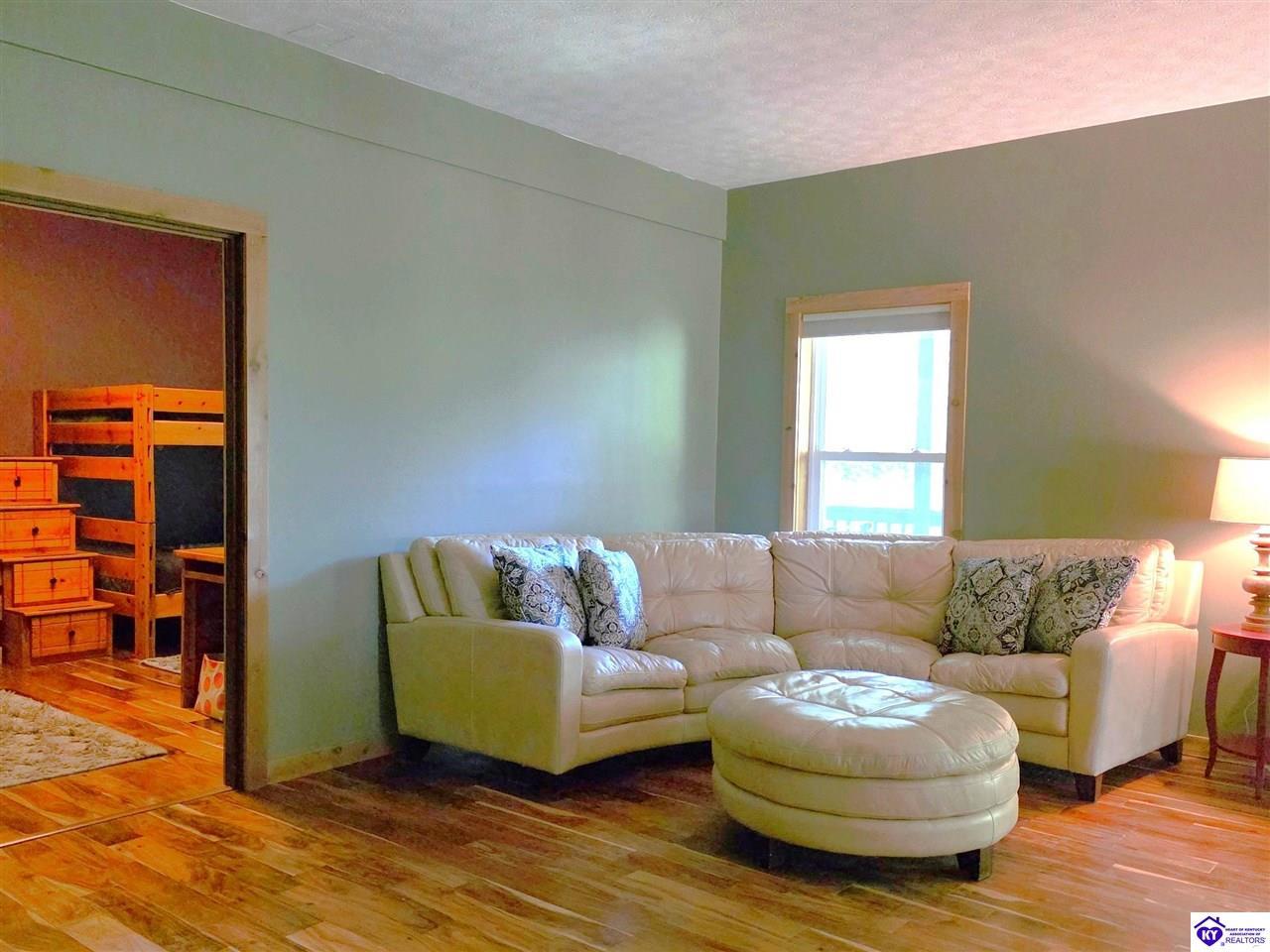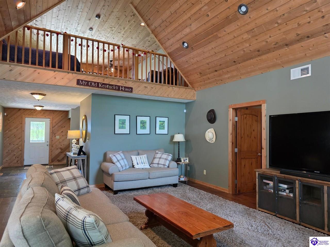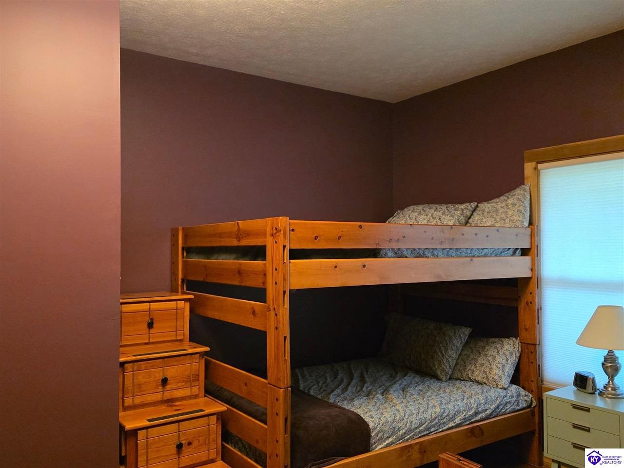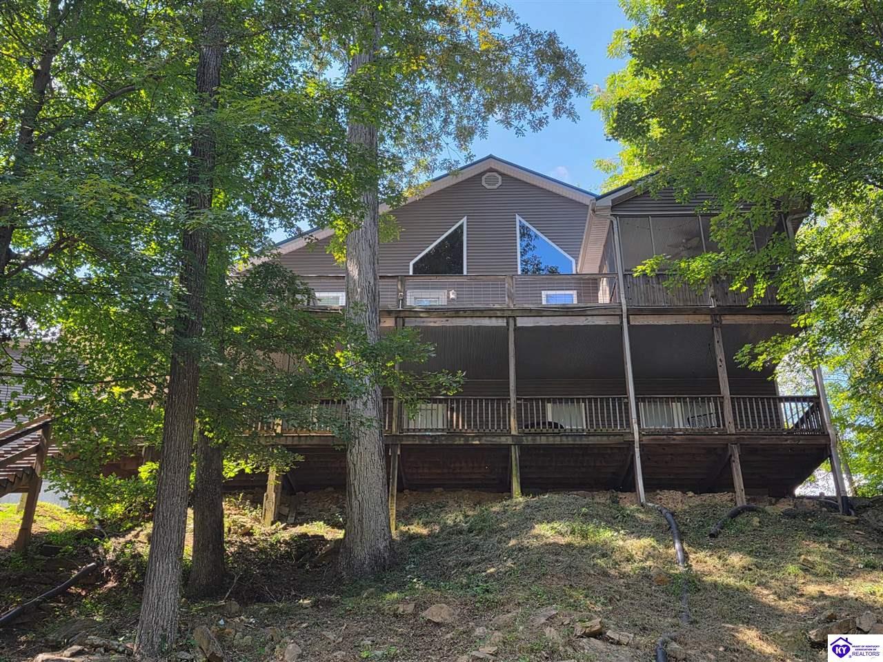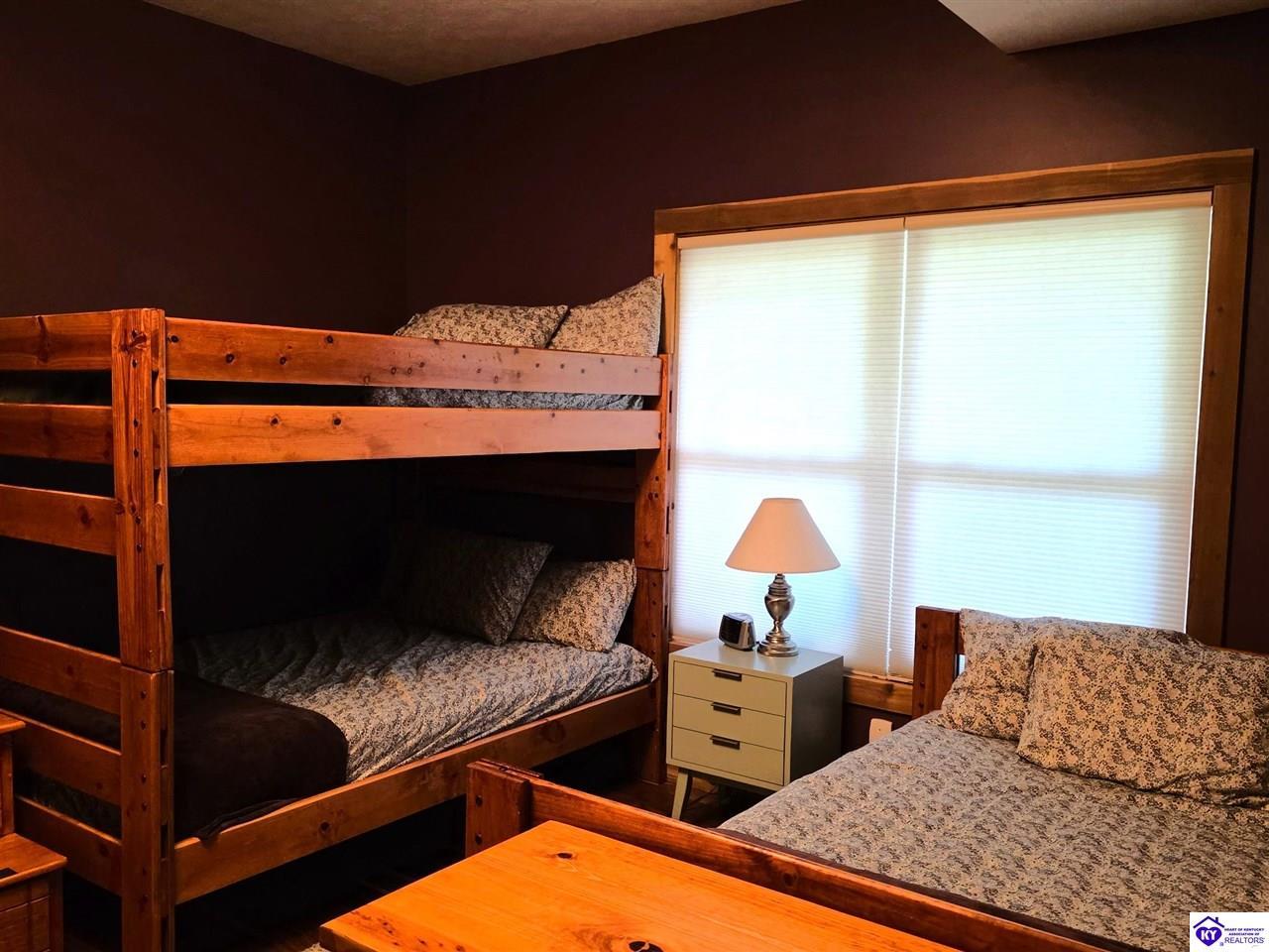 Realtor's notes: Discover the charm of this stunning waterfront home, perfectly situated on two lots with two docks at the bottom of the property. This residence offers a blend of modern amenities and cozy living spaces, making it an ideal retreat for families and friends. 4 bedrooms and a 5th sleeping area or multi-purpose room - and TONS of parking, you can bring your family and friends and still have some privacy! Multiple decks let you spread out there too! TWO waterfront lots, TWO docks (one with 2 jet ski ports that stay!) Furniture is available too! Located in a beautiful neighborhood near two ramps, this home is in the middle of everything by land and by water. The super chill location on a cove off Long Lick Creek is perfect for kayaking, floating, or sunbathing on the docks. Step inside and be instantly greeted by cozy, warm colors that blend perfectly with the natural setting of this lake home. Just off the large foyer is a guest bedroom, full bath, stairs to the loft sleeping area AND catch your first glimpse of that beautiful great room! This open-concept living area is where you'll find that BIG, stone fireplace as the centerpiece of the lake-side wall. Beautiful stone floors help to set the mood for living at the lake! The great room opens up to the main living areas, providing a spacious and inviting atmosphere. With lots of sleeping areas and tons of parking options, there's plenty of room for everyone! There's even room for a large camper or RV in the detached, multipurpose shed! Adjacent to the fireplace is a crowd-sized dining area with a window wall and adjoining kitchen. The custom kitchen comes with tons of cabinets and upgrades, making it a chef's dream! The main level laundry is conveniently located near the outdoors, adding to the home's practicality. The primary bedroom suite on the main level includes a bath with heated floors, a tile shower, and a vintage-style tub. There's also a screen porch off the primary bedroom for morning coffee or afternoon naps. The lower level features a family area with an electric fireplace that changes colors, a dining or card table, and another lounging area to relax. The bunk room on this level comfortably sleeps eight, and there's another sleeping area or multi-purpose room that's plumbed for a future bar. Storage is abundant both inside and outside the home, including a huge RV-sized shed with tall overhead doors that let you drive THROUGH the building!