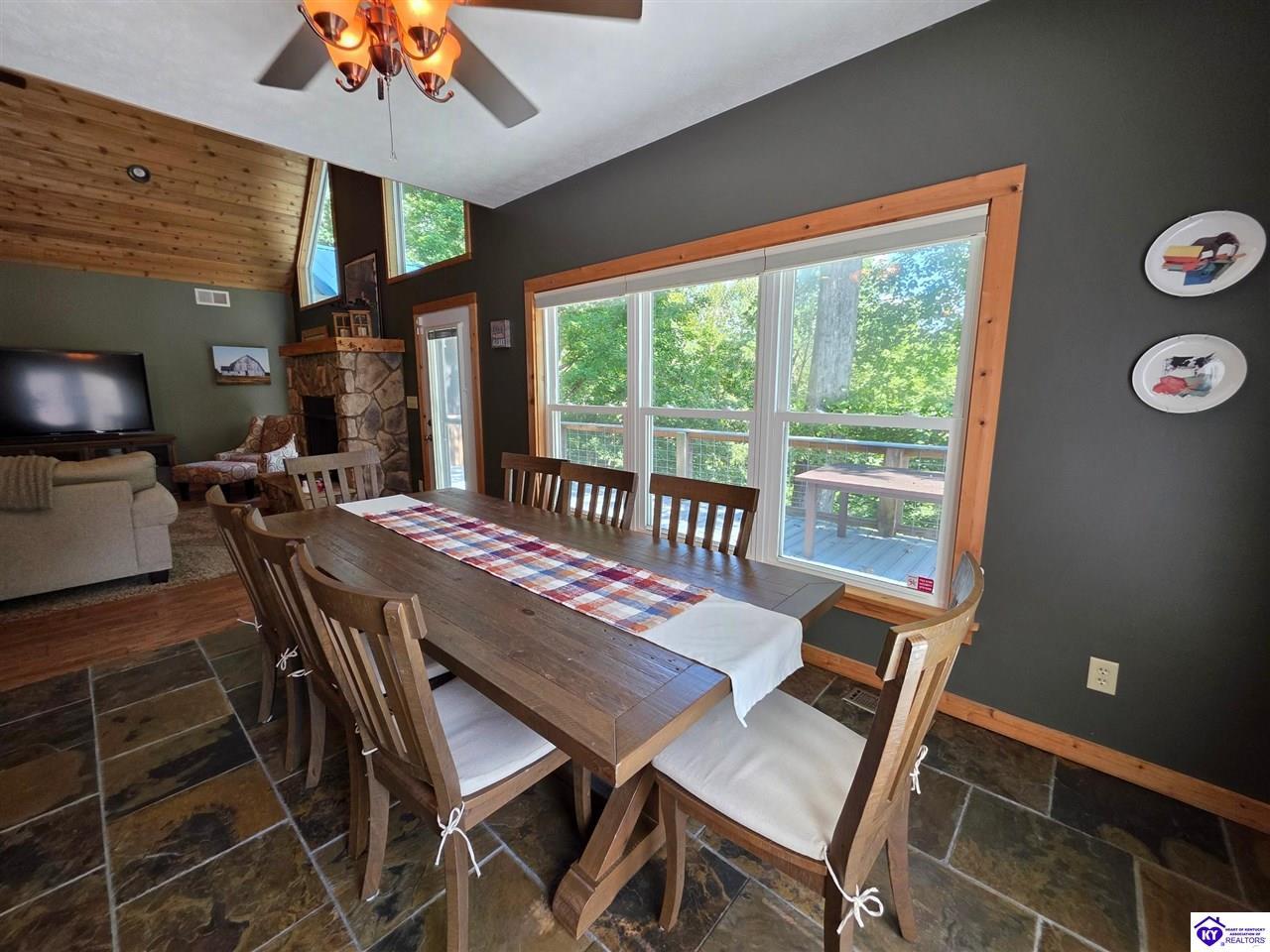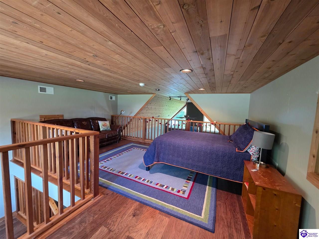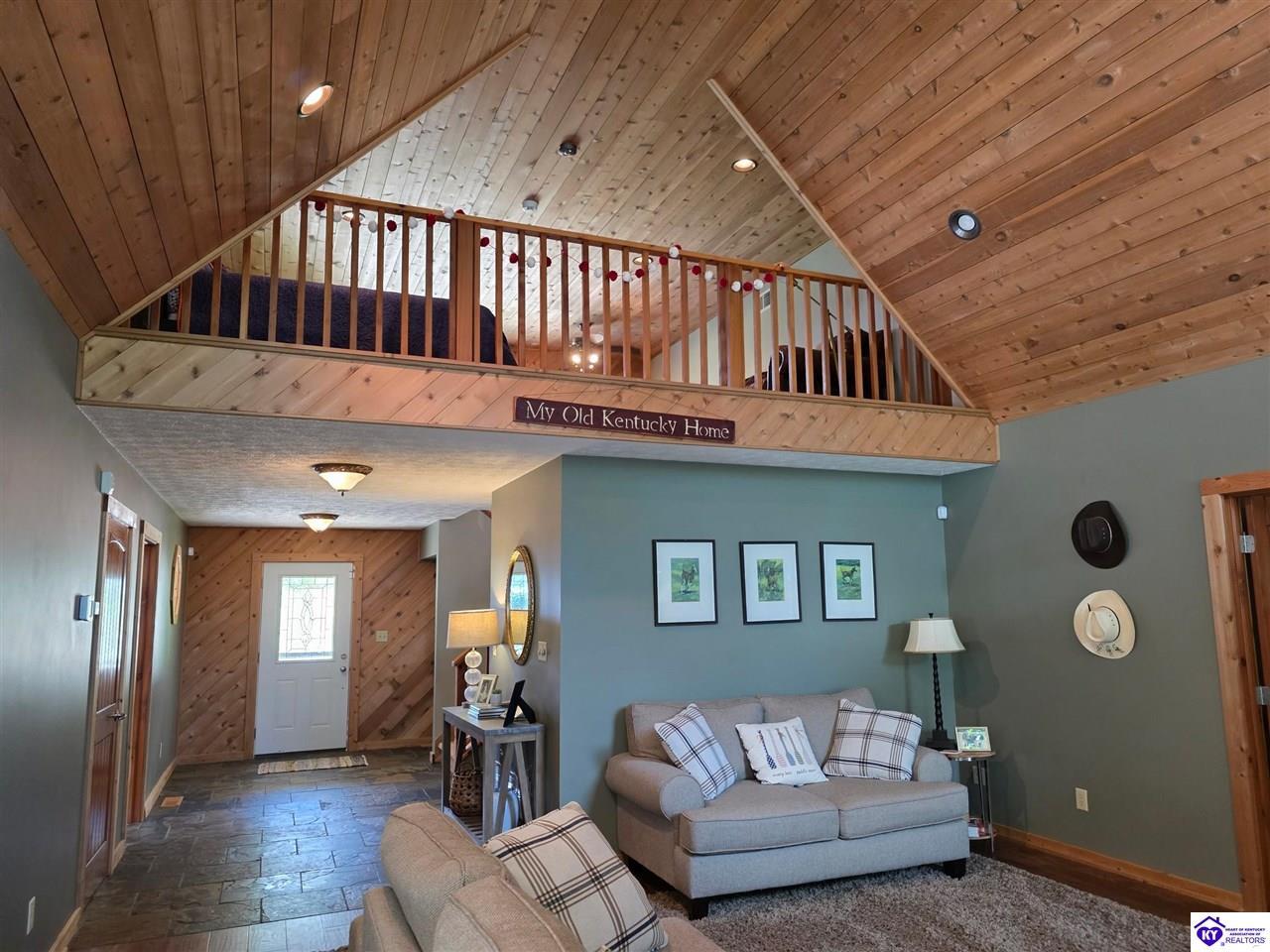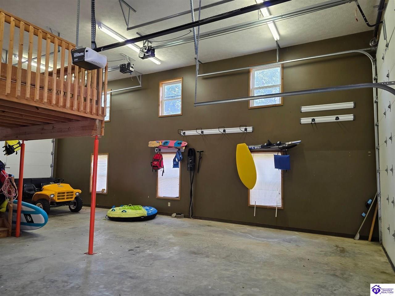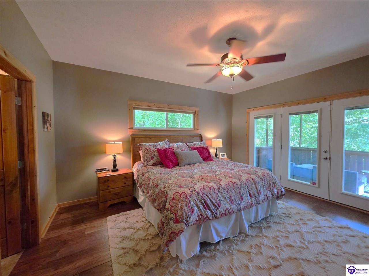 Realtor's notes: Discover the charm of this stunning waterfront home, perfectly situated on two lots with two docks at the bottom of the property. This residence offers a blend of modern amenities and cozy living spaces, making it an ideal retreat for families and friends. 4 bedrooms and a 5th sleeping area or multi-purpose room - and TONS of parking, you can bring your family and friends and still have some privacy! Multiple decks let you spread out there too! TWO waterfront lots, TWO docks (one with 2 jet ski ports that stay!) Furniture is available too! Located in a beautiful neighborhood near two ramps, this home is in the middle of everything by land and by water. The super chill location on a cove off Long Lick Creek is perfect for kayaking, floating, or sunbathing on the docks. Step inside and be instantly greeted by cozy, warm colors that blend perfectly with the natural setting of this lake home. Just off the large foyer is a guest bedroom, full bath, stairs to the loft sleeping area AND catch your first glimpse of that beautiful great room! This open-concept living area is where you'll find that BIG, stone fireplace as the centerpiece of the lake-side wall. Beautiful stone floors help to set the mood for living at the lake! The great room opens up to the main living areas, providing a spacious and inviting atmosphere. With lots of sleeping areas and tons of parking options, there's plenty of room for everyone! There's even room for a large camper or RV in the detached, multipurpose shed! Adjacent to the fireplace is a crowd-sized dining area with a window wall and adjoining kitchen. The custom kitchen comes with tons of cabinets and upgrades, making it a chef's dream! The main level laundry is conveniently located near the outdoors, adding to the home's practicality. The primary bedroom suite on the main level includes a bath with heated floors, a tile shower, and a vintage-style tub. There's also a screen porch off the primary bedroom for morning coffee or afternoon naps. The lower level features a family area with an electric fireplace that changes colors, a dining or card table, and another lounging area to relax. The bunk room on this level comfortably sleeps eight, and there's another sleeping area or multi-purpose room that's plumbed for a future bar. Storage is abundant both inside and outside the home, including a huge RV-sized shed with tall overhead doors that let you drive THROUGH the building!