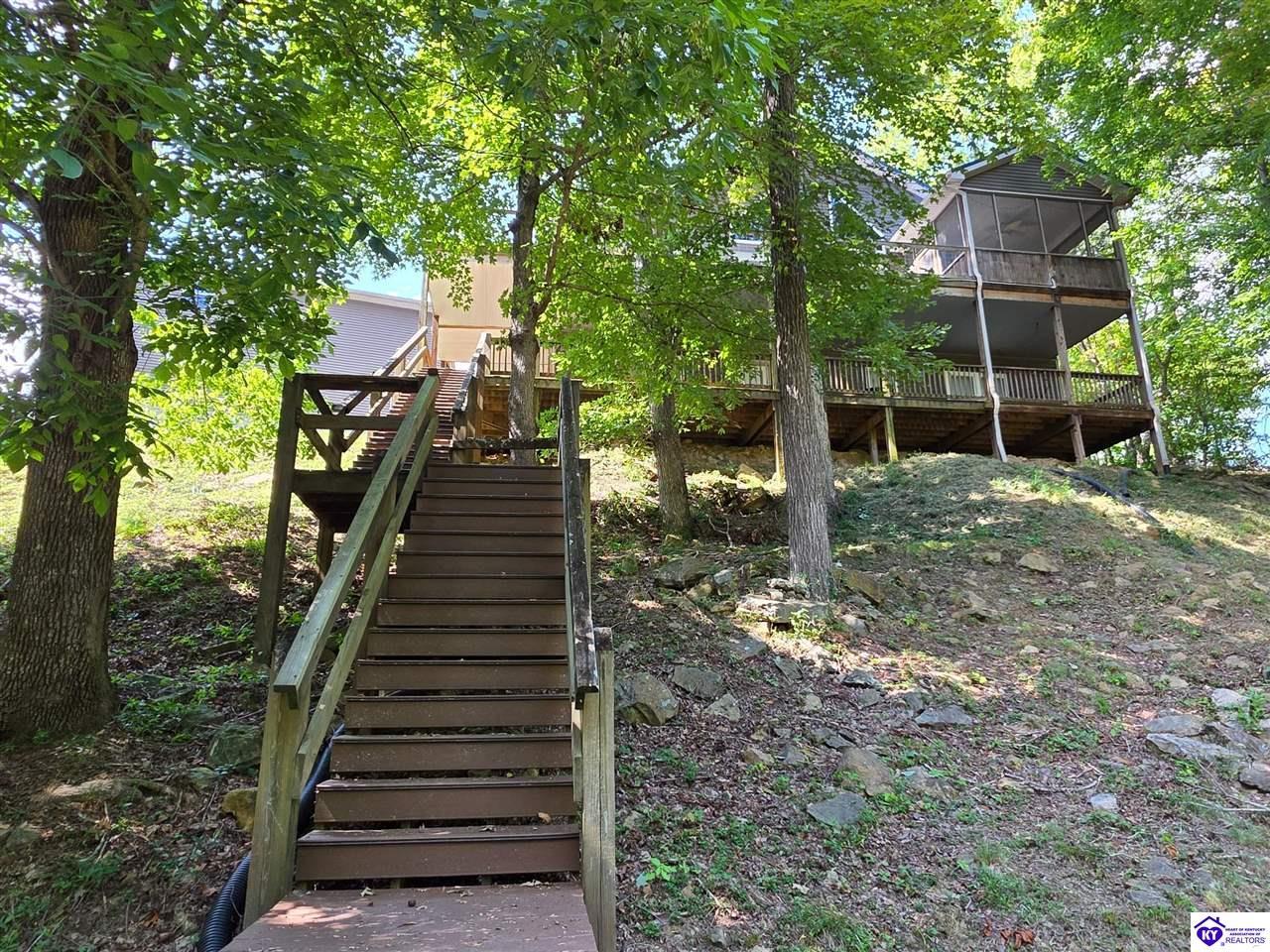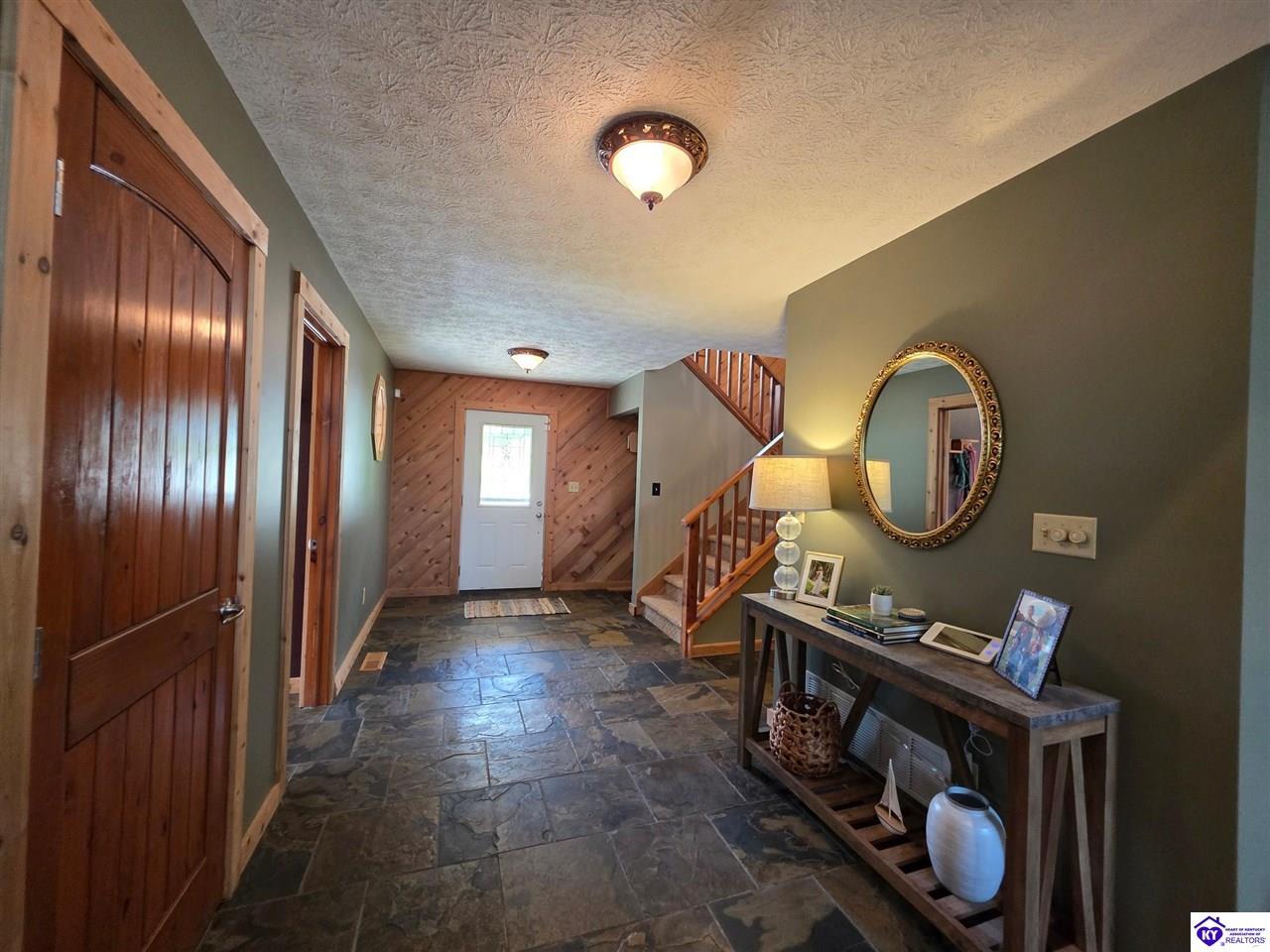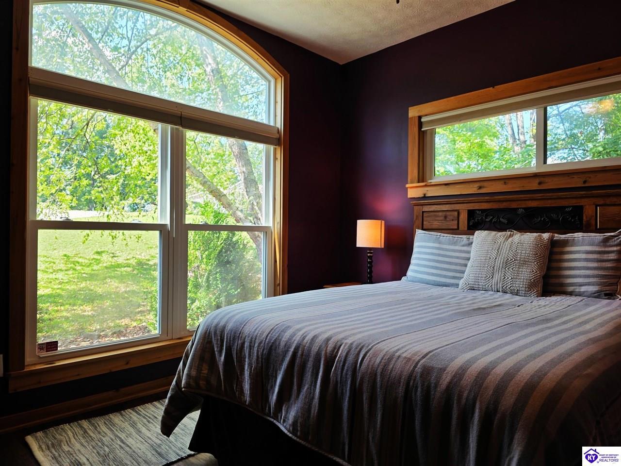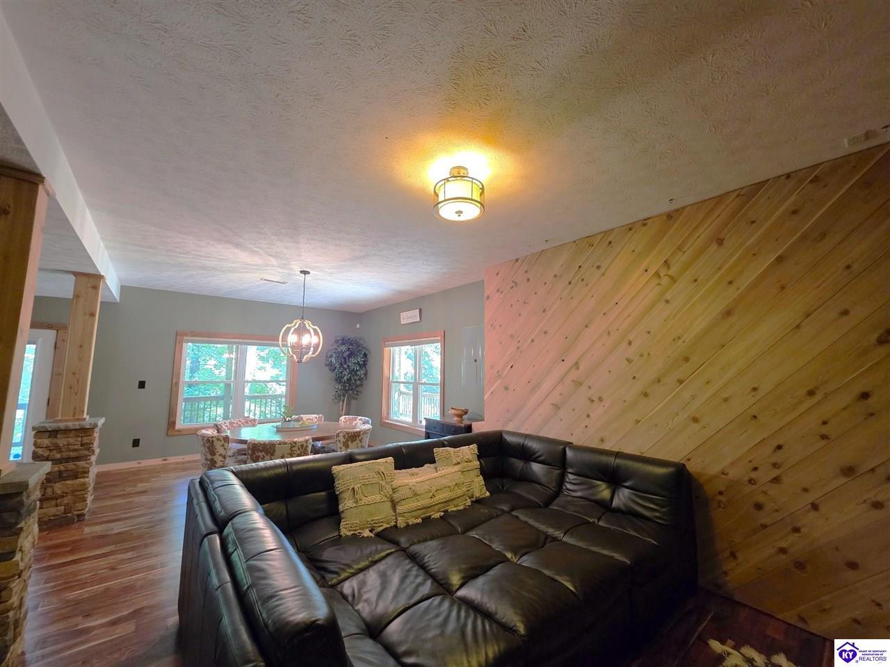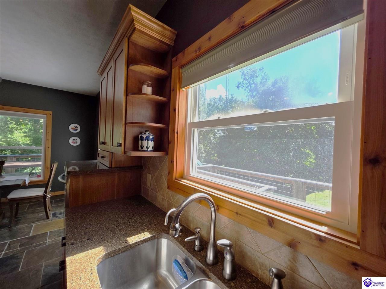 Realtor's notes: Discover the charm of this stunning waterfront home, perfectly situated on two lots with two docks at the bottom of the property. This residence offers a blend of modern amenities and cozy living spaces, making it an ideal retreat for families and friends. 4 bedrooms and a 5th sleeping area or multi-purpose room - and TONS of parking, you can bring your family and friends and still have some privacy! Multiple decks let you spread out there too! TWO waterfront lots, TWO docks (one with 2 jet ski ports that stay!) Furniture is available too! Located in a beautiful neighborhood near two ramps, this home is in the middle of everything by land and by water. The super chill location on a cove off Long Lick Creek is perfect for kayaking, floating, or sunbathing on the docks. Step inside and be instantly greeted by cozy, warm colors that blend perfectly with the natural setting of this lake home. Just off the large foyer is a guest bedroom, full bath, stairs to the loft sleeping area AND catch your first glimpse of that beautiful great room! This open-concept living area is where you'll find that BIG, stone fireplace as the centerpiece of the lake-side wall. Beautiful stone floors help to set the mood for living at the lake! The great room opens up to the main living areas, providing a spacious and inviting atmosphere. With lots of sleeping areas and tons of parking options, there's plenty of room for everyone! There's even room for a large camper or RV in the detached, multipurpose shed! Adjacent to the fireplace is a crowd-sized dining area with a window wall and adjoining kitchen. The custom kitchen comes with tons of cabinets and upgrades, making it a chef's dream! The main level laundry is conveniently located near the outdoors, adding to the home's practicality. The primary bedroom suite on the main level includes a bath with heated floors, a tile shower, and a vintage-style tub. There's also a screen porch off the primary bedroom for morning coffee or afternoon naps. The lower level features a family area with an electric fireplace that changes colors, a dining or card table, and another lounging area to relax. The bunk room on this level comfortably sleeps eight, and there's another sleeping area or multi-purpose room that's plumbed for a future bar. Storage is abundant both inside and outside the home, including a huge RV-sized shed with tall overhead doors that let you drive THROUGH the building!