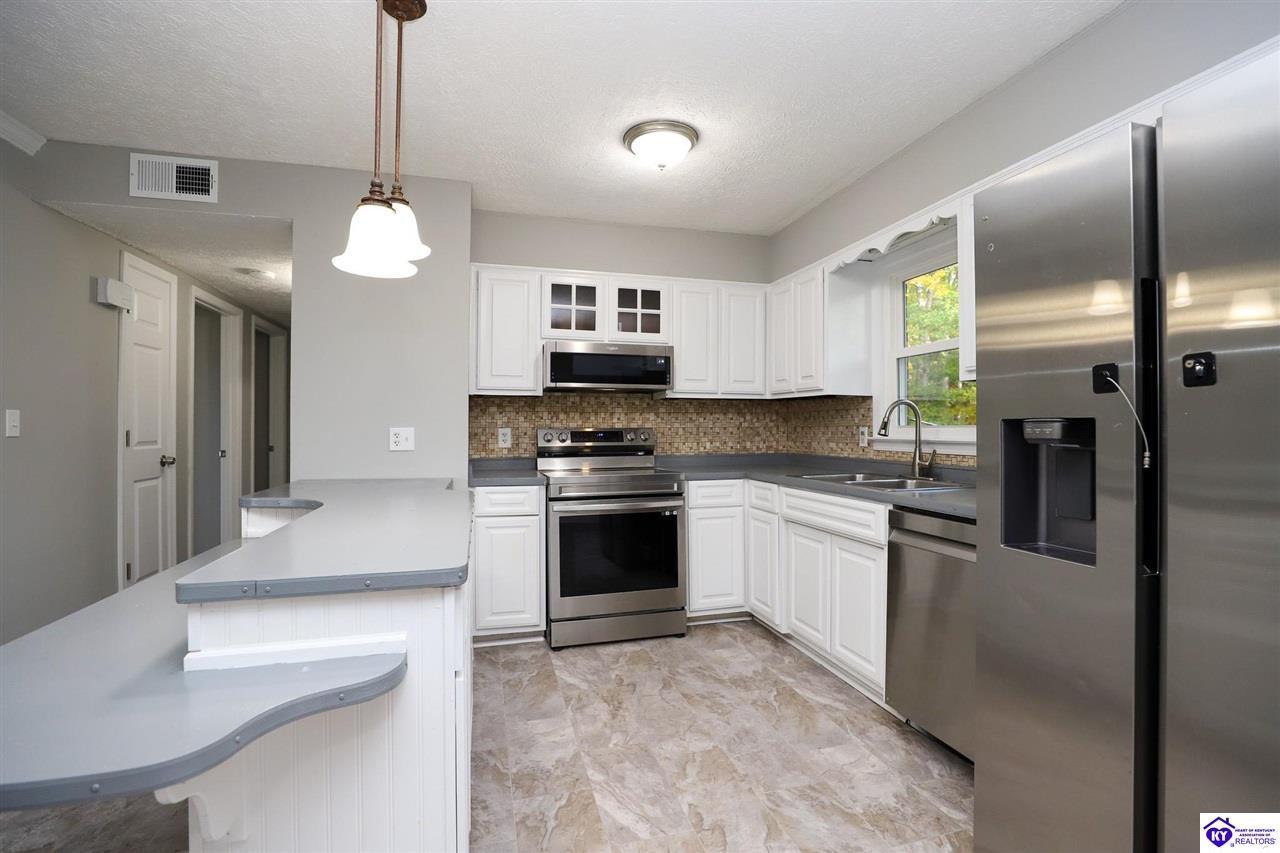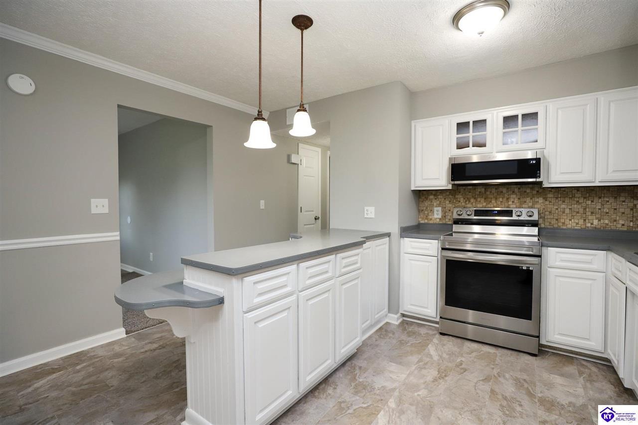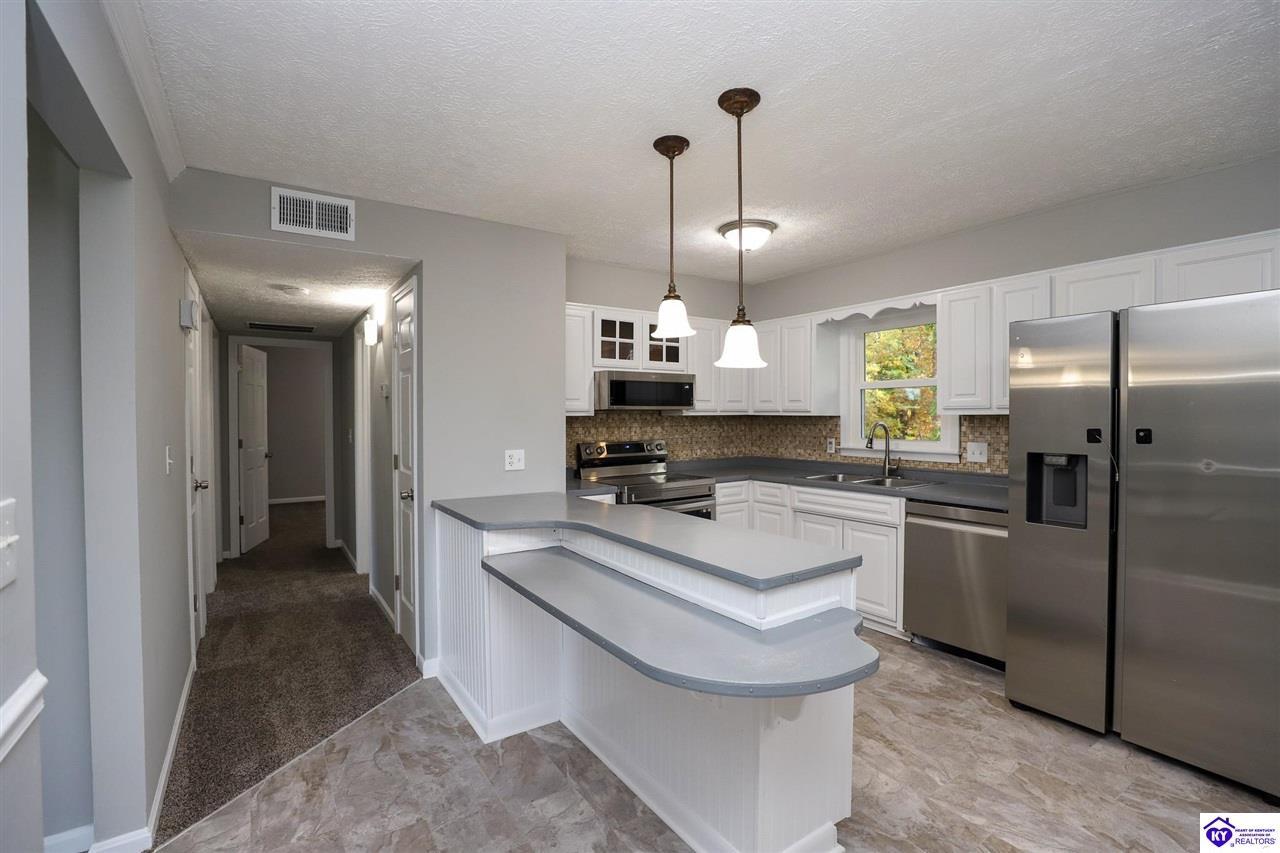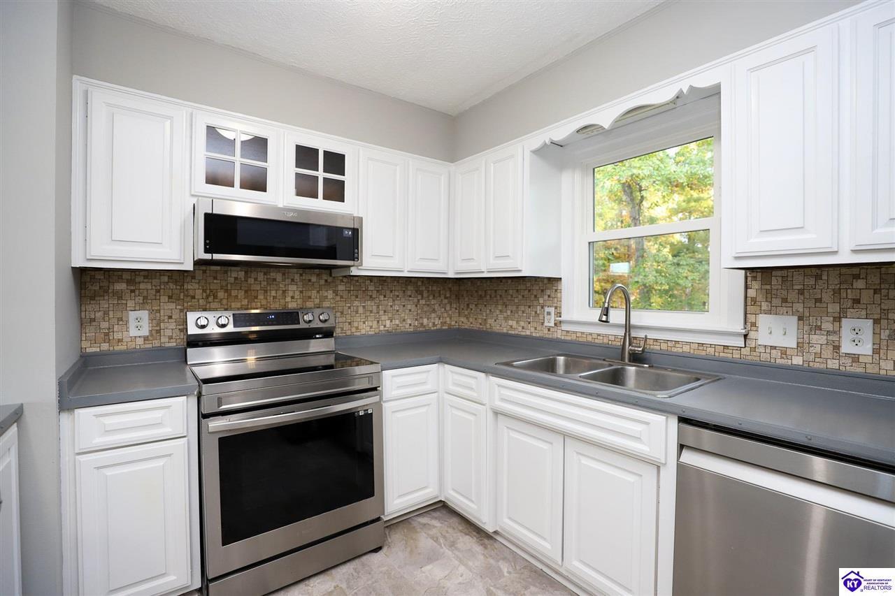 Realtor's notes: This remodeled brick home offers the perfect blend of comfort and character on a scenic wooded lot that provides natural privacy and tranquil views from your deck. Step inside to discover beautifully updated new flooring throughout, creating a fresh and welcoming atmosphere that flows seamlessly from room to room. The heart of this home is its spacious kitchen, complete with a convenient island that serves as both a gathering spot for morning coffee and an ideal workspace for culinary adventures. The kitchen is fully equipped with a full appliance package, whether you're preparing a quick breakfast or hosting a dinner party, this kitchen has the space and functionality to handle it all. With three well-appointed bedrooms and one and a half bathrooms, there's comfortable space for the whole family. The updated bathroom features a double vanity and stylish tile surround in the tub shower area, adding both practicality and modern appeal to your daily routine. The fully finished walk-out basement provides excellent additional living space, perfect for a family room, home office, or recreational area. This versatile space opens directly to the outdoors, creating wonderful indoor-outdoor living opportunities. Outside, you'll appreciate the covered front porch while taking in the peaceful wooded surroundings. Additional features include a 2-car garage, plush landscaping and a sought-after location in the back of the neighborhood. Located in Elizabethtown, this property offers easy access to I-65 and local amenities while maintaining that desired sense of privacy and natural beauty. This home combines practical updates with timeless charm, creating a wonderful place to call home.