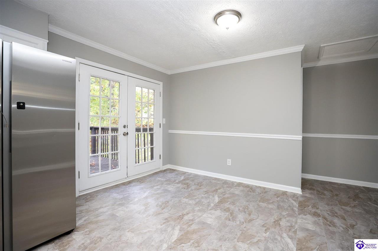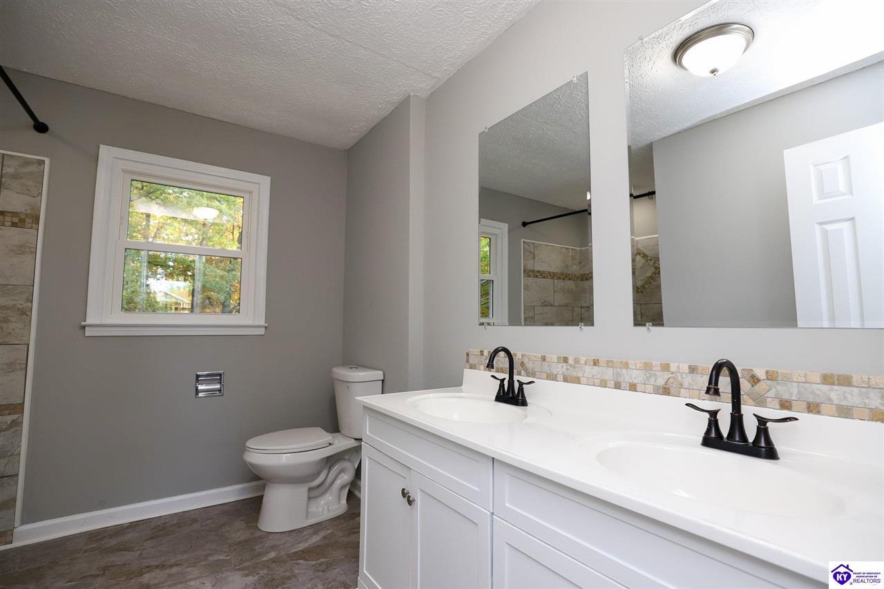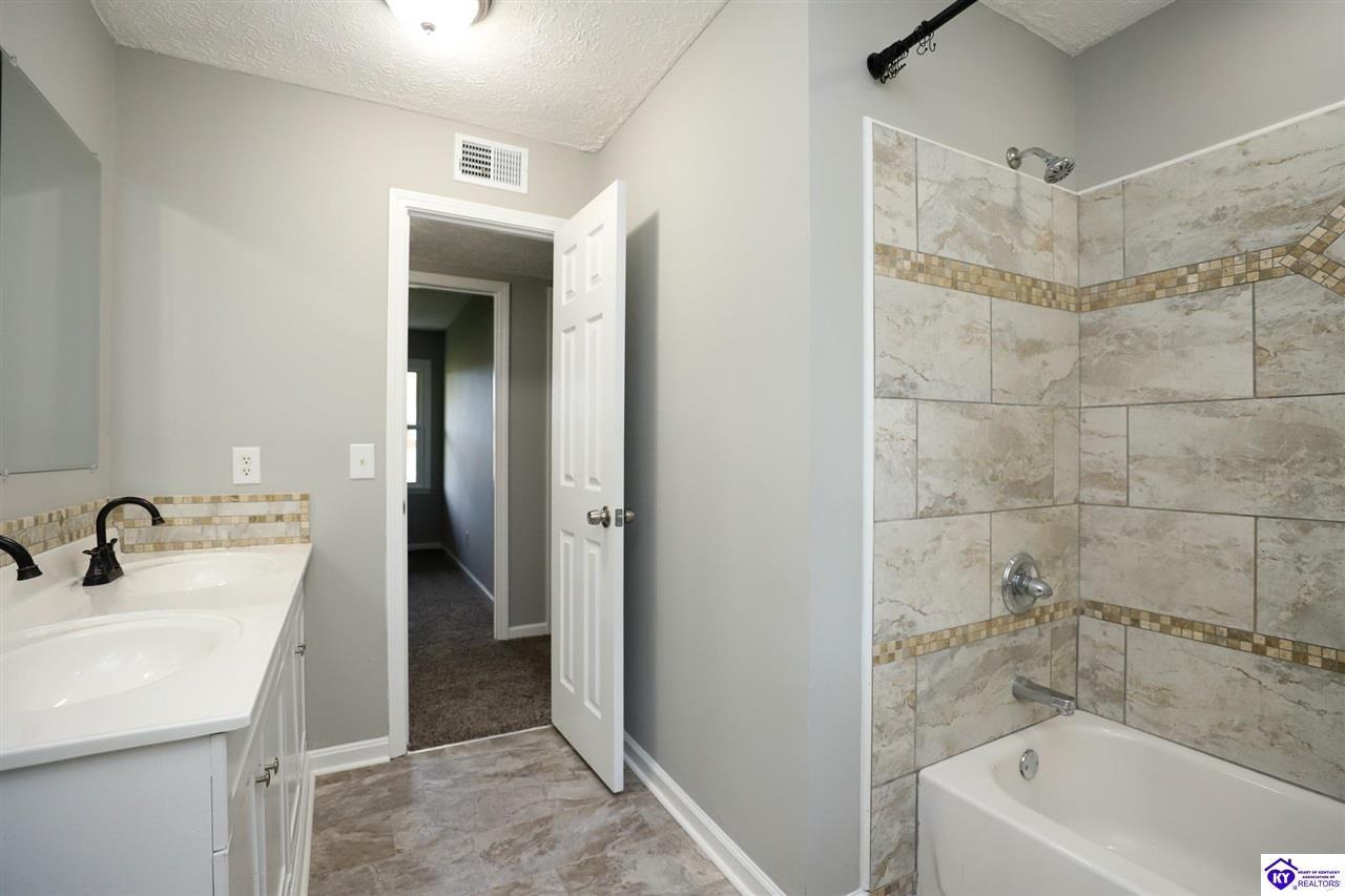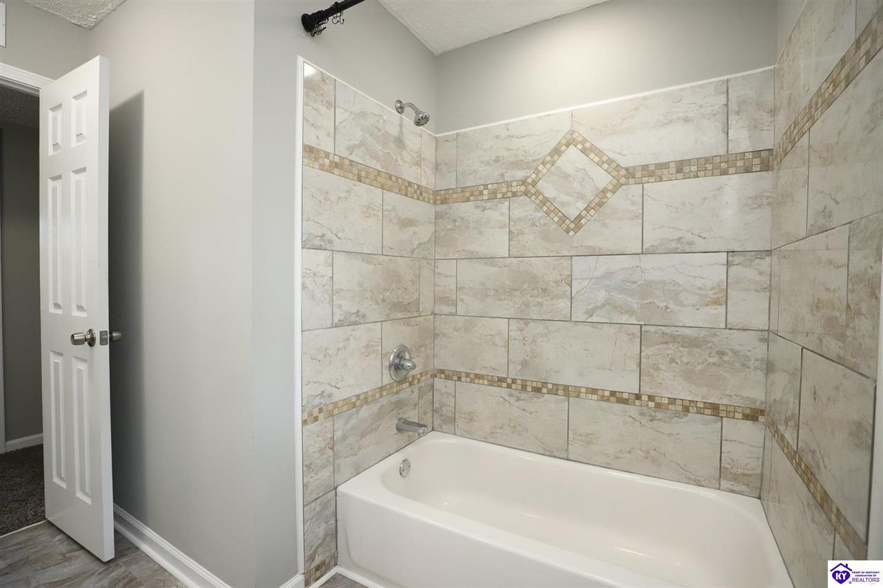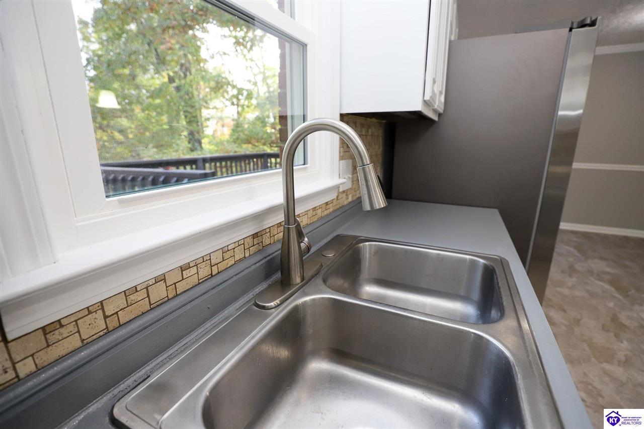 Realtor's notes: This remodeled brick home offers the perfect blend of comfort and character on a scenic wooded lot that provides natural privacy and tranquil views from your deck. Step inside to discover beautifully updated new flooring throughout, creating a fresh and welcoming atmosphere that flows seamlessly from room to room. The heart of this home is its spacious kitchen, complete with a convenient island that serves as both a gathering spot for morning coffee and an ideal workspace for culinary adventures. The kitchen is fully equipped with a full appliance package, whether you're preparing a quick breakfast or hosting a dinner party, this kitchen has the space and functionality to handle it all. With three well-appointed bedrooms and one and a half bathrooms, there's comfortable space for the whole family. The updated bathroom features a double vanity and stylish tile surround in the tub shower area, adding both practicality and modern appeal to your daily routine. The fully finished walk-out basement provides excellent additional living space, perfect for a family room, home office, or recreational area. This versatile space opens directly to the outdoors, creating wonderful indoor-outdoor living opportunities. Outside, you'll appreciate the covered front porch while taking in the peaceful wooded surroundings. Additional features include a 2-car garage, plush landscaping and a sought-after location in the back of the neighborhood. Located in Elizabethtown, this property offers easy access to I-65 and local amenities while maintaining that desired sense of privacy and natural beauty. This home combines practical updates with timeless charm, creating a wonderful place to call home.