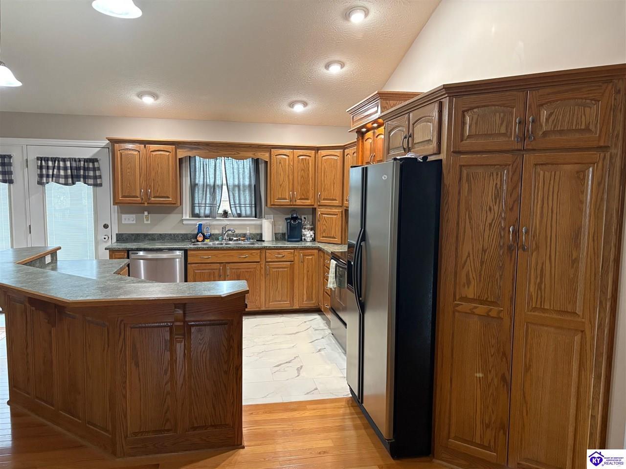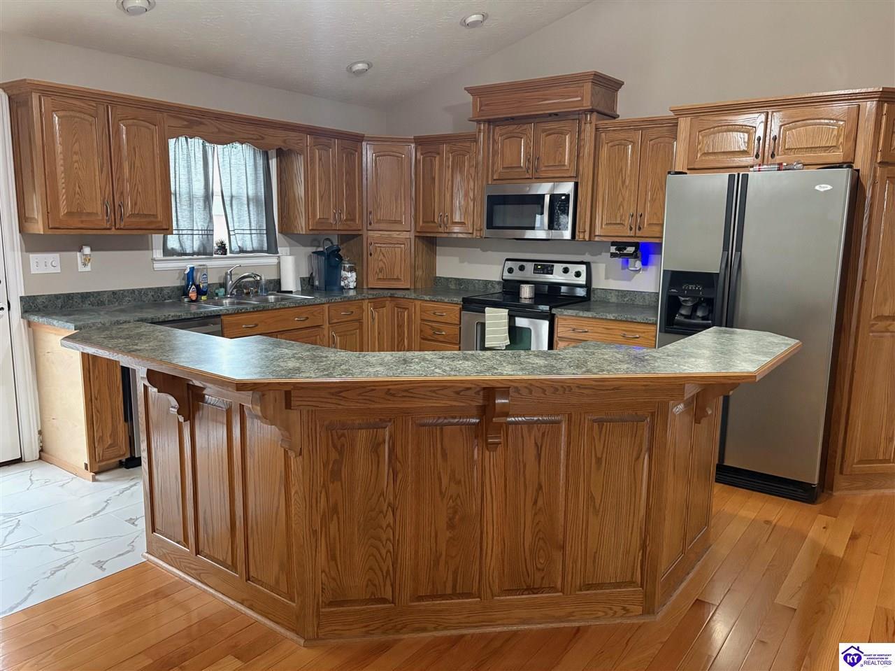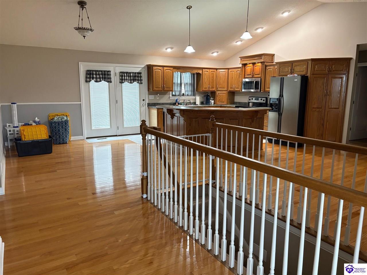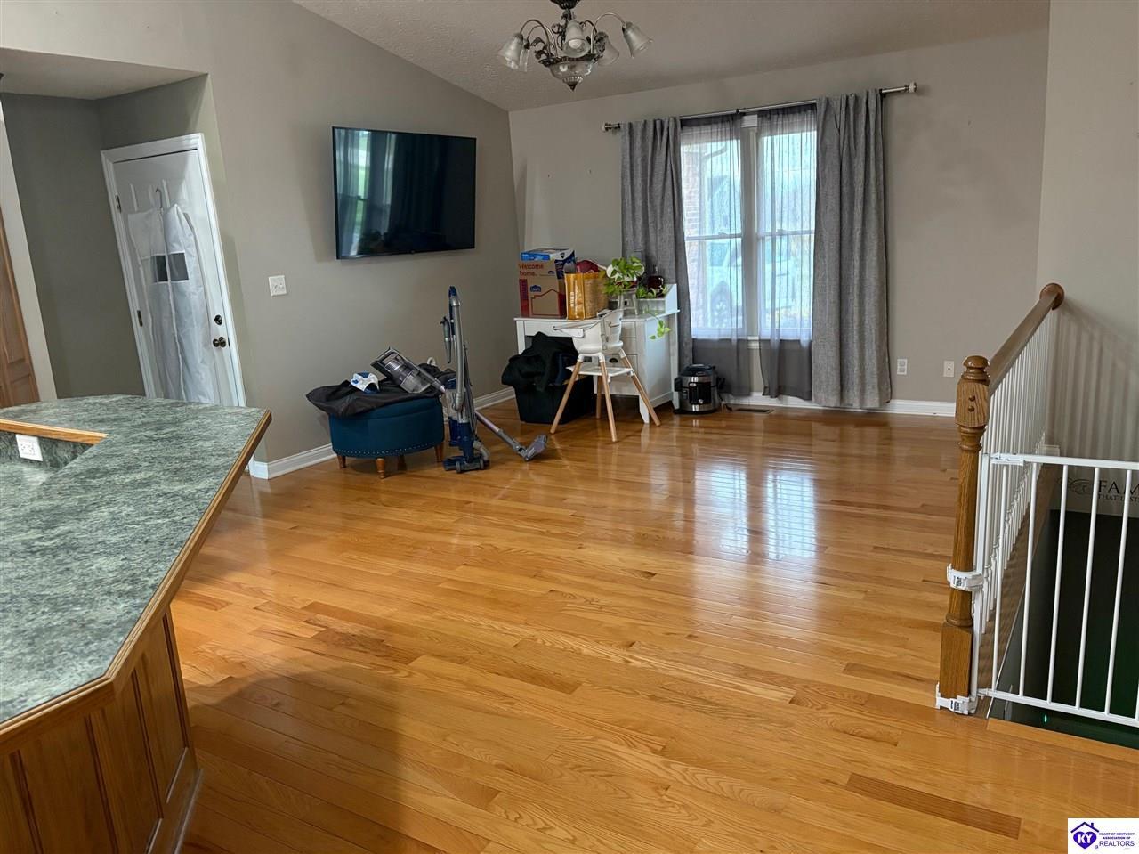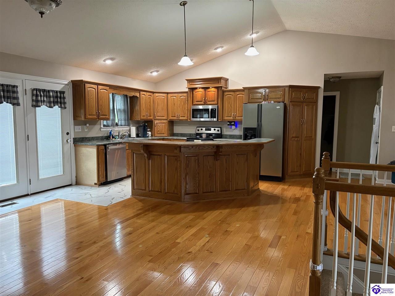 Realtor's notes: Very well maintained home in a very desirable neighborhood in Hodgenville!! Come see the home ASAP because it will not last!! Owner has had this home appraised and it appraised at $358,000 - this house is priced to SELL and will give you built in equity. Walk into this open floor plan home with tall ceilings and beautiful hardwood flooring throughout the living area. The kitchen has a TON of storage in the custom cabinets as well as in the custom island. The laundry room off of the living area has custom cabinets as well for plenty of storage. Main living on the main floor as well as 2 well sized bedrooms on the opposite side of the home. Main bedroom has a LARGE walk in closet and a custom shower! Enjoy a HUGE amount of bonus space downstairs in your finished basement that comes with a designer couch and pool table included in the home sale. This space has potential for anything you'd want to use it for! There is an unfinished area with shelves for MORE storage as well as an attic space above the garage for even MORE storage. Enjoy a well maintained and handy shed in the backyard as well! Come see this home today!! Don't miss out!!! (One or more of these photos have been virtually staged)
