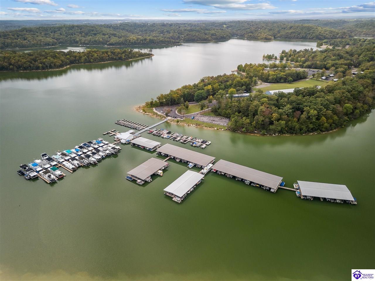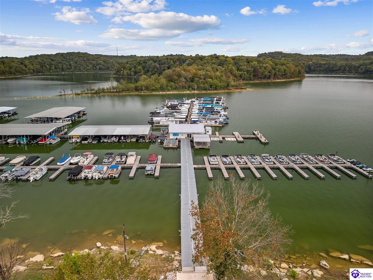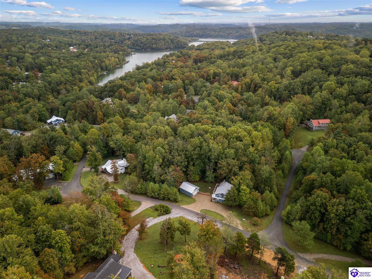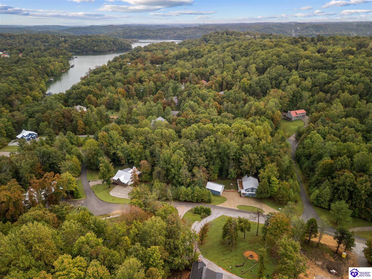 Realtor's notes: BEST price + OWNED dock = true lake living! Just a 10 minute walk or 3 minute golf cart/ATV ride gets you to your OWN dock for Nolin Lake adventures! This custom 4-bedroom retreat in gated Moutardier Woods is designed with space for the whole family! It features two living areas—a vaulted family room plus a bright sunroom with floor-to-ceiling stone fireplace that brings the outdoors in year-round. The first-floor primary suite, custom kitchen, and hand-scraped wood floors blend comfort with style perfectly. Step onto the huge deck to unwind in nature or watch the kids or pets play in the fenced yard! Then sit around your firepit and stargaze all night. A huge detached garage will hold all your lake toys! Campground and marina just down the street too. An all-seasons lake escape awaits!