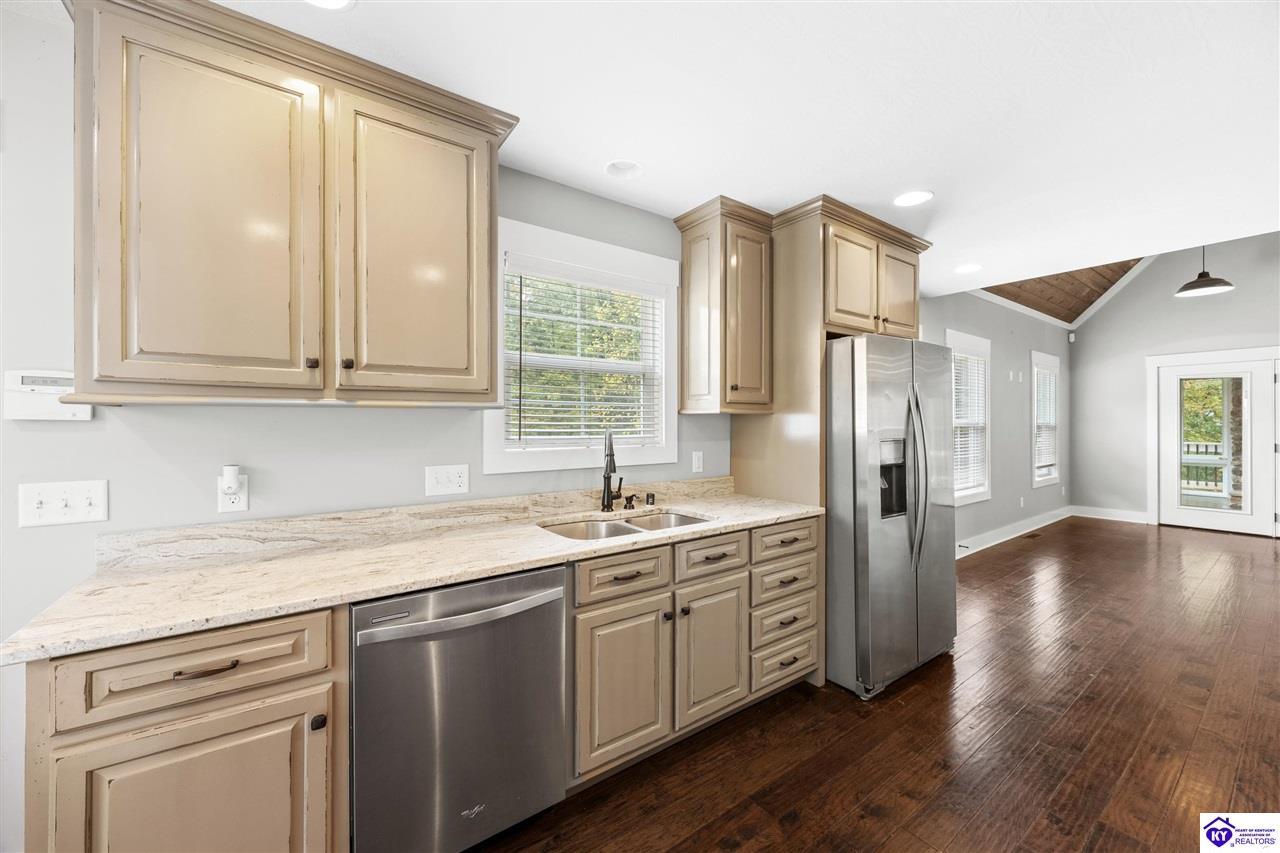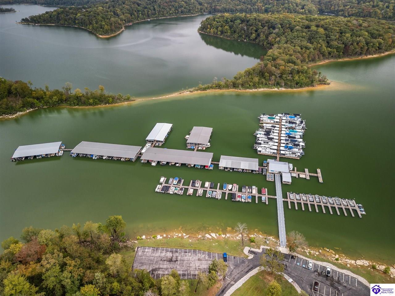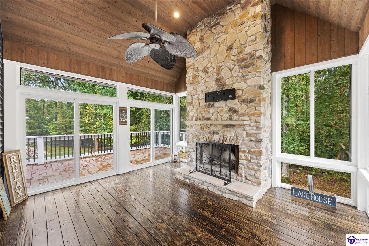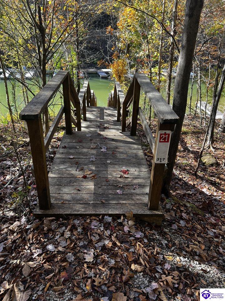 Realtor's notes: BEST price + OWNED dock = true lake living! Just a 10 minute walk or 3 minute golf cart/ATV ride gets you to your OWN dock for Nolin Lake adventures! This custom 4-bedroom retreat in gated Moutardier Woods is designed with space for the whole family! It features two living areas—a vaulted family room plus a bright sunroom with floor-to-ceiling stone fireplace that brings the outdoors in year-round. The first-floor primary suite, custom kitchen, and hand-scraped wood floors blend comfort with style perfectly. Step onto the huge deck to unwind in nature or watch the kids or pets play in the fenced yard! Then sit around your firepit and stargaze all night. A huge detached garage will hold all your lake toys! Campground and marina just down the street too. An all-seasons lake escape awaits!