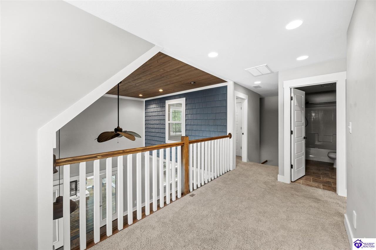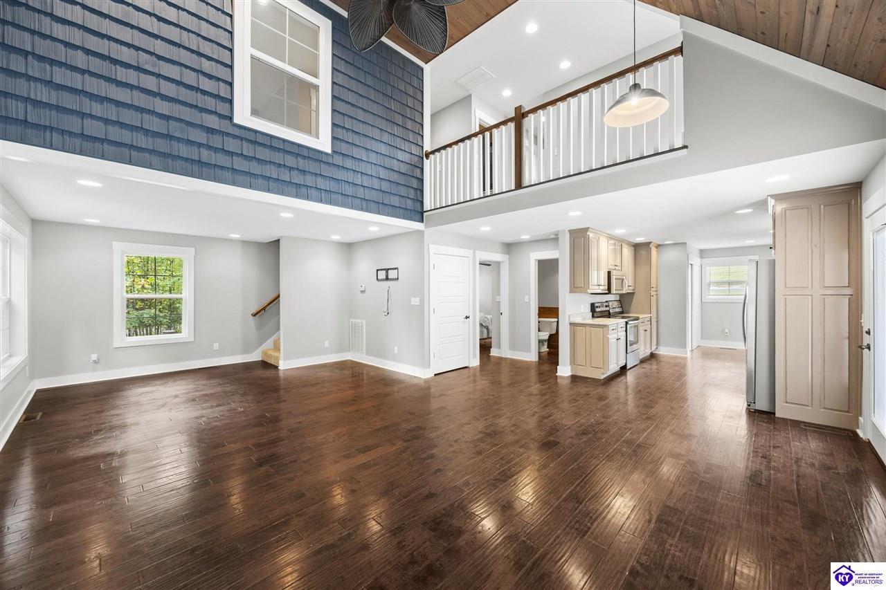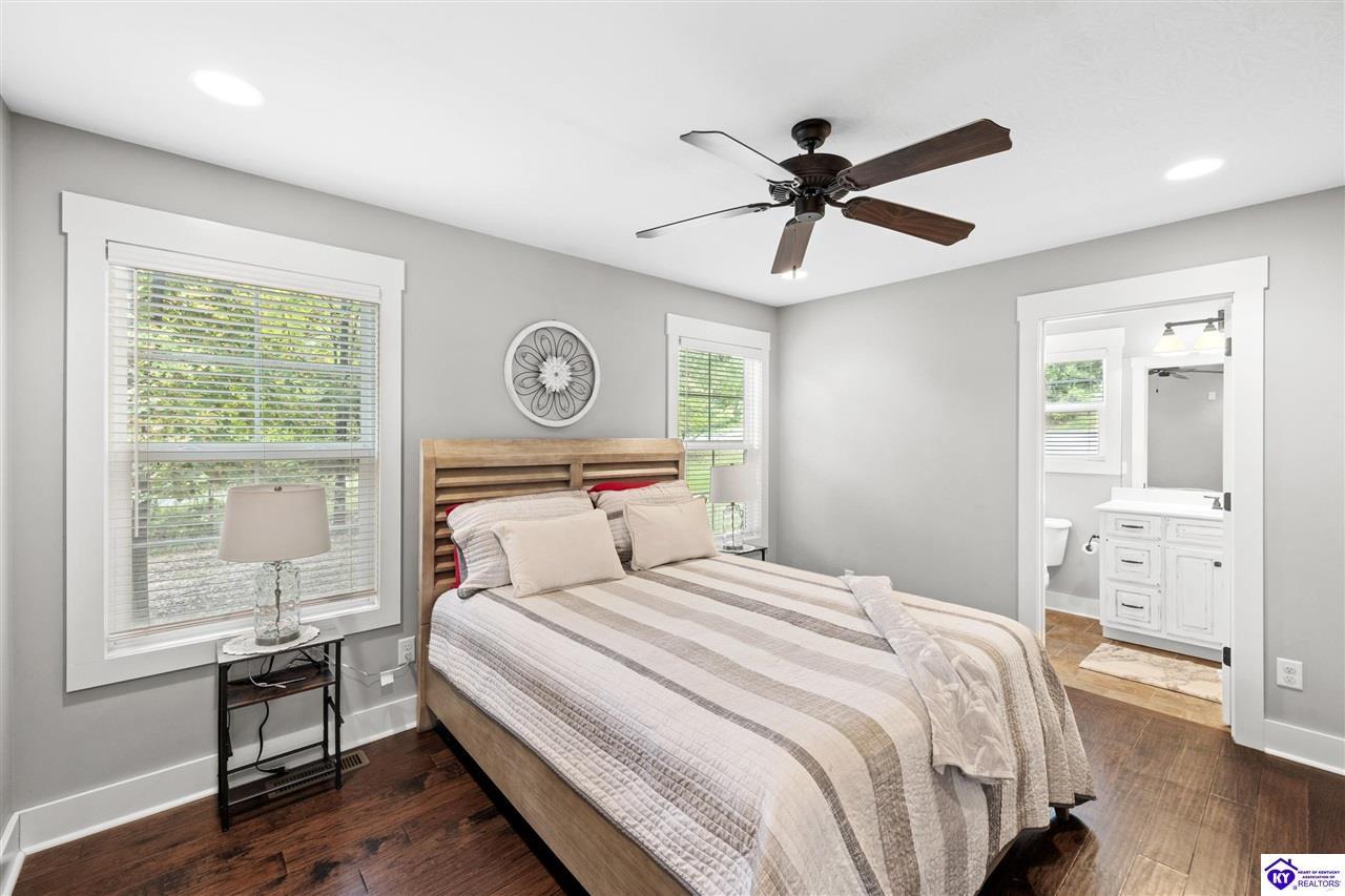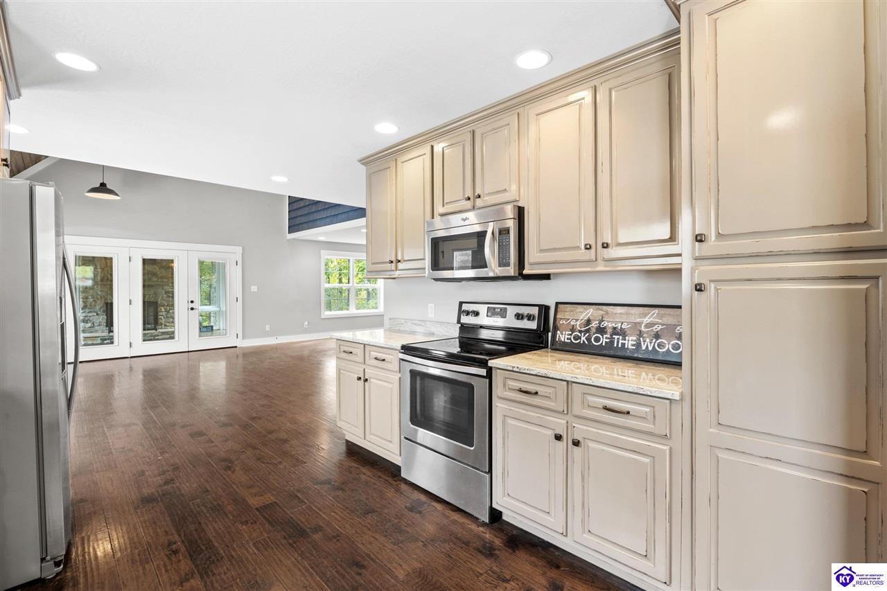 Realtor's notes: BEST price + OWNED dock = true lake living! Just a 10 minute walk or 3 minute golf cart/ATV ride gets you to your OWN dock for Nolin Lake adventures! This custom 4-bedroom retreat in gated Moutardier Woods is designed with space for the whole family! It features two living areas—a vaulted family room plus a bright sunroom with floor-to-ceiling stone fireplace that brings the outdoors in year-round. The first-floor primary suite, custom kitchen, and hand-scraped wood floors blend comfort with style perfectly. Step onto the huge deck to unwind in nature or watch the kids or pets play in the fenced yard! Then sit around your firepit and stargaze all night. A huge detached garage will hold all your lake toys! Campground and marina just down the street too. An all-seasons lake escape awaits!