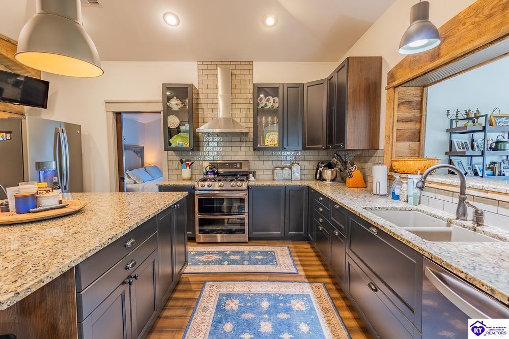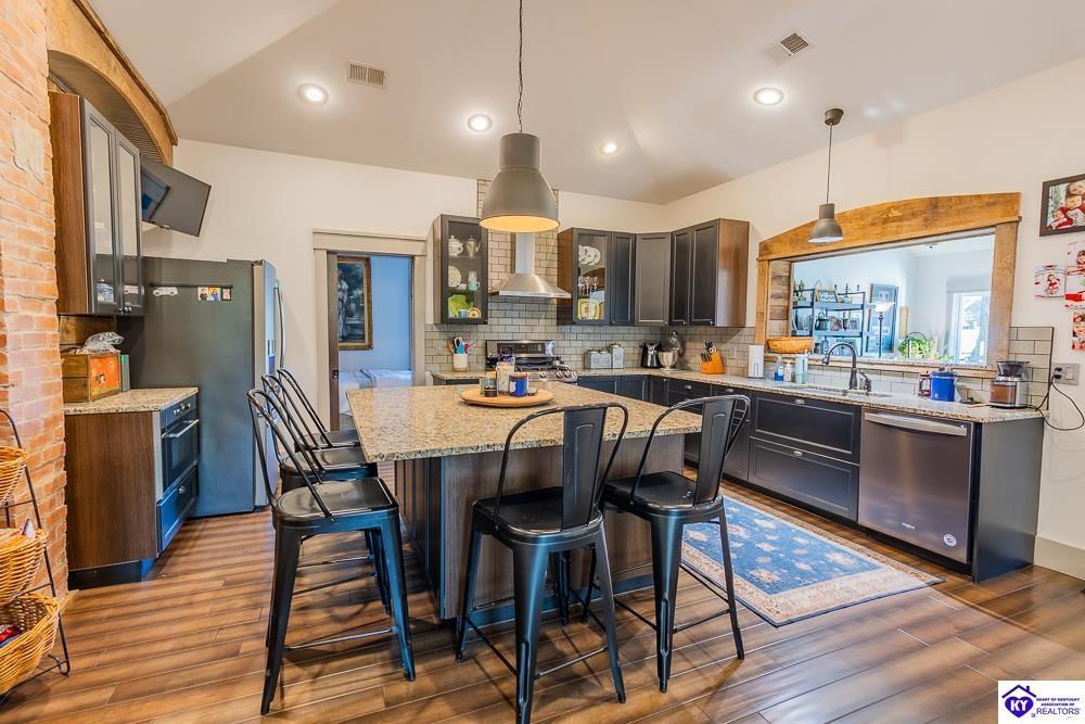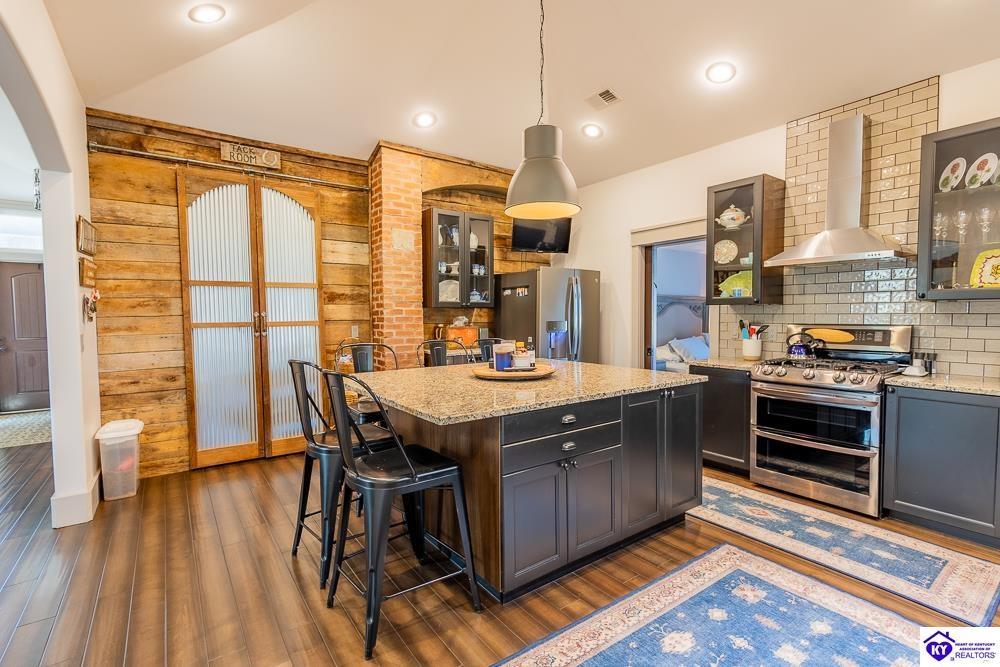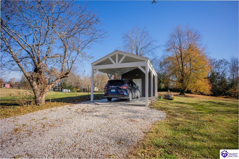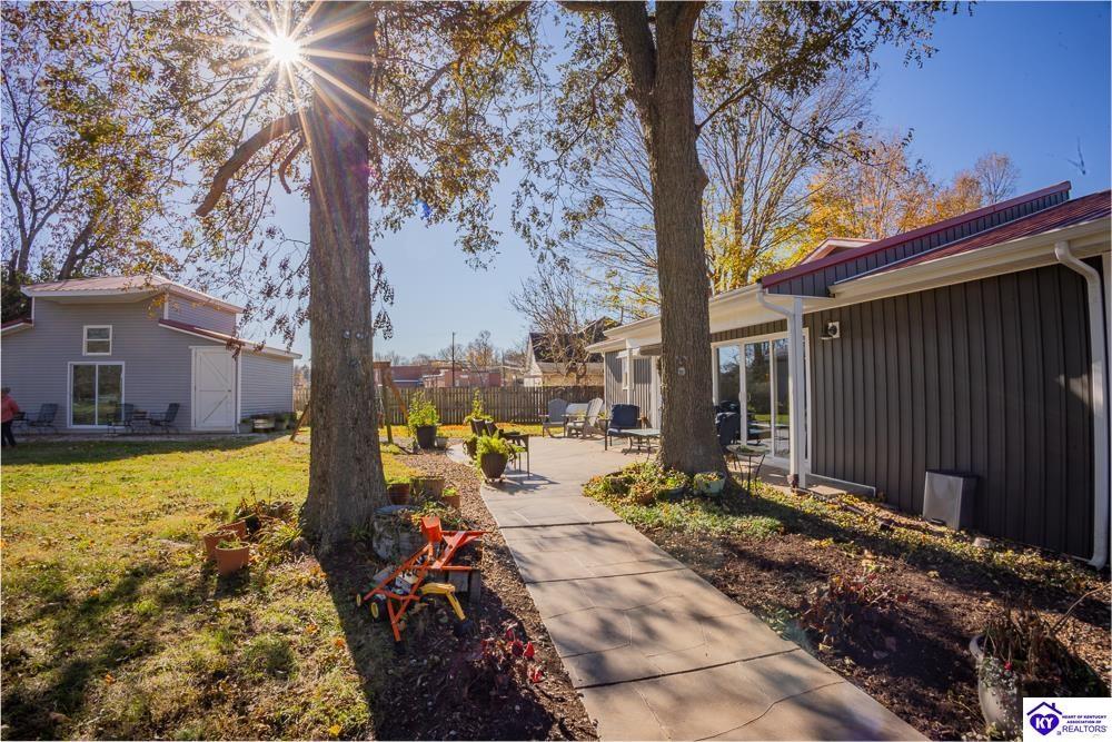 Realtor's notes: This home features custom barn wood trim, beautiful archways, and pre-engineered hardwood flooring throughout. The spacious kitchen offers an oversized island, granite countertops, and custom cabinetry providing ample storage. The living room provides plenty of natural light with large windows overlooking the backyard and concrete patio. The primary bedroom includes pocket doors and an updated en suite bathroom. Additional features include two detached buildings—ideal for storage, workshops, or studio space—along with a one-car attached carport equipped with an RV hookup. The property also includes three raised garden beds, mature shade trees, and a large backyard perfect for outdoor enjoyment.