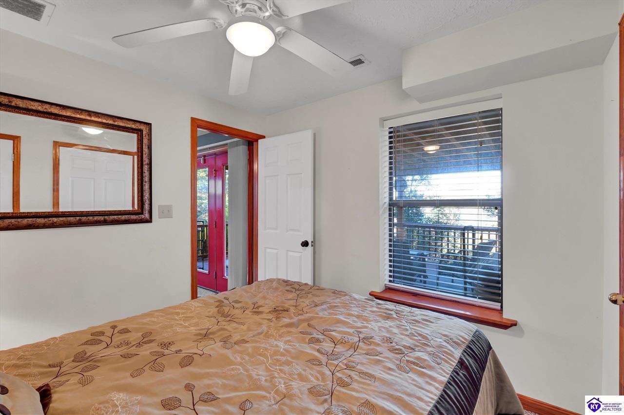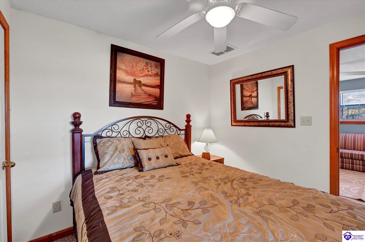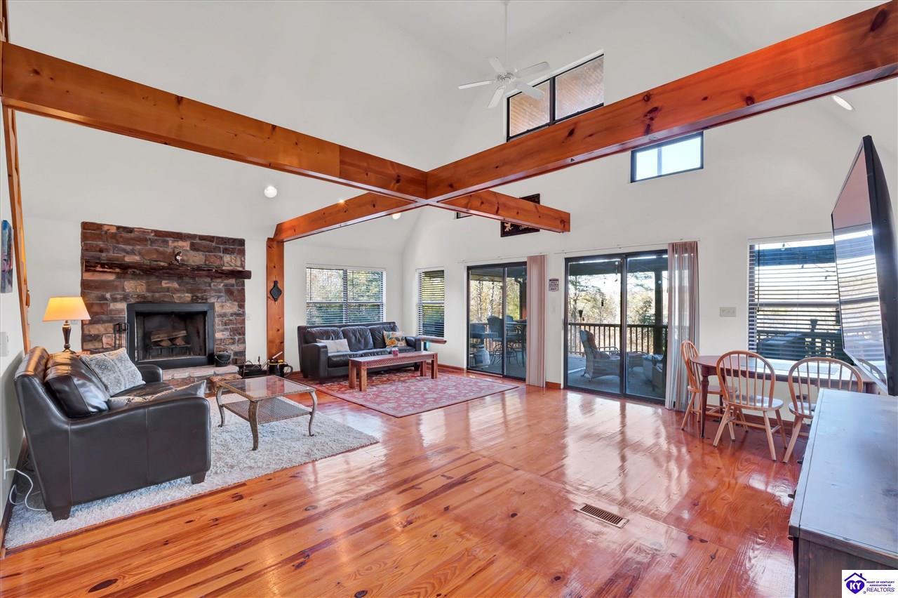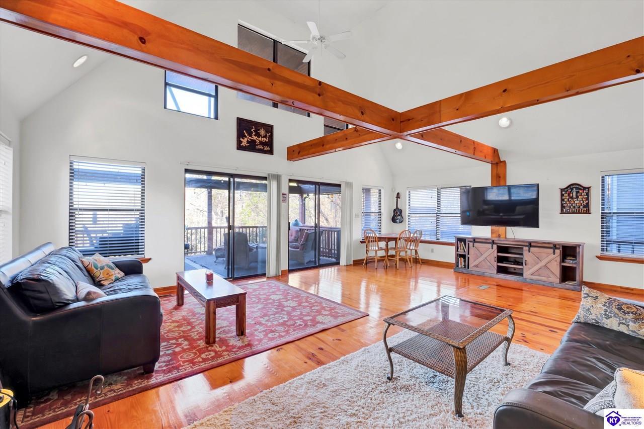 Realtor's notes: Welcome to 1021 Lochober Rd—your lakefront retreat in one of Nolin Lake's most desirable gated communities. This inviting home offers stunning water views and a peaceful setting, whether you're relaxing on the charming front porch, unwinding on one of two covered lakeside decks, or gathering around the fire pit with family and friends. A gentle path leads down to the dock, and with Corp of Engineers approval, the existing dock will transfer. Qualified owners may also obtain a mobility pass, allowing ATV-style access right to the waterfront. A convenient storage shed is included, perfect for housing all your lake toys and gear. Inside, the open floor plan is ideal for entertaining. Warm wood flooring, a vaulted ceiling, and a real wood-burning fireplace create a cozy, lodge-like fee. The More...kitchen, dining area, and living space flow together seamlessly. The main level also includes a comfortable bedroom and a nearby full bath. Upstairs, the private primary suite offers its own full bath along with a loft perfect for a reading nook, office space, or quiet retreat. The walkout lower level expands your living area with a bunk room (no window), an additional bedroom, a family room, and a dedicated laundry space. Furnishings can remain, along with life jackets, the basketball goal, and canoe making your move-in experience effortless and lake-ready. Optional items available for purchase outside of the home sale include a Bass Boat, Sea Ray, Polaris, and a Hydro Hoist boat lift. Ask for more information. Located in a community with a no rental policy, your investment and tranquility are protected. Whether you're looking for a weekend getaway or a full-time lakeside haven, this home is the perfect place to make memories that last a lifetime.