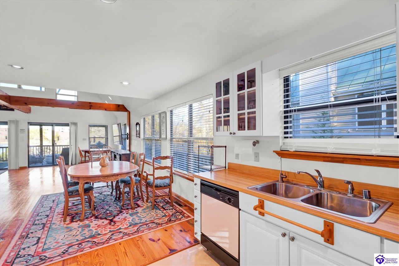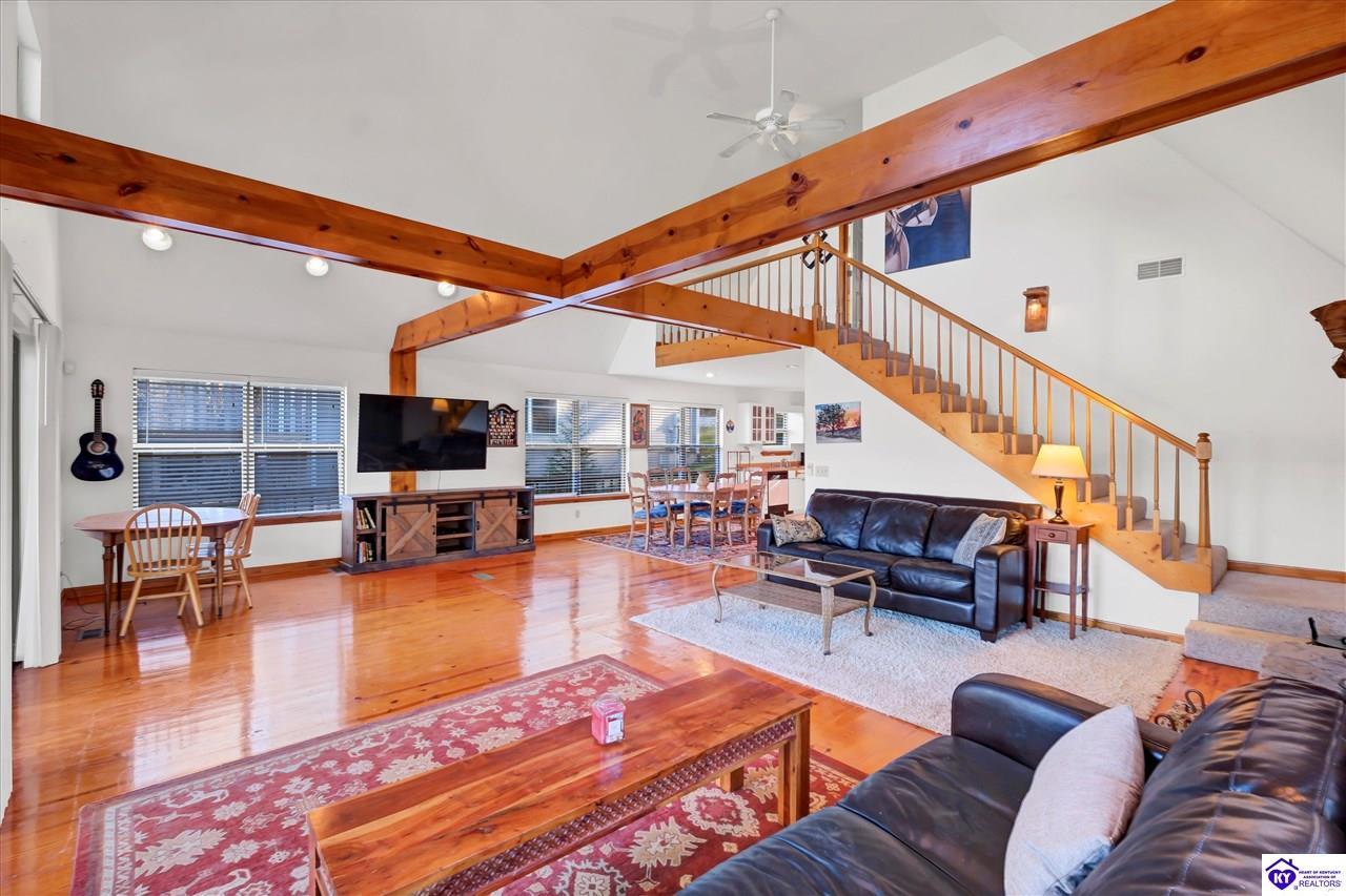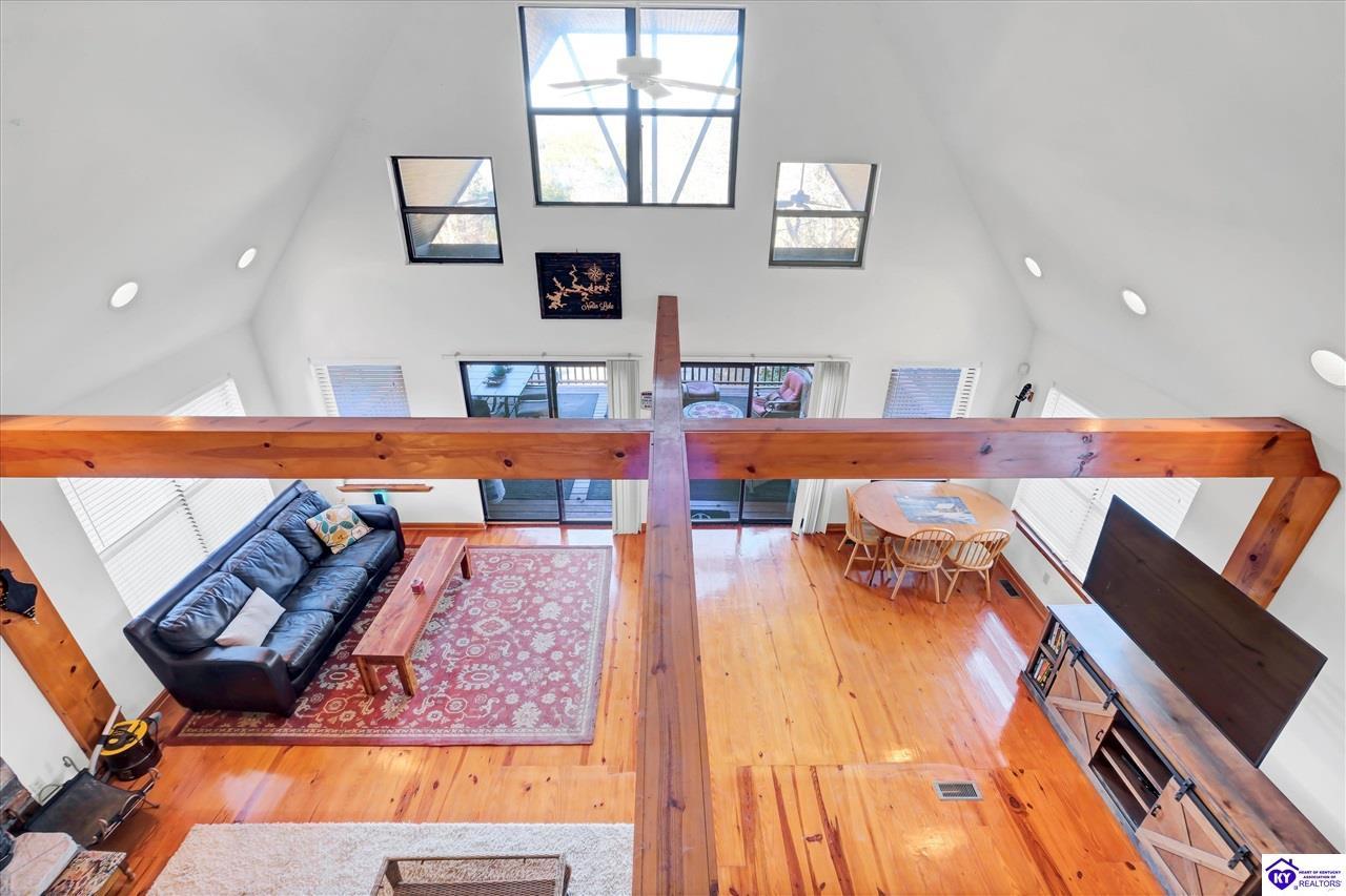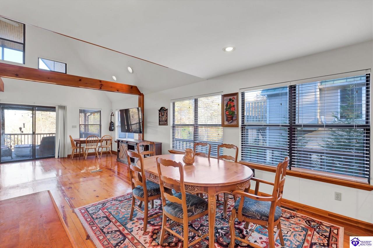 Realtor's notes: Welcome to 1021 Lochober Rd—your lakefront retreat in one of Nolin Lake's most desirable gated communities. This inviting home offers stunning water views and a peaceful setting, whether you're relaxing on the charming front porch, unwinding on one of two covered lakeside decks, or gathering around the fire pit with family and friends. A gentle path leads down to the dock, and with Corp of Engineers approval, the existing dock will transfer. Qualified owners may also obtain a mobility pass, allowing ATV-style access right to the waterfront. A convenient storage shed is included, perfect for housing all your lake toys and gear. Inside, the open floor plan is ideal for entertaining. Warm wood flooring, a vaulted ceiling, and a real wood-burning fireplace create a cozy, lodge-like fee. The More...kitchen, dining area, and living space flow together seamlessly. The main level also includes a comfortable bedroom and a nearby full bath. Upstairs, the private primary suite offers its own full bath along with a loft perfect for a reading nook, office space, or quiet retreat. The walkout lower level expands your living area with a bunk room (no window), an additional bedroom, a family room, and a dedicated laundry space. Furnishings can remain, along with life jackets, the basketball goal, and canoe making your move-in experience effortless and lake-ready. Optional items available for purchase outside of the home sale include a Bass Boat, Sea Ray, Polaris, and a Hydro Hoist boat lift. Ask for more information. Located in a community with a no rental policy, your investment and tranquility are protected. Whether you're looking for a weekend getaway or a full-time lakeside haven, this home is the perfect place to make memories that last a lifetime.