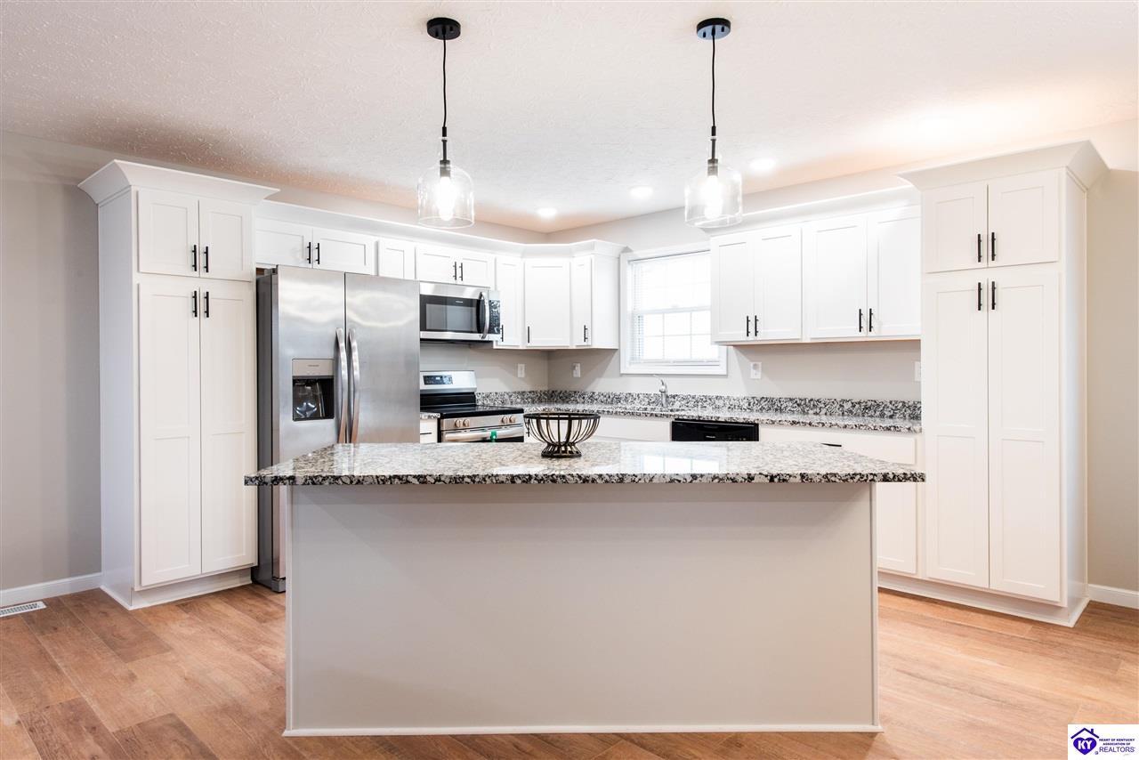 Realtor's notes: Don't miss out on this 1 year new 3bed/2bath ranch home on 2.06 acres. This home features dark gray siding with stacked stone accents. There is a wonderful covered front porch that greets you. Open the front door and see the beautiful open floor plan with a large living room. The kitchen features tons of white cabinets with granite countertops, stainless appliances, and a large island with pendant lighting along with a large Dining area. LVP flooring throughout and tile in the bathrooms. Laundry room off the garage. The bedrooms are a split design with primary suite on one side and other bedrooms and guest bath across the house. In the walkout basement you will find a rough in for a 3rd bathroom. Out back is a 10x16 covered deck for relaxing.