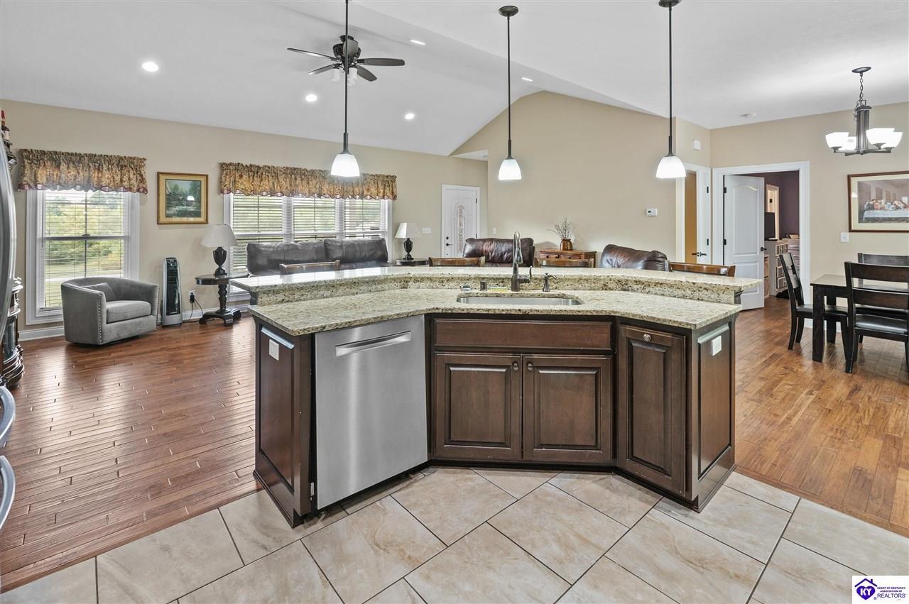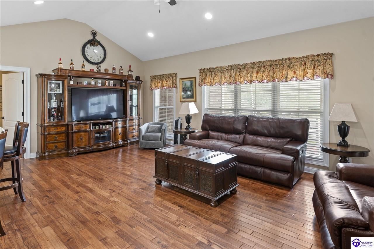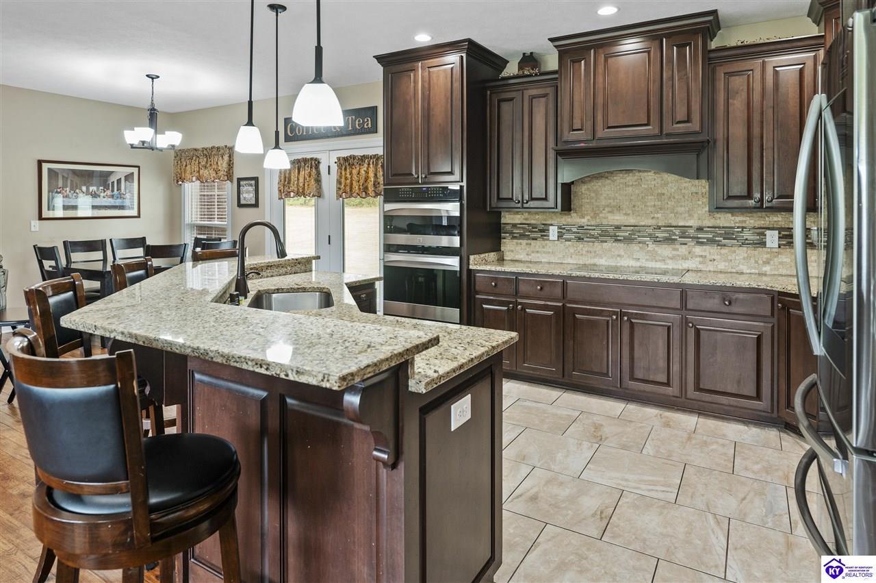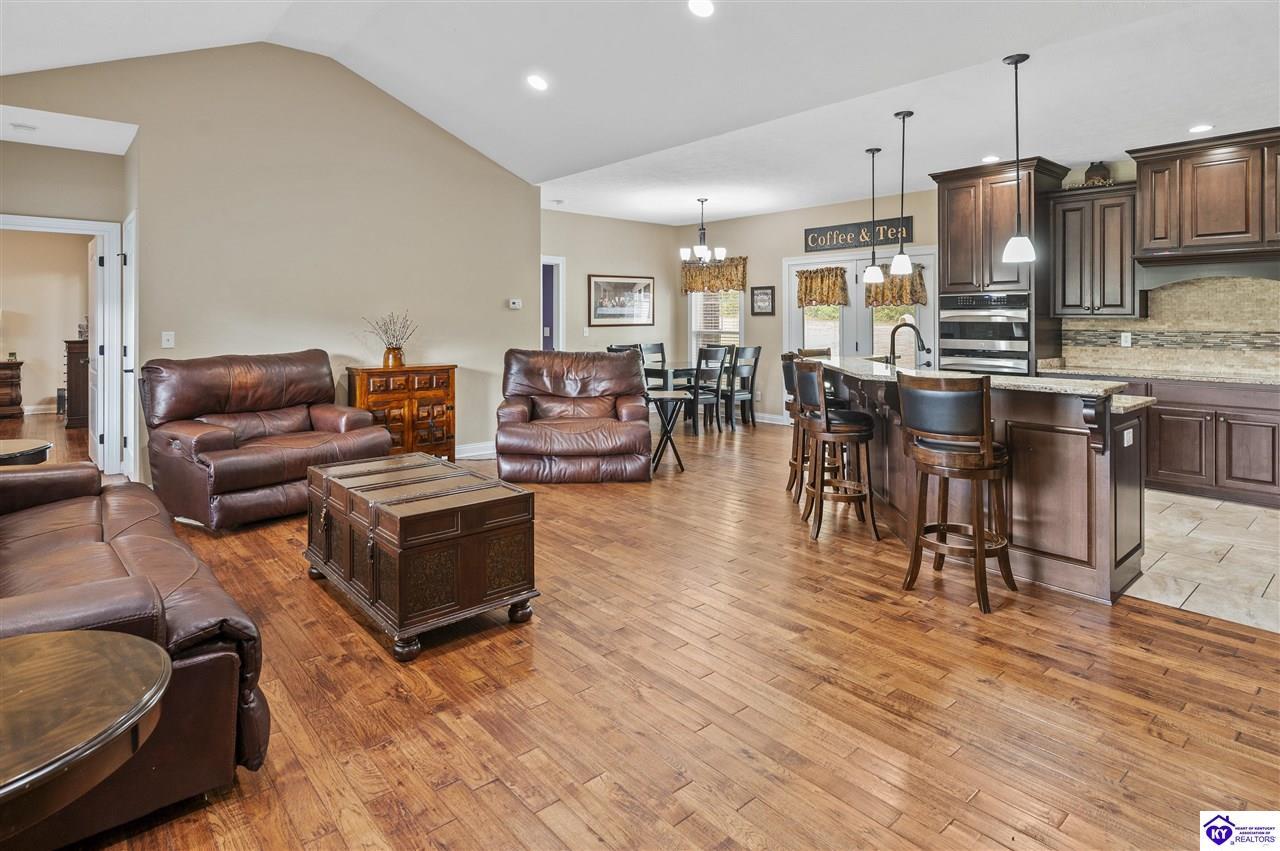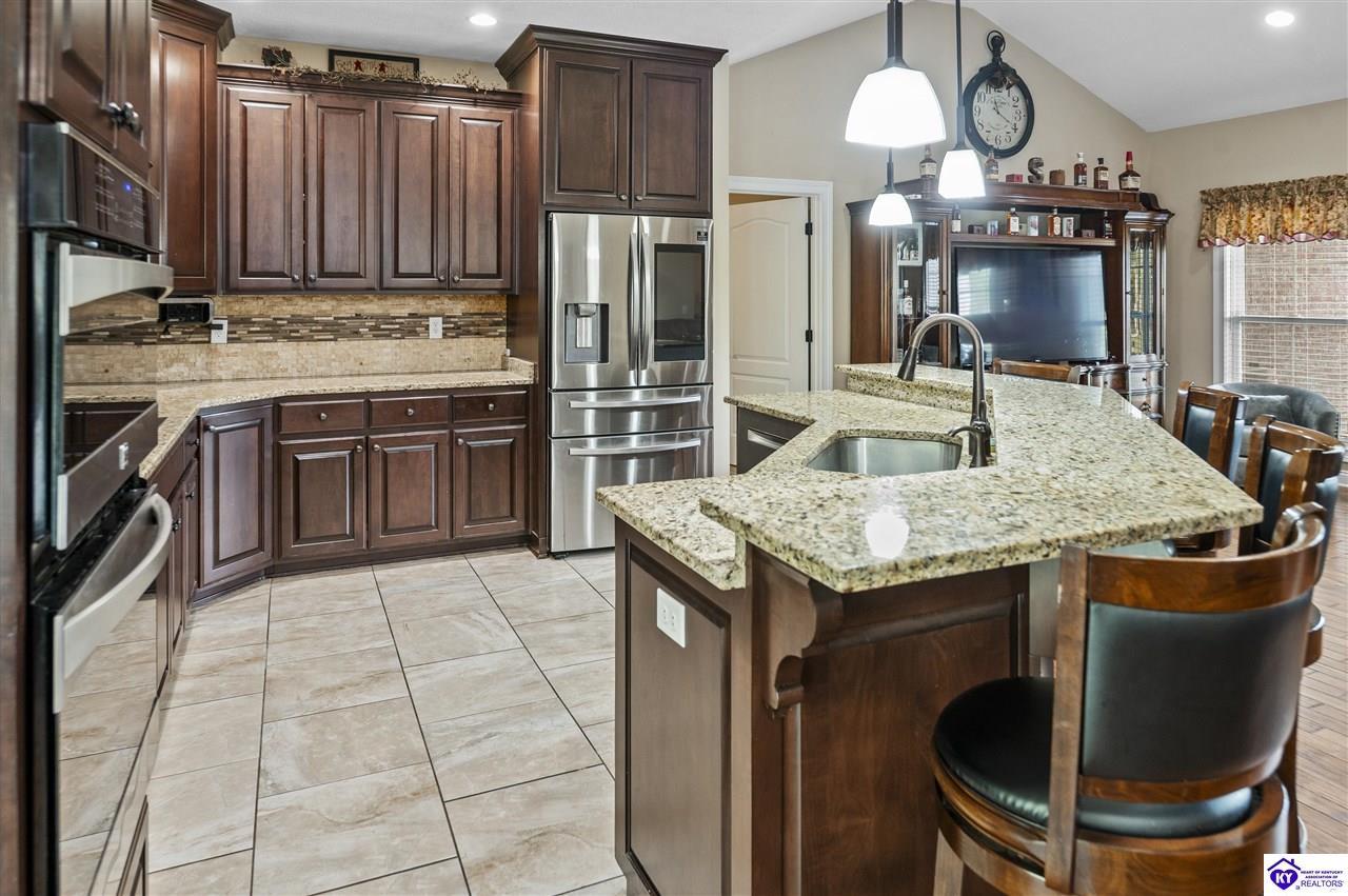 Realtor's notes: Beautiful 4-bedroom, 2½-bath ranch with a walk-out basement on over an acre of landscaped grounds. Features include a covered front porch, 2 1/2 car garage, and extra-wide driveway. The open living area offers hardwood floors and cathedral ceilings, flowing into a kitchen with granite countertops, bar seating, built-in wall oven and microwave, and adjacent dining area. Tile floors in kitchen, baths, and laundry, and the oversized laundry room includes a walk-in pantry. Step out to the covered back patio from the kitchen and dining area.The primary suite boasts a tiled shower with rain head, separate soaking tub, double vanities, and walk-in closet. The walk-out basement adds a fireplace, large open area, 2 bedrooms, full bath, and bonus office, with side patio access.