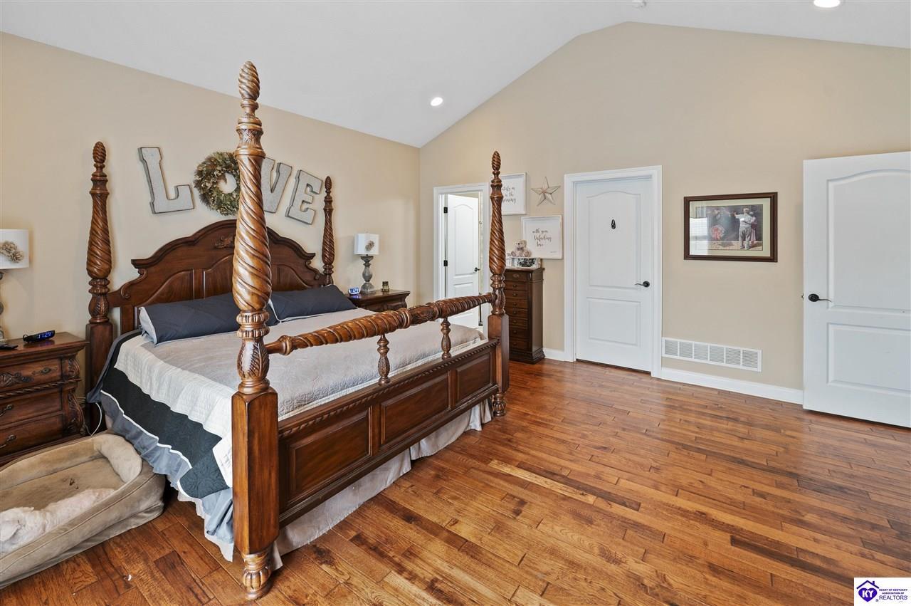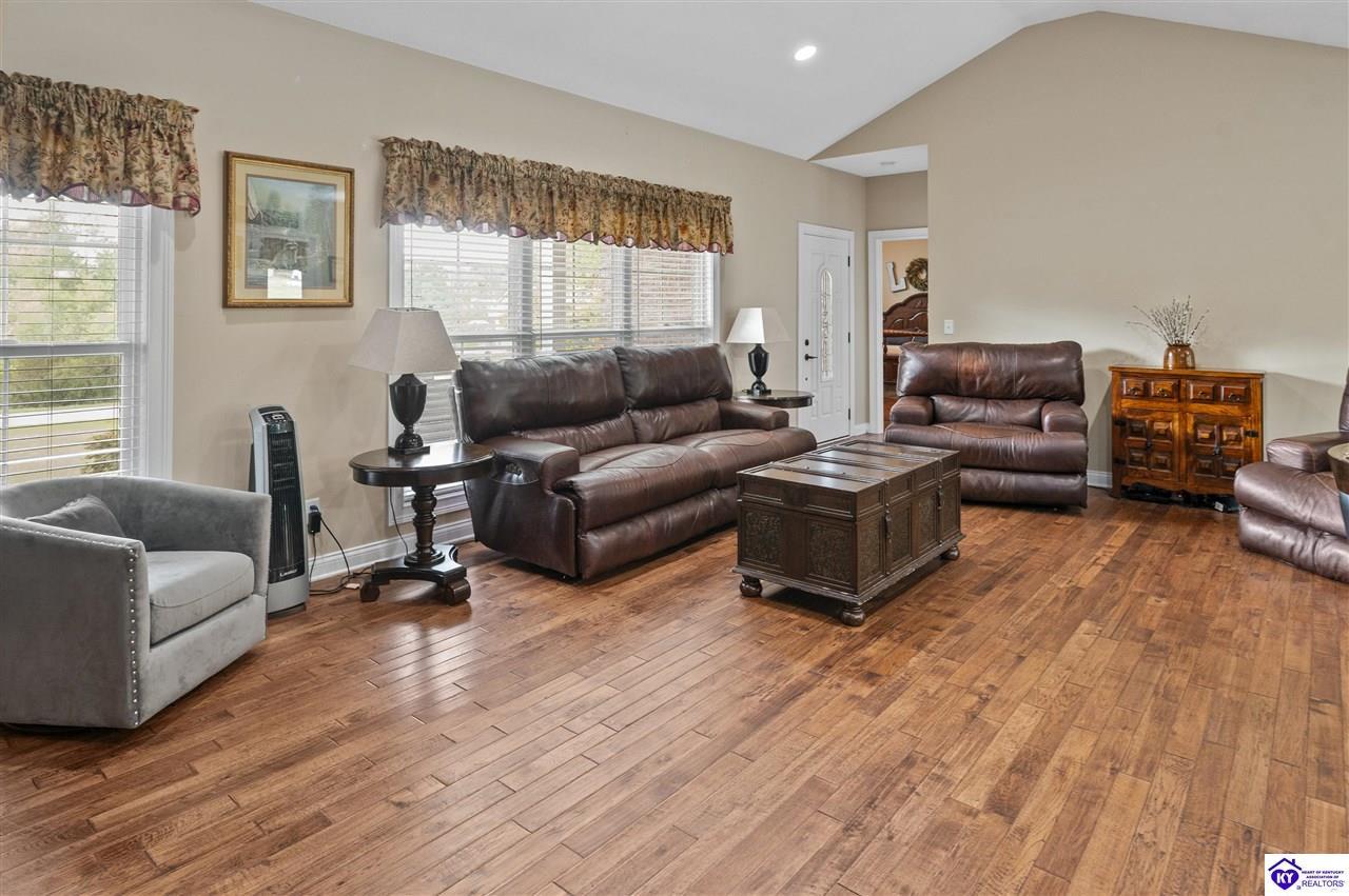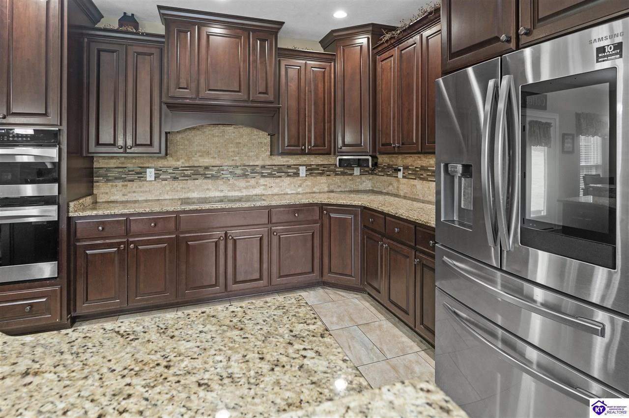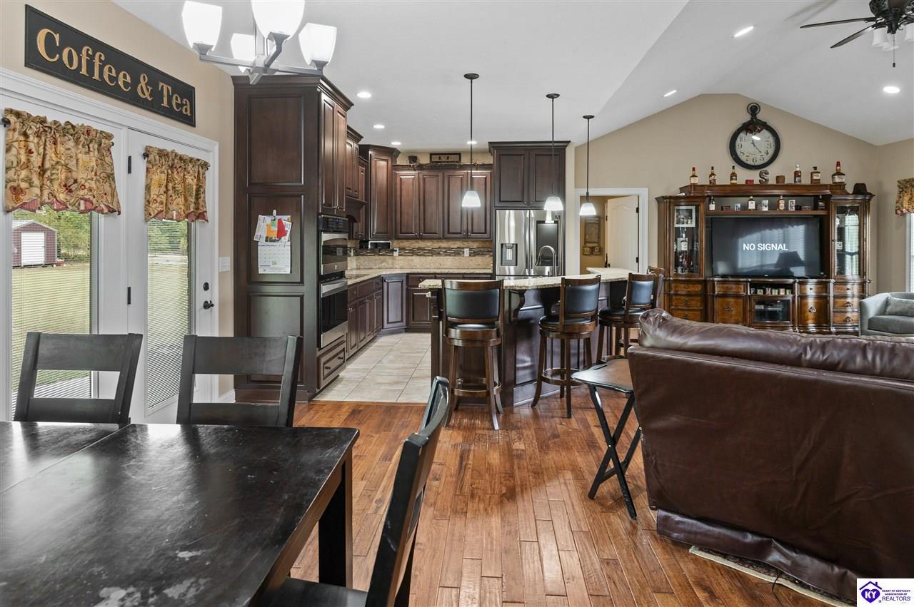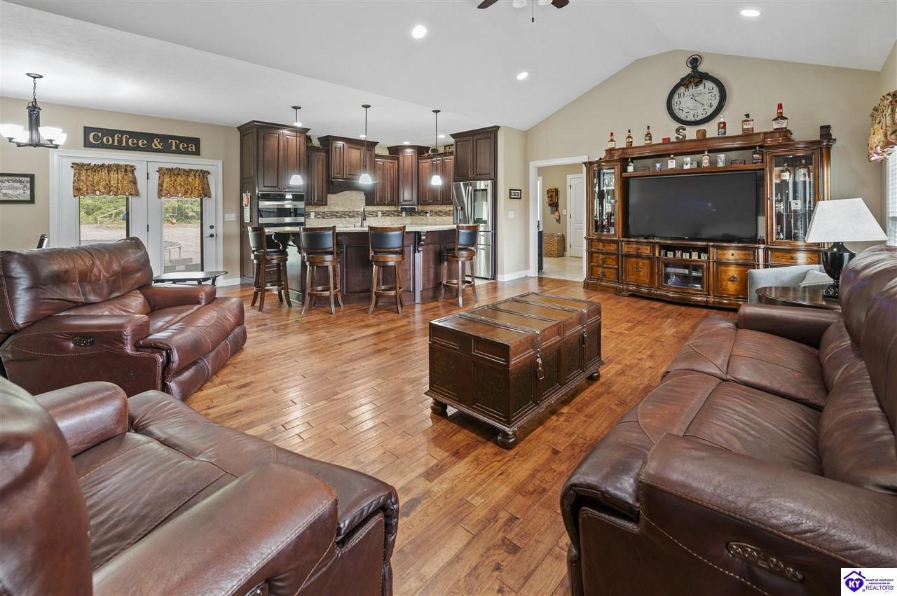 Realtor's notes: Beautiful 4-bedroom, 2½-bath ranch with a walk-out basement on over an acre of landscaped grounds. Features include a covered front porch, 2 1/2 car garage, and extra-wide driveway. The open living area offers hardwood floors and cathedral ceilings, flowing into a kitchen with granite countertops, bar seating, built-in wall oven and microwave, and adjacent dining area. Tile floors in kitchen, baths, and laundry, and the oversized laundry room includes a walk-in pantry. Step out to the covered back patio from the kitchen and dining area.The primary suite boasts a tiled shower with rain head, separate soaking tub, double vanities, and walk-in closet. The walk-out basement adds a fireplace, large open area, 2 bedrooms, full bath, and bonus office, with side patio access.