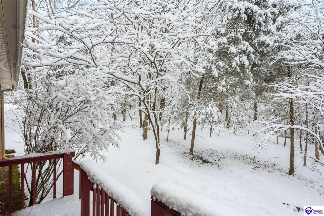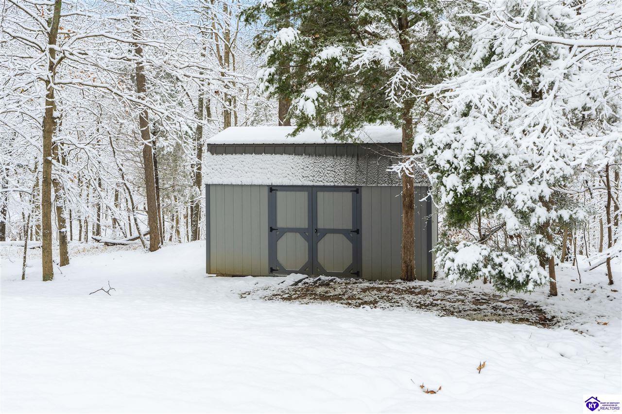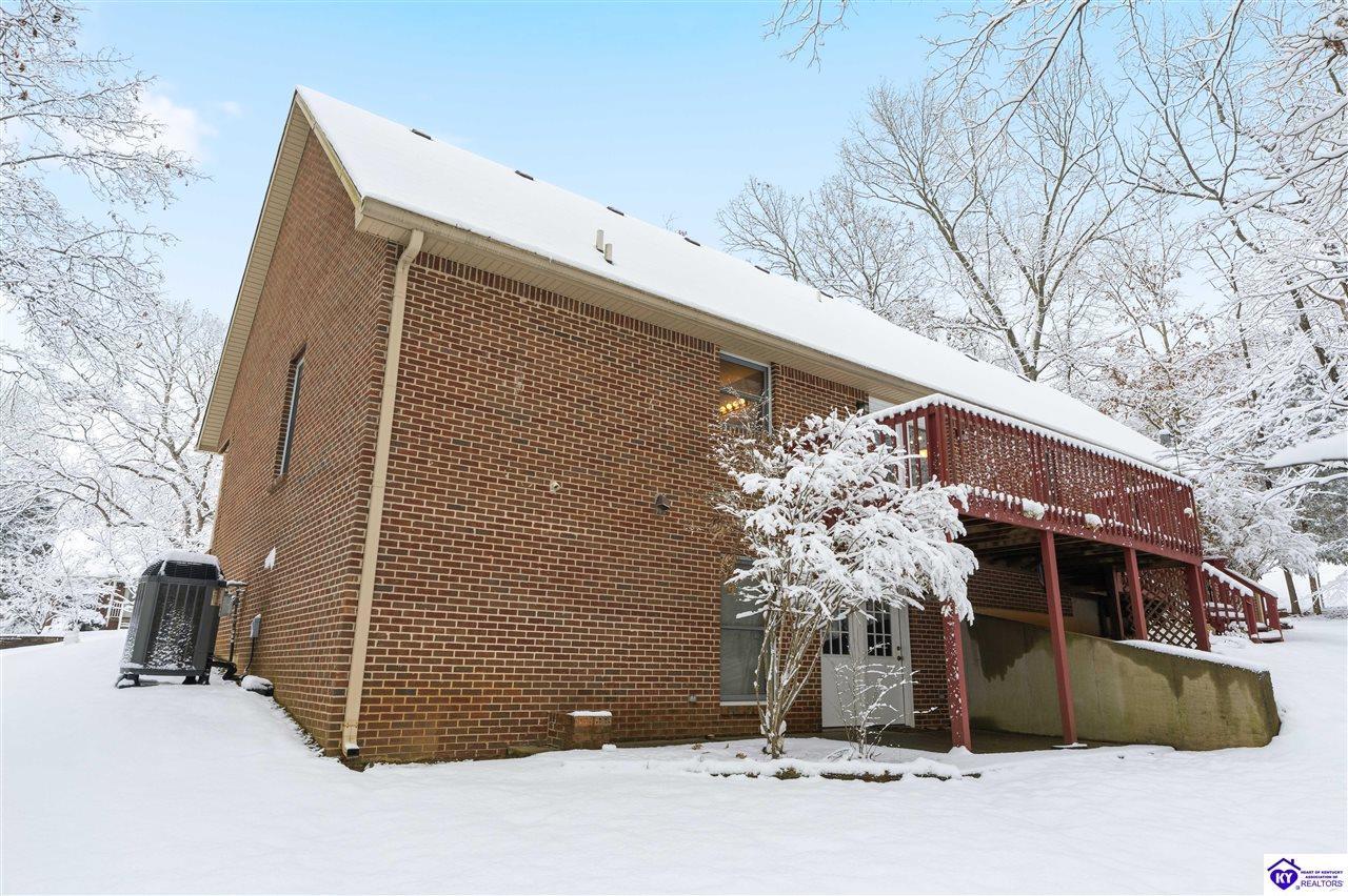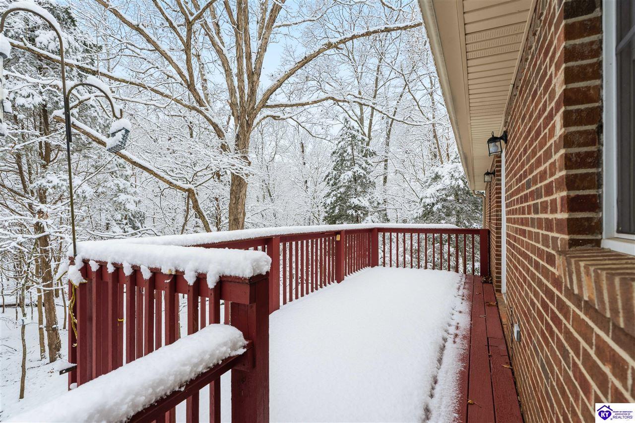Realtor's notes: **Doe Valley Estates • 2.06 acres • Near Fort Knox and Elizabethtown • Walkout basement • Brick home with oversized garage • Main floor primary suite** Situated on a private 2.06 acre wooded property in Doe Valley Estates, this brick home offers space, privacy, and future potential. The location sits outside the gated section while still providing lake access, the marina, pool, tennis courts, playground, and access to Park Point, a resident pavilion with bathrooms, a play area, and a community dock. Inside, the layout features a main floor primary bedroom and bath, along with an oversized laundry room that includes a half bath. The main floor has **recently been painted**, and the kitchen includes upgraded countertops and opens to the living area with a gas fireplace. The unfinished walkout basement adds 1290 square feet of space and is already plumbed for an additional full bath. A Trane HVAC system and tankless water heater support daily comfort, while the oversized garage provides excellent storage, including overhead space and additional attic areas. The wooded setting offers mature trees, open yard areas, and a storage shed, with convenient access to Fort Knox, Elizabethtown, Louisville, and local Brandenburg services.