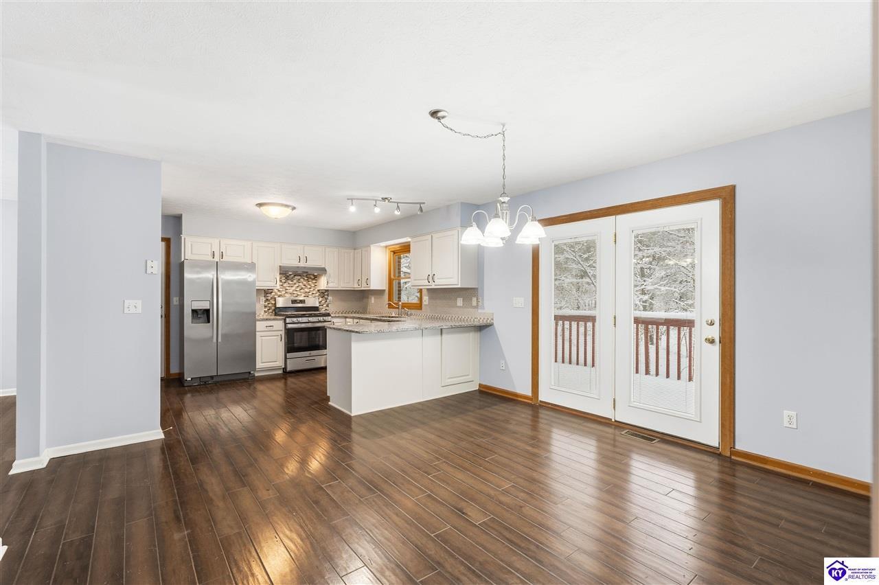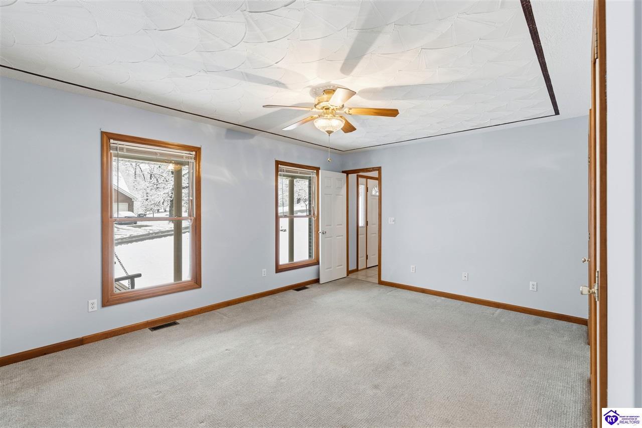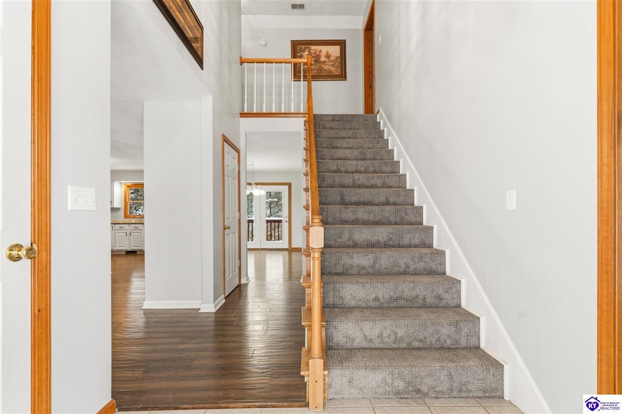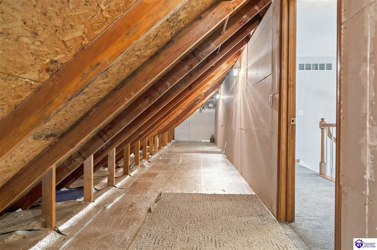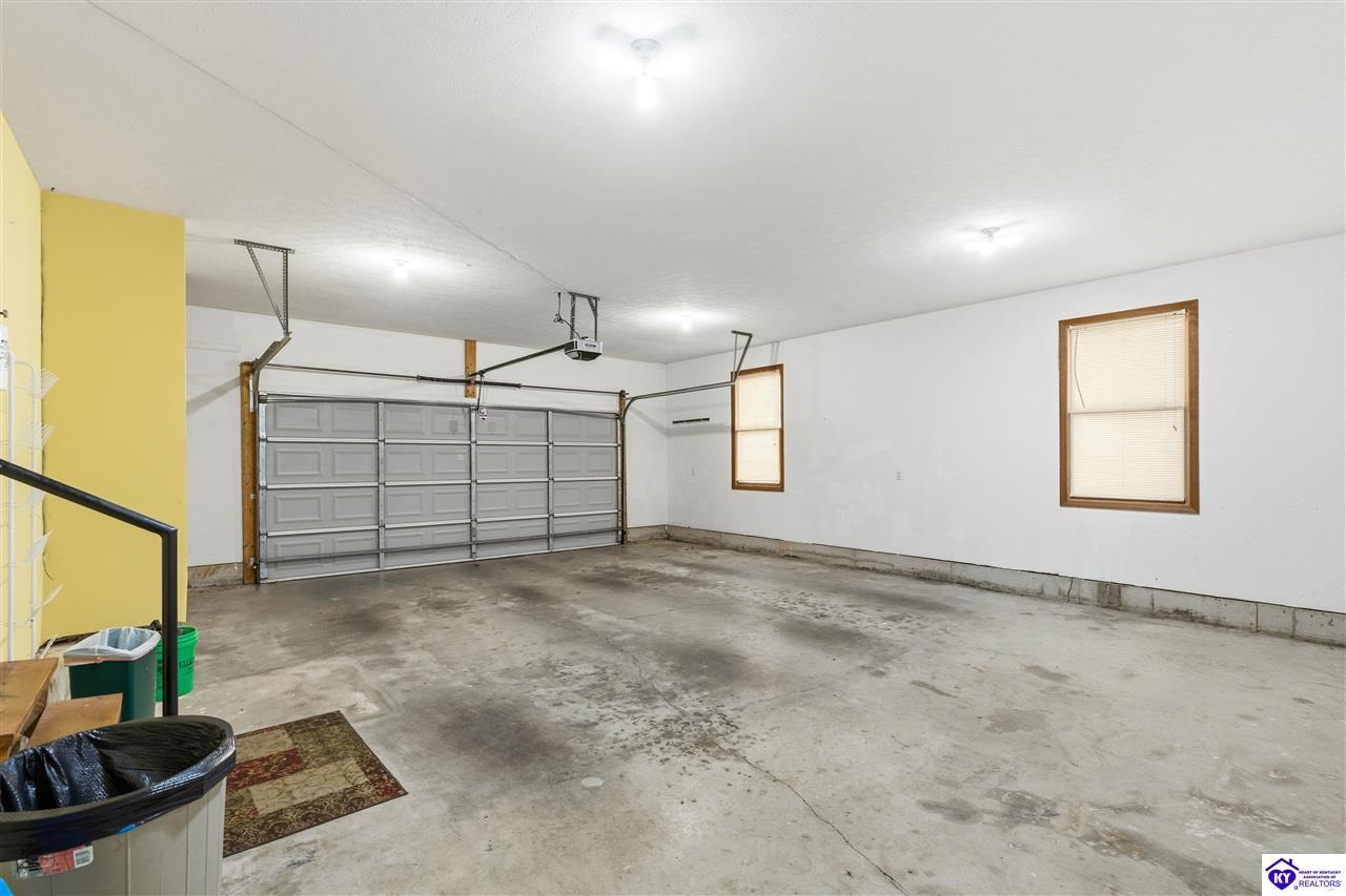 Realtor's notes: **Doe Valley Estates • 2.06 acres • Near Fort Knox and Elizabethtown • Walkout basement • Brick home with oversized garage • Main floor primary suite** Situated on a private 2.06 acre wooded property in Doe Valley Estates, this brick home offers space, privacy, and future potential. The location sits outside the gated section while still providing lake access, the marina, pool, tennis courts, playground, and access to Park Point, a resident pavilion with bathrooms, a play area, and a community dock. Inside, the layout features a main floor primary bedroom and bath, along with an oversized laundry room that includes a half bath. The main floor has **recently been painted**, and the kitchen includes upgraded countertops and opens to the living area with a gas fireplace. The unfinished walkout basement adds 1290 square feet of space and is already plumbed for an additional full bath. A Trane HVAC system and tankless water heater support daily comfort, while the oversized garage provides excellent storage, including overhead space and additional attic areas. The wooded setting offers mature trees, open yard areas, and a storage shed, with convenient access to Fort Knox, Elizabethtown, Louisville, and local Brandenburg services.