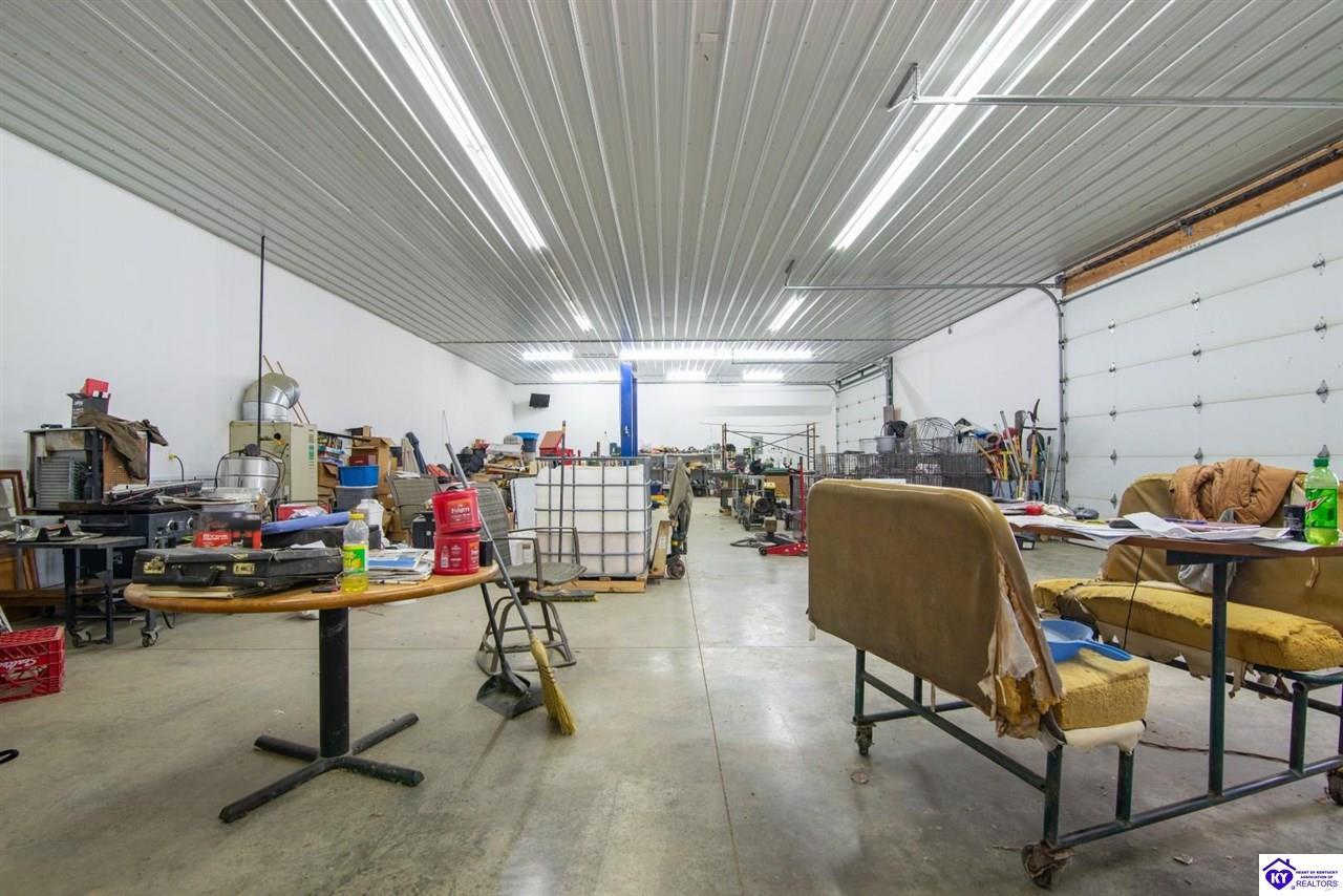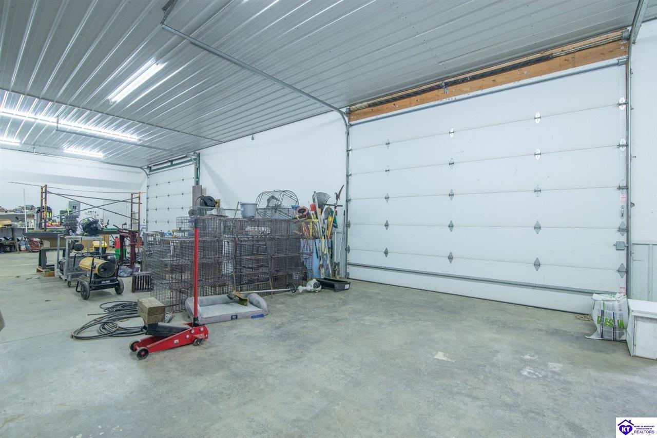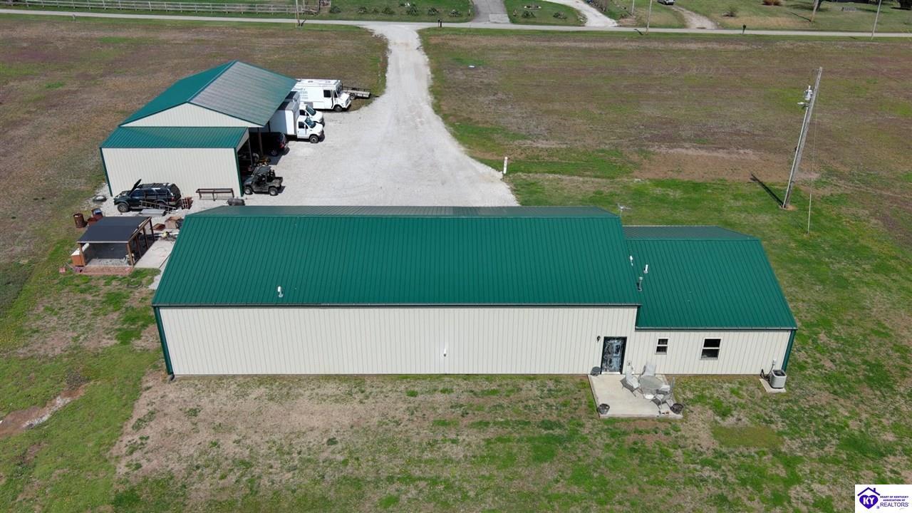 Realtor's notes: Versatile shop-style property situated on 4.39 flat, cleared acres in Harned, KY offering exceptional flexibility with NO zoning and NO restrictions. Built in 2018, the property includes a 720 sq ft living area with 1 bedroom and 1 full bathroom, along with a basement-style storm cellar providing added safety and storage. The 2,500+ sq ft garage features two oversized 12-ft doors, ideal for business operations, equipment, or recreational storage. An additional large outbuilding offers space for up to five boats or extensive equipment. City water and electric are available. Conveniently located just 10 minutes from Rough River Lake, making this an excellent opportunity for lake storage, business headquarters, investment use, or a live-work setup. A rare offering with endless potential in a desirable location. Boundaries are approx, buyer to verify. Mark Aldridge Farm Division- subdivsion.