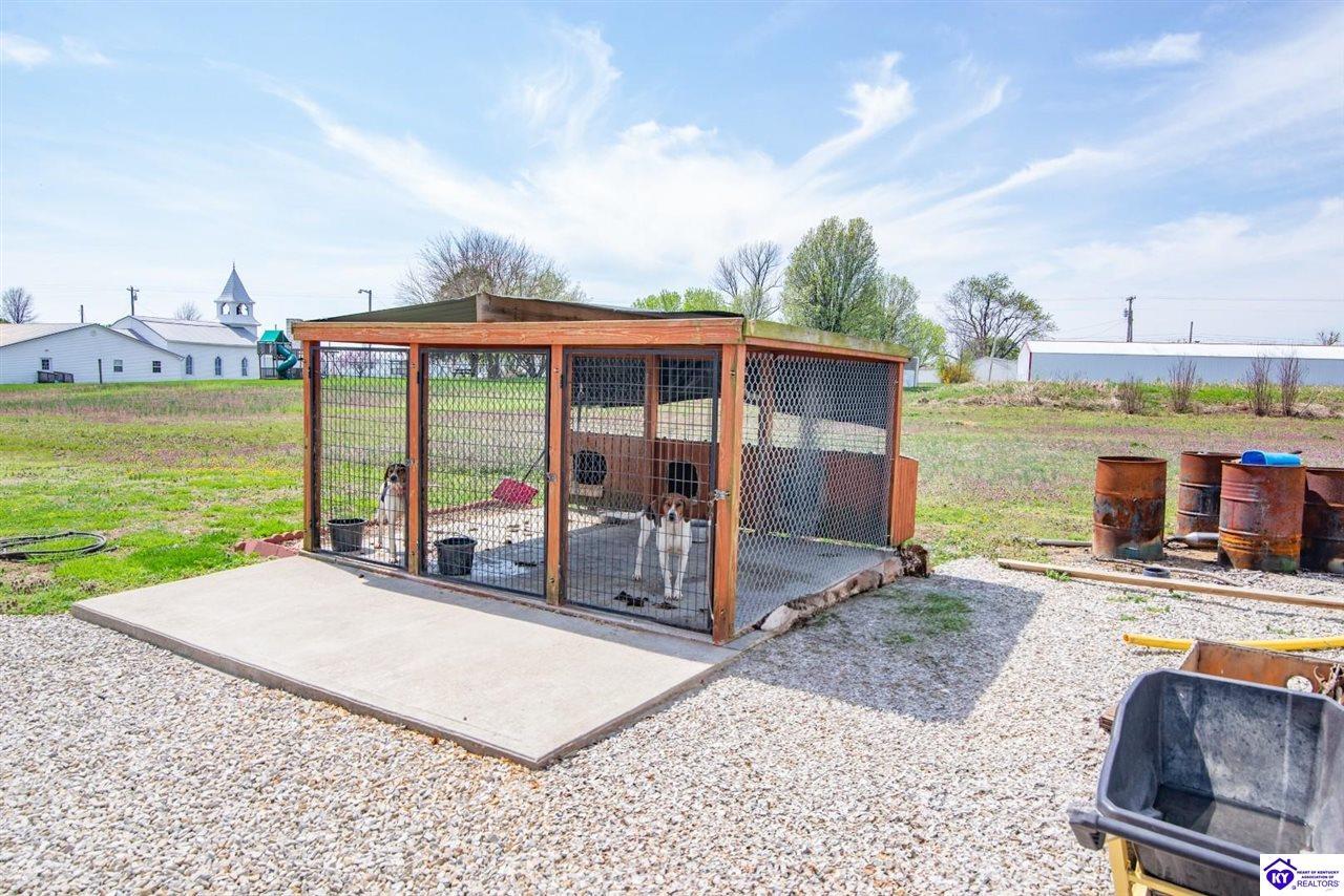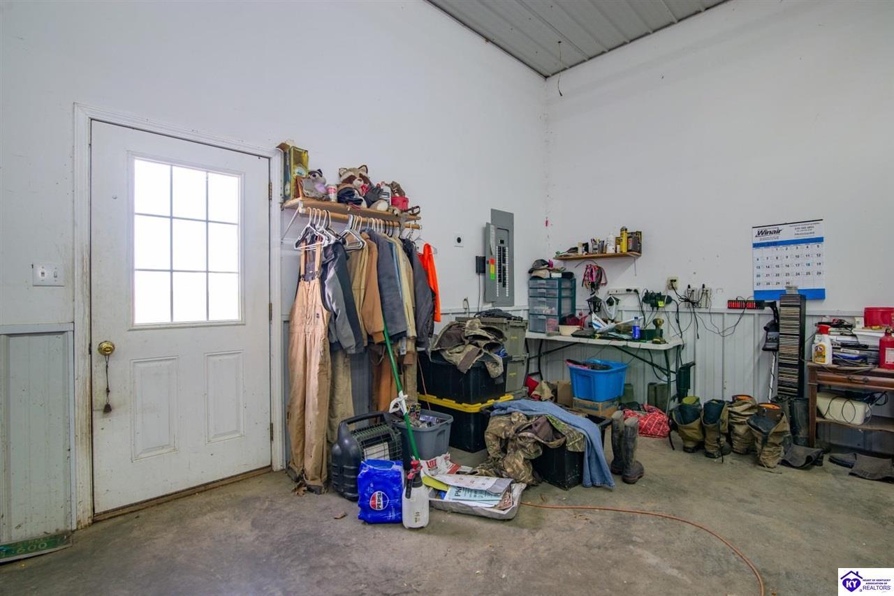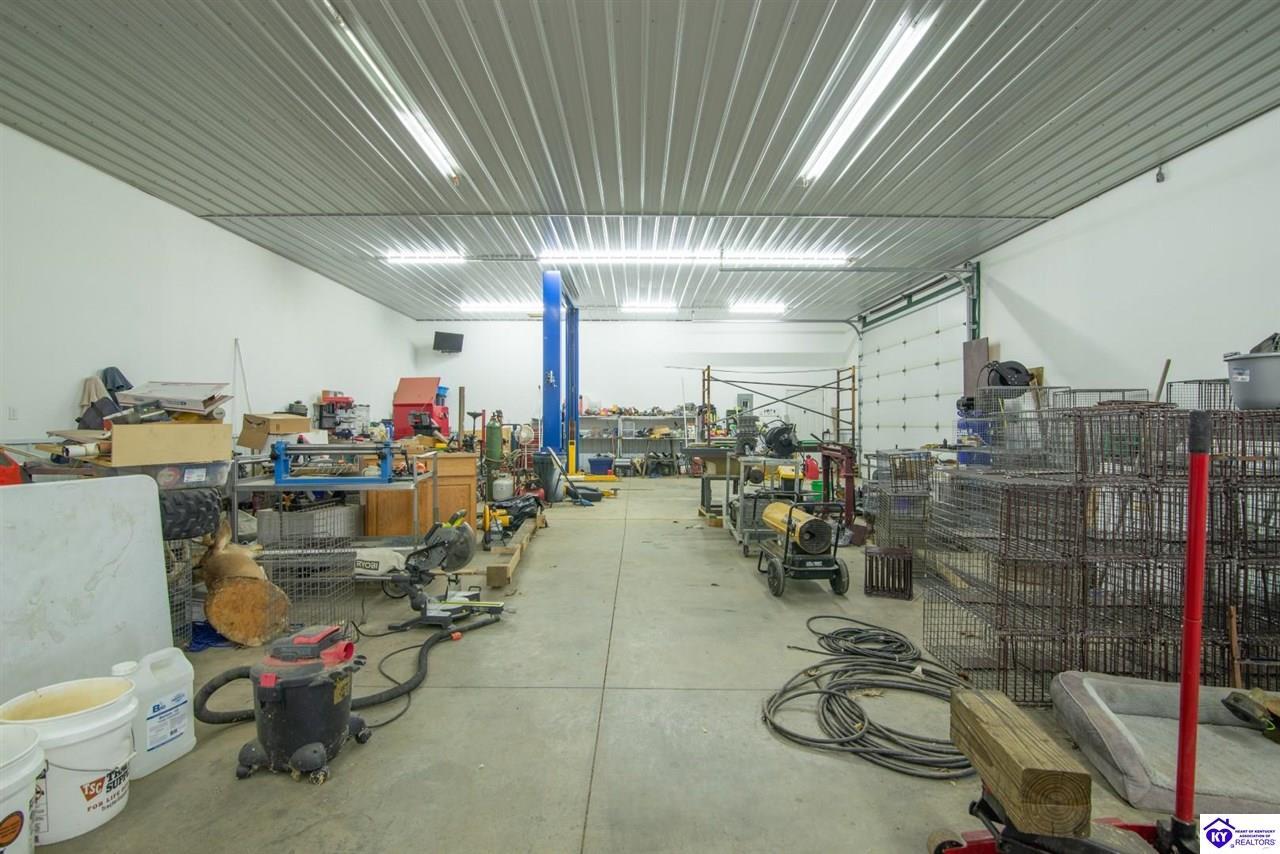 Realtor's notes: Versatile shop-style property situated on 4.39 flat, cleared acres in Harned, KY offering exceptional flexibility with NO zoning and NO restrictions. Built in 2018, the property includes a 720 sq ft living area with 1 bedroom and 1 full bathroom, along with a basement-style storm cellar providing added safety and storage. The 2,500+ sq ft garage features two oversized 12-ft doors, ideal for business operations, equipment, or recreational storage. An additional large outbuilding offers space for up to five boats or extensive equipment. City water and electric are available. Conveniently located just 10 minutes from Rough River Lake, making this an excellent opportunity for lake storage, business headquarters, investment use, or a live-work setup. A rare offering with endless potential in a desirable location. Boundaries are approx, buyer to verify. Mark Aldridge Farm Division- subdivsion.
