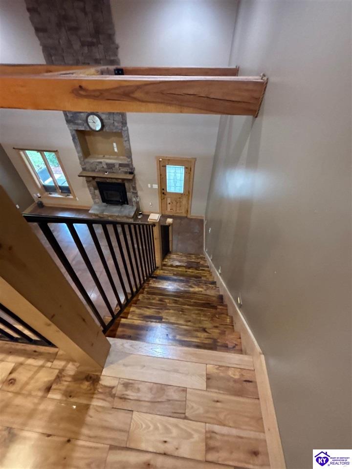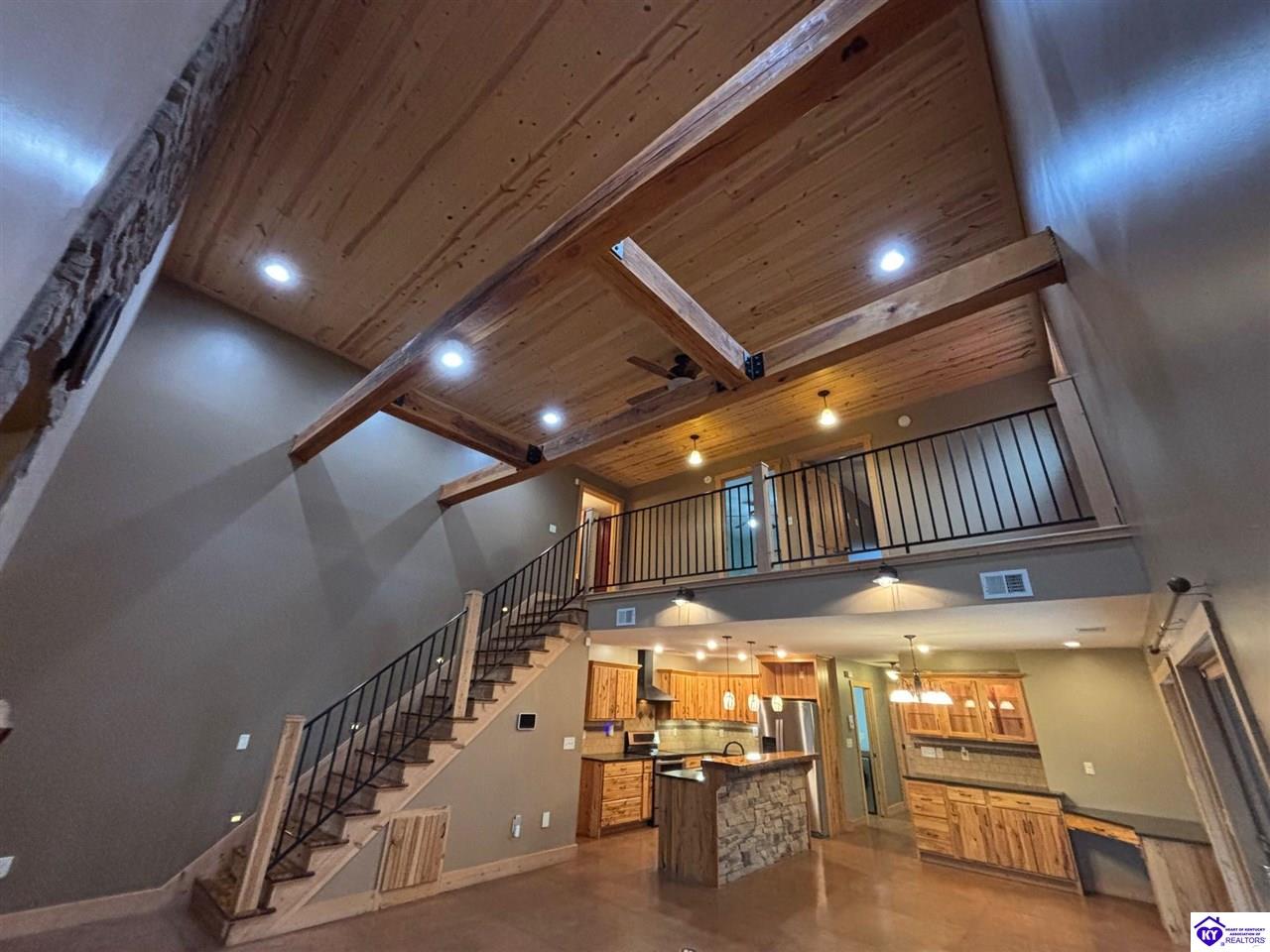 Realtor's notes: Going on the auction block, selling by online bidding only, with bidding ending on Thursday, January 8th at 4:00 PM EST, is a three bedroom, two and a half bath barndominium, built in 2010, with approximately 1,852 finished square feet, large attached garage area and 5.64 acres. The main floor of the finished area consists of a large “great” room with a floor to ceiling, mantled stone fireplace with hearth, stained concrete flooring and open staircase, a modern kitchen with granite and live edge countertops and dining area, a spacious primary bedroom with tray ceiling and a large walk-in closet with two entries, a spacious full primary bathroom with tiled shower, and a utility room. The upper level consists of two bedrooms, a full bathroom, and a loft area with hardwood flooring. The finished area of the home is cooled with central air and heated by an electric heat pump. The home area and the half bathroom in the garage also have radiant floor heat. The 40 ft. x 50 ft. attached garage has a half bath, multiple overhead doors, a wet bar area with island, furnace room, storage closet with gun safe, lofted storage areas, two mini-split heating and cooling units, a wood burning stove and a radiant coil heated system. Other improvements include a covered concrete side porch, a large covered front porch with finished and stamped concrete, a handgun shooting range with backstop, attached shed and a large graveled parking area. The acreage is mostly wooded with mature trees and fronts Fairground Rd (Hwy 1692).
