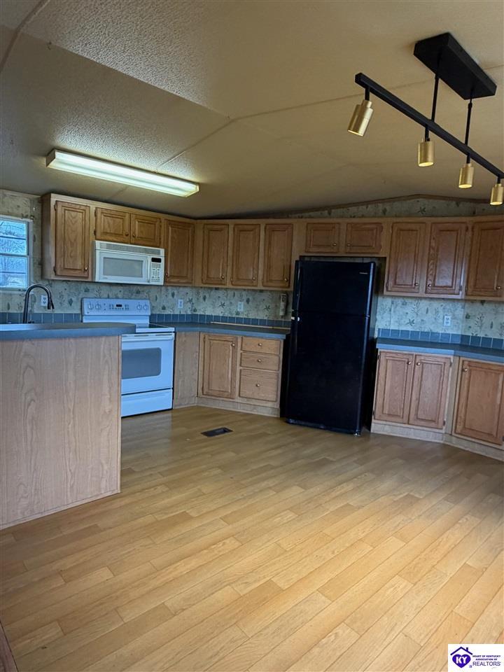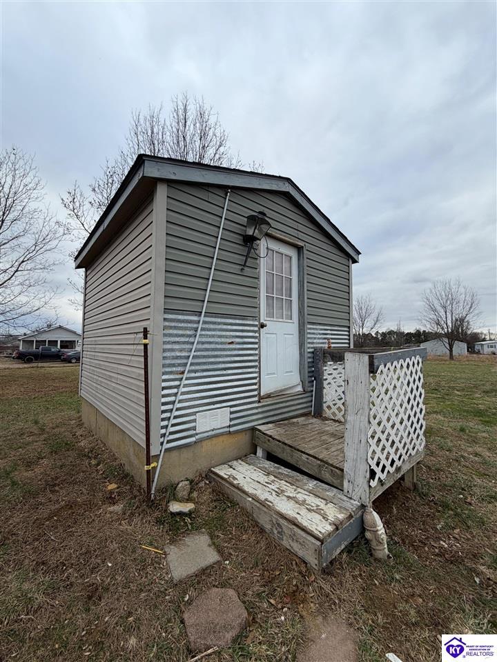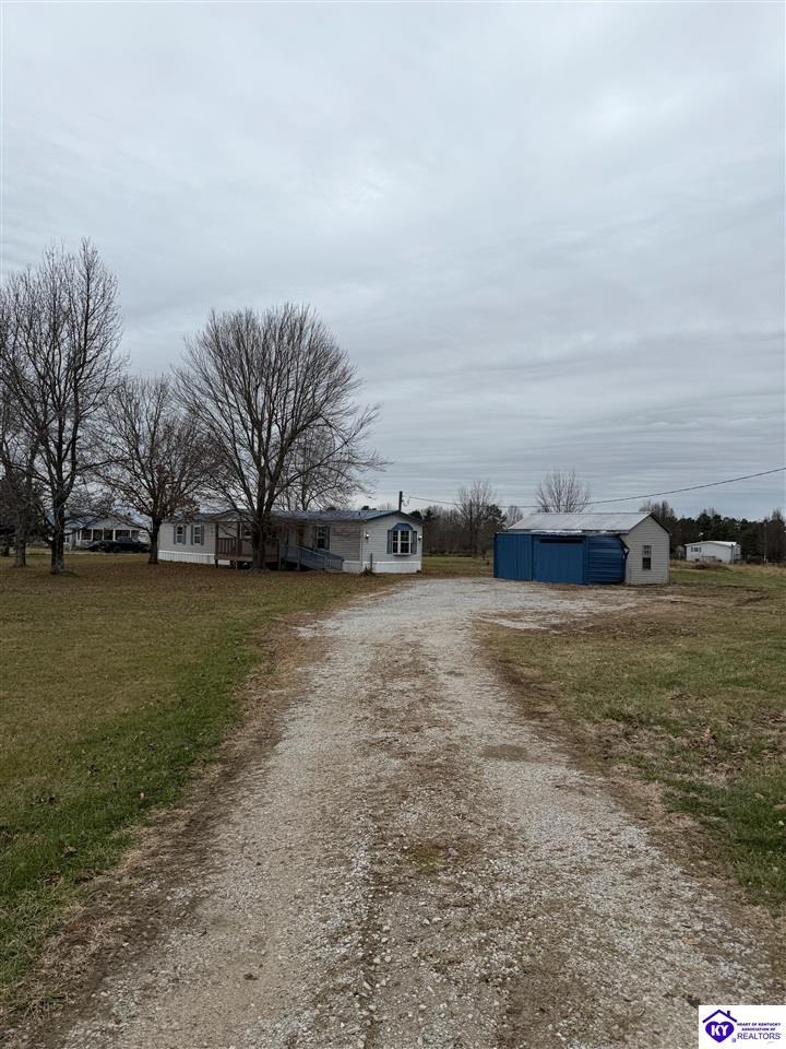 Realtor's notes: Well-maintained 2005 singlewide that has been converted to real estate, offering a comfortable and functional layout with 3 bedrooms and 2 full baths. The open floor plan provides a spacious feel, ideal for everyday living or entertaining. Situated on 2.03 acres, the property offers privacy and room to spread out, along with a 2-car garage/shop perfect for storage, hobbies, or a workshop. Additional features include an underground storm shelter, adding peace of mind. Conveniently located between Elizabethtown and Leitchfield, providing easy access to both while still enjoying a quiet, rural setting. This property is being sold as-is, and is a great opportunity for buyers seeking land, utility, and affordability in one package.