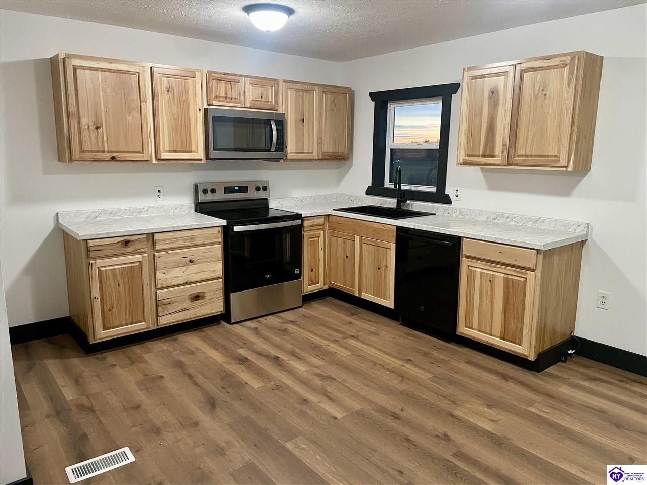 Realtor's notes: Welcome to this beautifully updated 3-bedroom, 1-bath home featuring a total of 1904 sq. ft. of living space. Highlights include high-end waterproof flooring and fresh paint throughout. All-new siding, a new durable metal roof, and new windows and doors for enhanced energy efficiency. Updated gutters and a new hot water heater. Updated kitchen with new cabinets, countertops, and appliances (dishwasher, stove, microwave). Fully finished basement for additional living space. A 34x34-foot detached garage, wrapped in new metal and featuring a new overhead garage door and an inside entry door. Plus, a convenient lean-to for extra storage. This home perfectly combines comfort, style, and functionality. Conveniently located 10 miles- less than 15 minutes- to shops and dining.