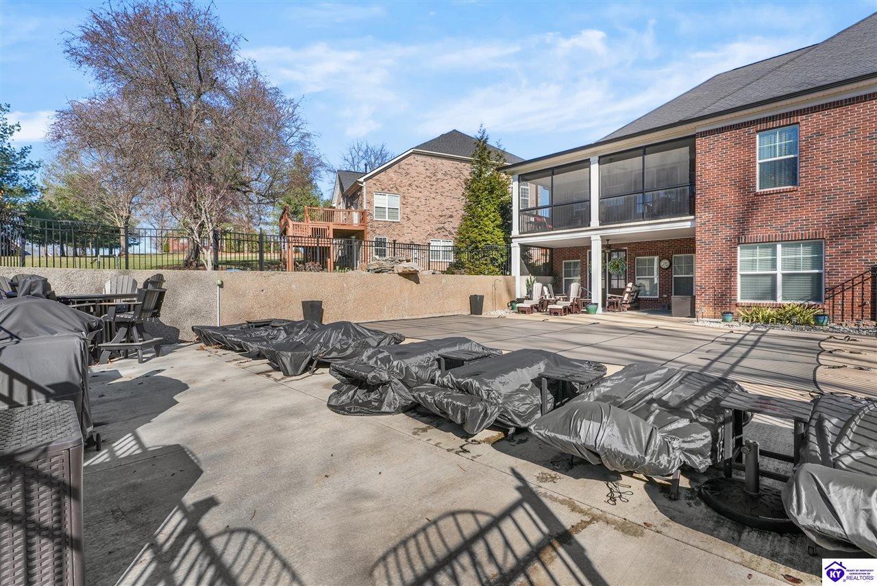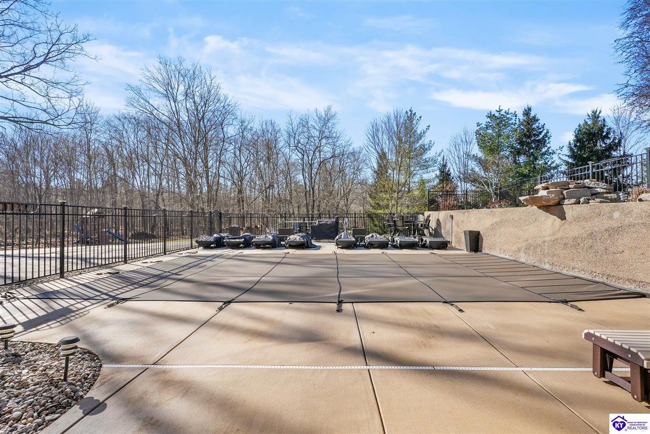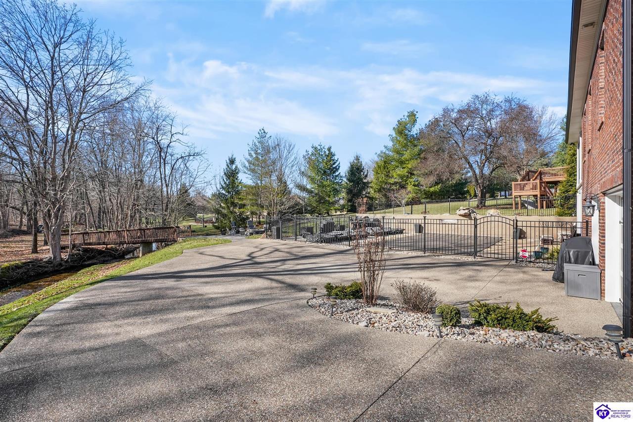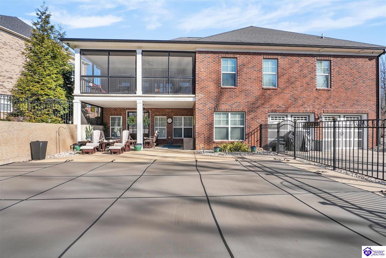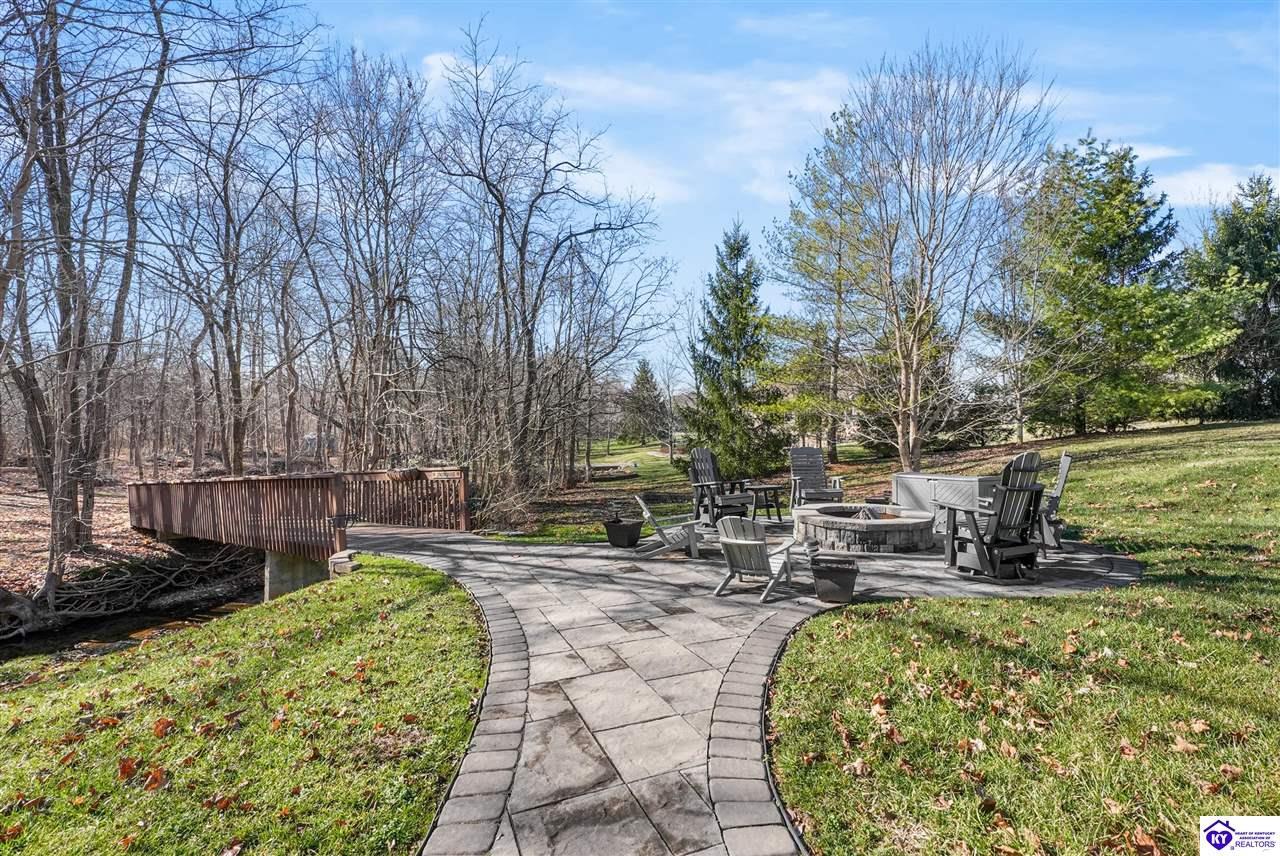Realtor's notes: Experience luxury living in this stunning custom-built estate featuring geothermal efficiency to include heat, air, floors and water, stamped concrete floors, and exquisite craftsmanship throughout. The open layout showcases soaring ceilings, one ventless gas fireplace, two electric fireplaces, plantation shutters, built-ins, and designer lighting. The gourmet kitchen impresses with Bosch appliances, leathered granite countertops, a double convection oven, subway tile backsplash, stainless farmhouse sink, accent lighting, and a large pantry. Four sets of 8-foot double doors, one leading to a screened in porch with pull-down shades, creating seamless indoor-outdoor living. The primary suite offers a retreat with tray ceiling, electric fireplace, barn doors to a custom closet, and a spa-style four-piece bath with a huge walk-in shower featuring a rain head and wand. A main level guest suite includes it's own private bath, while the lower level provides a full second living area with kitchenette, bar, theater, dining space and guest suite-which also includes an expansive four piece bath-perfect for guests or muliti-generational living. Enjoy outdoor entertaining with a natural gas-heated/salt water in-ground pool with a waterfall, firepit, and a beautiful landscaping that backs to a natural spring-fed creek, complete with a charming bridge. The creek flows year round, preventing flooding and mosquitos. The pool has a safety guard for peace of mind. This home offers two laundry/mudrooms, dual furnaces, dual water heaters, a whole house natural gas generator, six-camera security system, safe room, and two attached garages, upper garage includes a utility bay. Smart irrigation with rain gauge controls, concrete-edged landscaping, an aggregate driveway enhance curb appeal and functionality. Meticulously designed with ship-lap walls, accent lighting, and superior finishes, this estate blends efficiency, elegance, and comfort. Every detail-from the geothermal system to the luxurious living spaces-reflects quality and care. A true masterpiece offering resort style living on a breathtaking property.