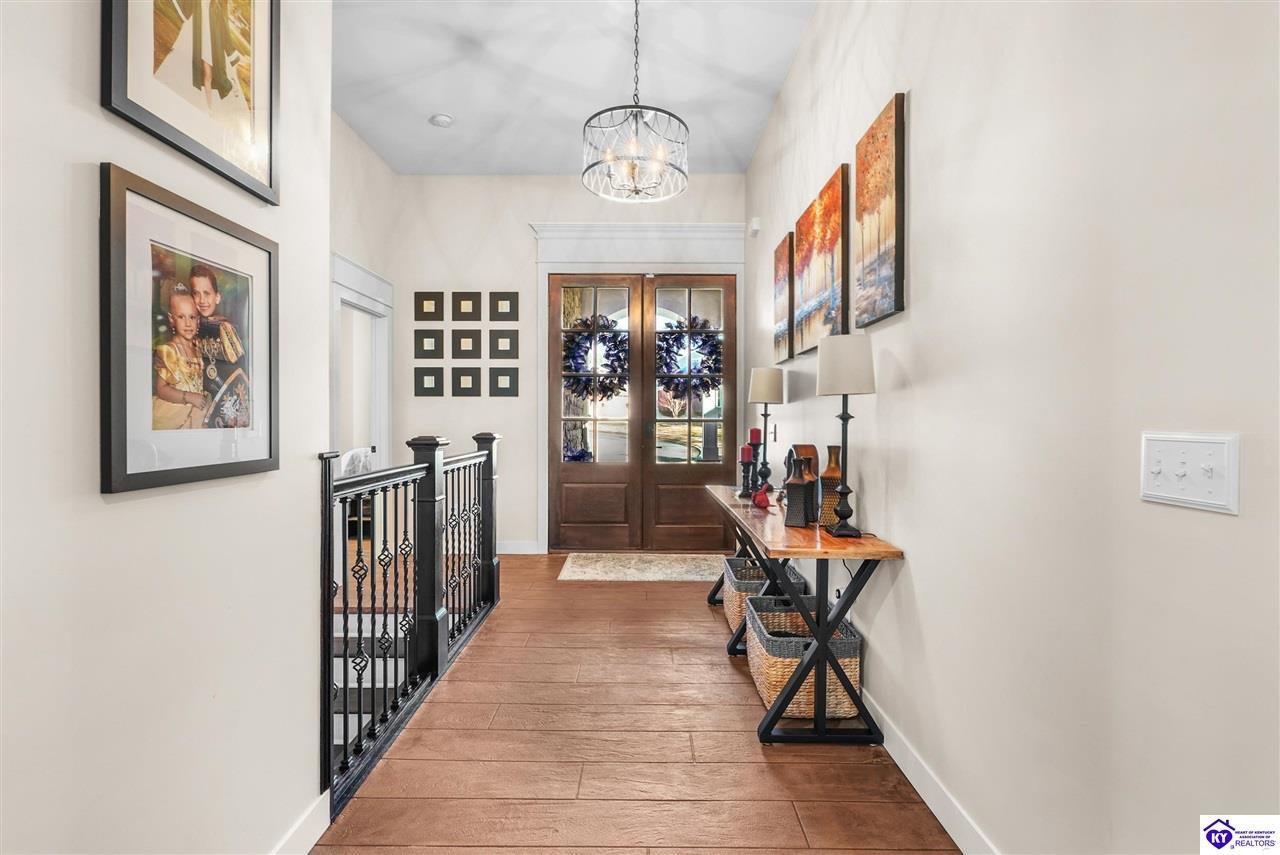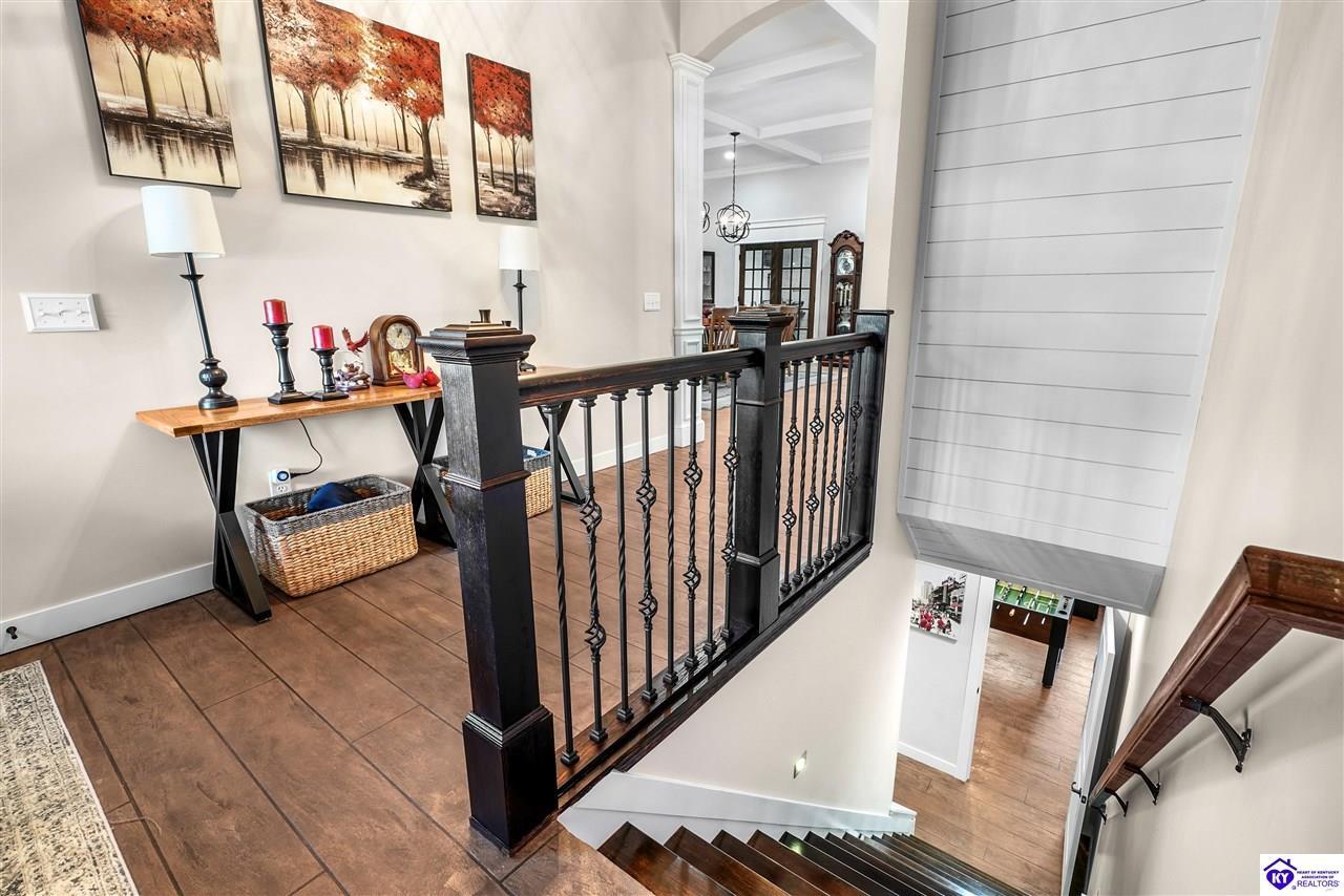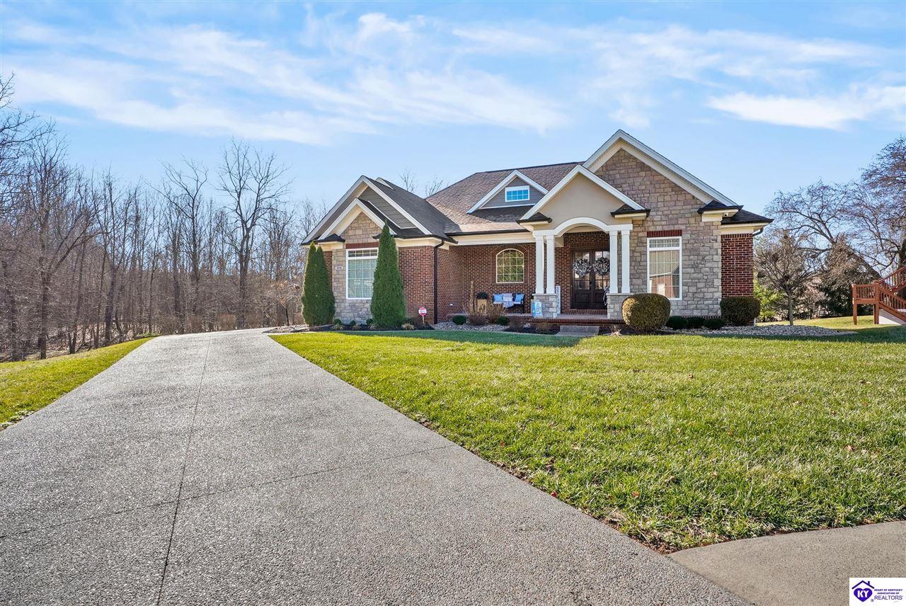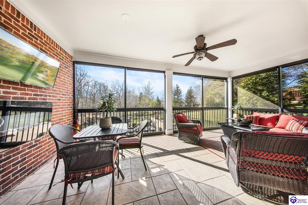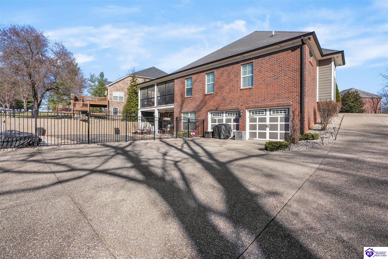 Realtor's notes: Experience luxury living in this stunning custom-built estate featuring geothermal efficiency to include heat, air, floors and water, stamped concrete floors, and exquisite craftsmanship throughout. The open layout showcases soaring ceilings, one ventless gas fireplace, two electric fireplaces, plantation shutters, built-ins, and designer lighting. The gourmet kitchen impresses with Bosch appliances, leathered granite countertops, a double convection oven, subway tile backsplash, stainless farmhouse sink, accent lighting, and a large pantry. Four sets of 8-foot double doors, one leading to a screened in porch with pull-down shades, creating seamless indoor-outdoor living. The primary suite offers a retreat with tray ceiling, electric fireplace, barn doors to a custom closet, and a spa-style four-piece bath with a huge walk-in shower featuring a rain head and wand. A main level guest suite includes it's own private bath, while the lower level provides a full second living area with kitchenette, bar, theater, dining space and guest suite-which also includes an expansive four piece bath-perfect for guests or muliti-generational living. Enjoy outdoor entertaining with a natural gas-heated/salt water in-ground pool with a waterfall, firepit, and a beautiful landscaping that backs to a natural spring-fed creek, complete with a charming bridge. The creek flows year round, preventing flooding and mosquitos. The pool has a safety guard for peace of mind. This home offers two laundry/mudrooms, dual furnaces, dual water heaters, a whole house natural gas generator, six-camera security system, safe room, and two attached garages, upper garage includes a utility bay. Smart irrigation with rain gauge controls, concrete-edged landscaping, an aggregate driveway enhance curb appeal and functionality. Meticulously designed with ship-lap walls, accent lighting, and superior finishes, this estate blends efficiency, elegance, and comfort. Every detail-from the geothermal system to the luxurious living spaces-reflects quality and care. A true masterpiece offering resort style living on a breathtaking property.