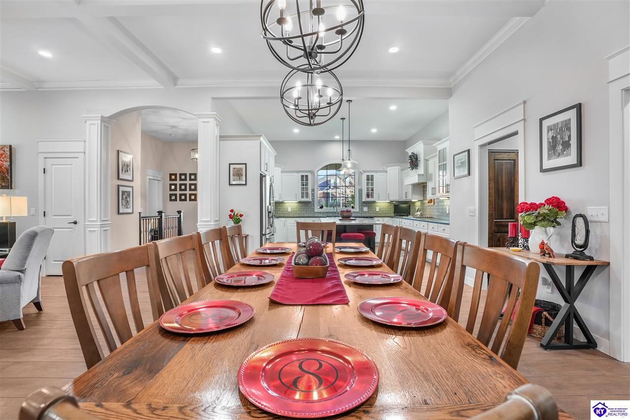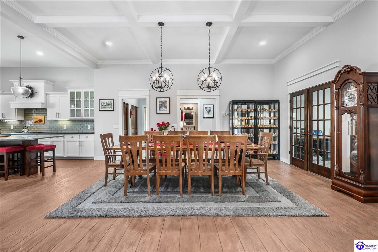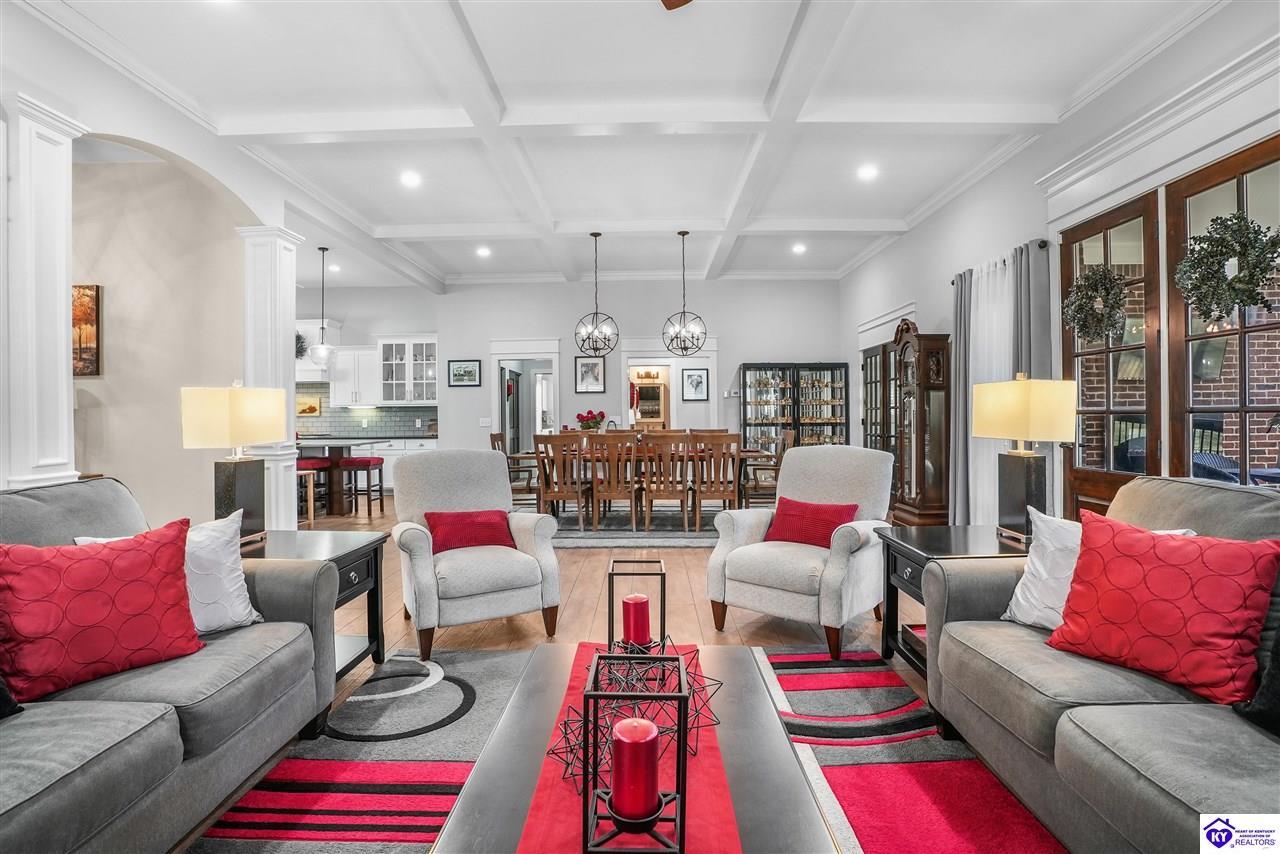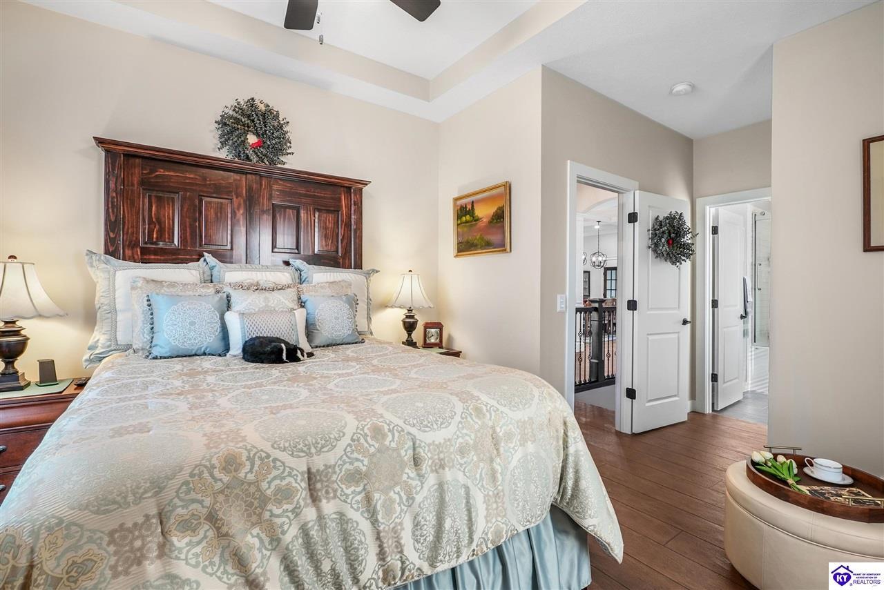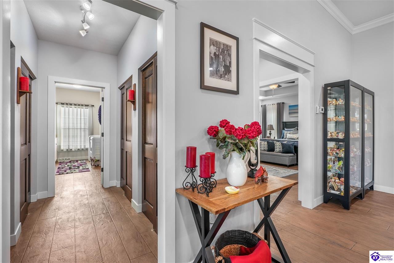Realtor's notes: Experience luxury living in this stunning custom-built estate featuring geothermal efficiency to include heat, air, floors and water, stamped concrete floors, and exquisite craftsmanship throughout. The open layout showcases soaring ceilings, one ventless gas fireplace, two electric fireplaces, plantation shutters, built-ins, and designer lighting. The gourmet kitchen impresses with Bosch appliances, leathered granite countertops, a double convection oven, subway tile backsplash, stainless farmhouse sink, accent lighting, and a large pantry. Four sets of 8-foot double doors, one leading to a screened in porch with pull-down shades, creating seamless indoor-outdoor living. The primary suite offers a retreat with tray ceiling, electric fireplace, barn doors to a custom closet, and a spa-style four-piece bath with a huge walk-in shower featuring a rain head and wand. A main level guest suite includes it's own private bath, while the lower level provides a full second living area with kitchenette, bar, theater, dining space and guest suite-which also includes an expansive four piece bath-perfect for guests or muliti-generational living. Enjoy outdoor entertaining with a natural gas-heated/salt water in-ground pool with a waterfall, firepit, and a beautiful landscaping that backs to a natural spring-fed creek, complete with a charming bridge. The creek flows year round, preventing flooding and mosquitos. The pool has a safety guard for peace of mind. This home offers two laundry/mudrooms, dual furnaces, dual water heaters, a whole house natural gas generator, six-camera security system, safe room, and two attached garages, upper garage includes a utility bay. Smart irrigation with rain gauge controls, concrete-edged landscaping, an aggregate driveway enhance curb appeal and functionality. Meticulously designed with ship-lap walls, accent lighting, and superior finishes, this estate blends efficiency, elegance, and comfort. Every detail-from the geothermal system to the luxurious living spaces-reflects quality and care. A true masterpiece offering resort style living on a breathtaking property.