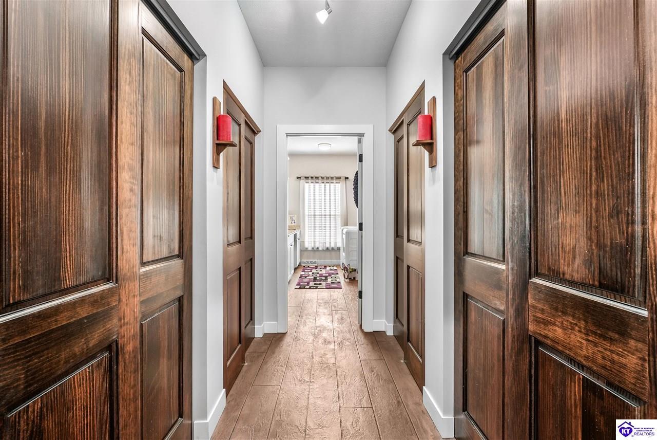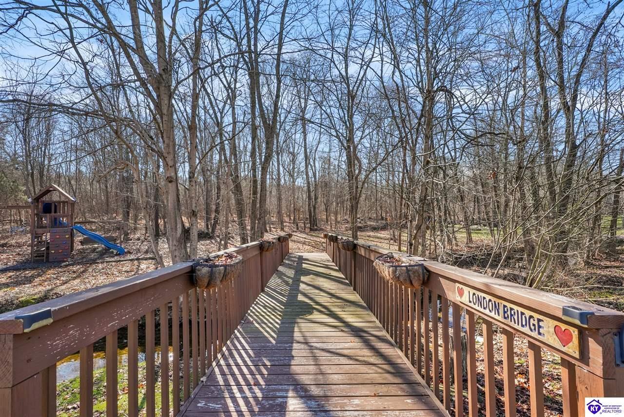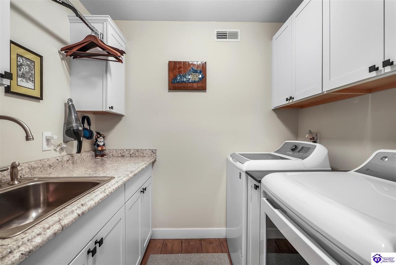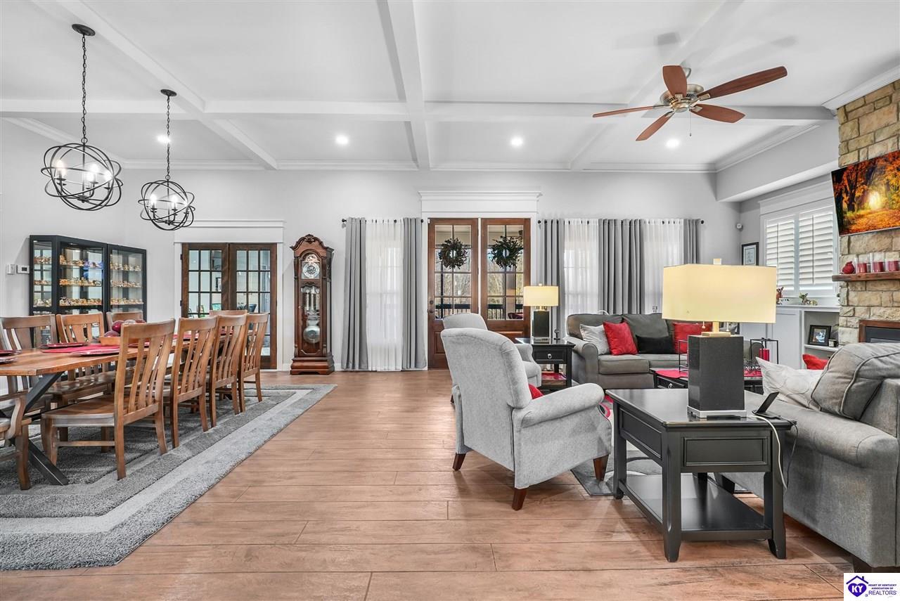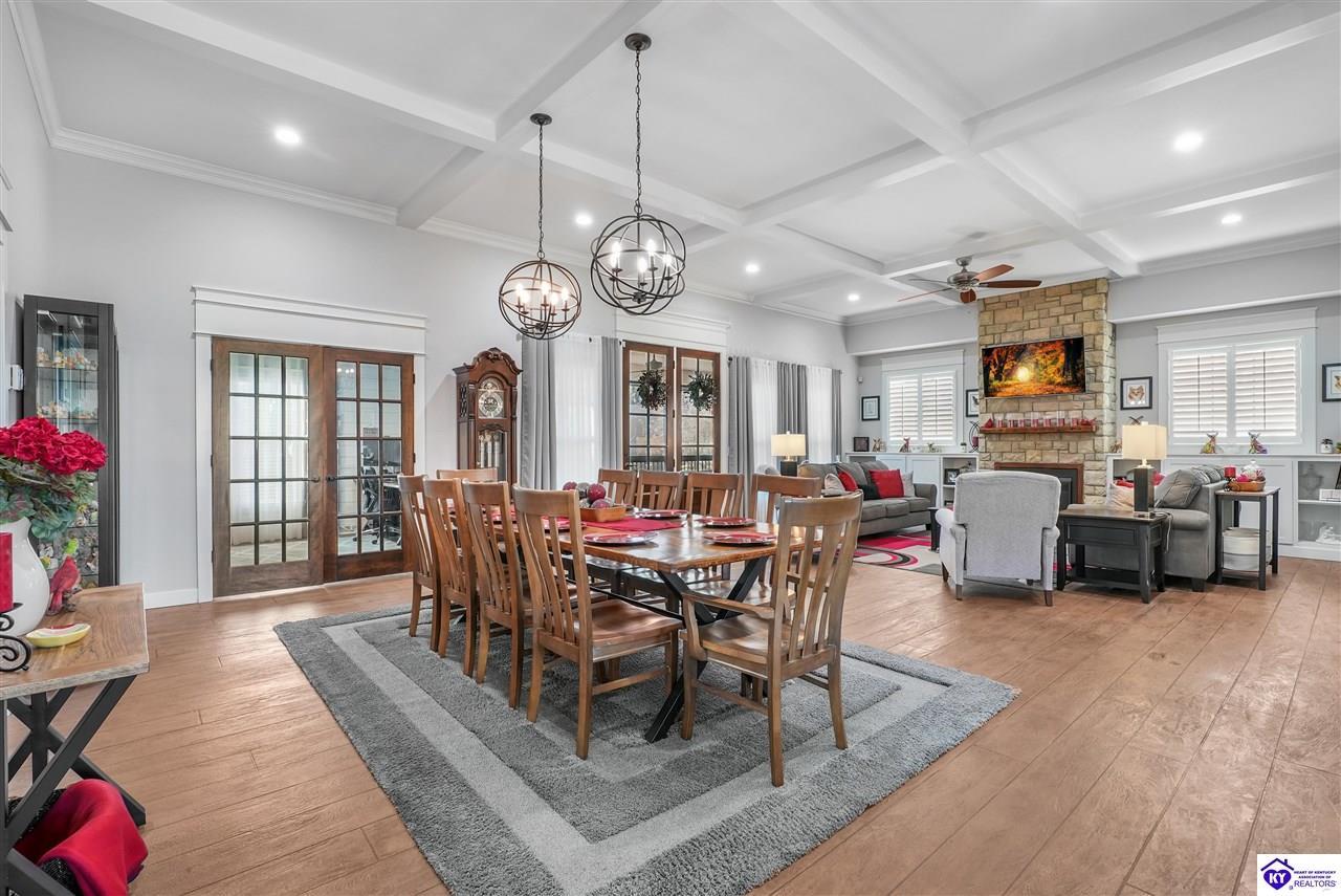 Realtor's notes: Experience luxury living in this stunning custom-built estate featuring geothermal efficiency to include heat, air, floors and water, stamped concrete floors, and exquisite craftsmanship throughout. The open layout showcases soaring ceilings, one ventless gas fireplace, two electric fireplaces, plantation shutters, built-ins, and designer lighting. The gourmet kitchen impresses with Bosch appliances, leathered granite countertops, a double convection oven, subway tile backsplash, stainless farmhouse sink, accent lighting, and a large pantry. Four sets of 8-foot double doors, one leading to a screened in porch with pull-down shades, creating seamless indoor-outdoor living. The primary suite offers a retreat with tray ceiling, electric fireplace, barn doors to a custom closet, and a spa-style four-piece bath with a huge walk-in shower featuring a rain head and wand. A main level guest suite includes it's own private bath, while the lower level provides a full second living area with kitchenette, bar, theater, dining space and guest suite-which also includes an expansive four piece bath-perfect for guests or muliti-generational living. Enjoy outdoor entertaining with a natural gas-heated/salt water in-ground pool with a waterfall, firepit, and a beautiful landscaping that backs to a natural spring-fed creek, complete with a charming bridge. The creek flows year round, preventing flooding and mosquitos. The pool has a safety guard for peace of mind. This home offers two laundry/mudrooms, dual furnaces, dual water heaters, a whole house natural gas generator, six-camera security system, safe room, and two attached garages, upper garage includes a utility bay. Smart irrigation with rain gauge controls, concrete-edged landscaping, an aggregate driveway enhance curb appeal and functionality. Meticulously designed with ship-lap walls, accent lighting, and superior finishes, this estate blends efficiency, elegance, and comfort. Every detail-from the geothermal system to the luxurious living spaces-reflects quality and care. A true masterpiece offering resort style living on a breathtaking property.