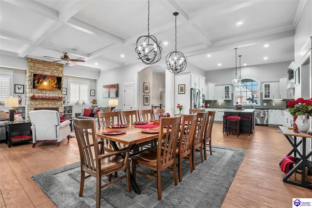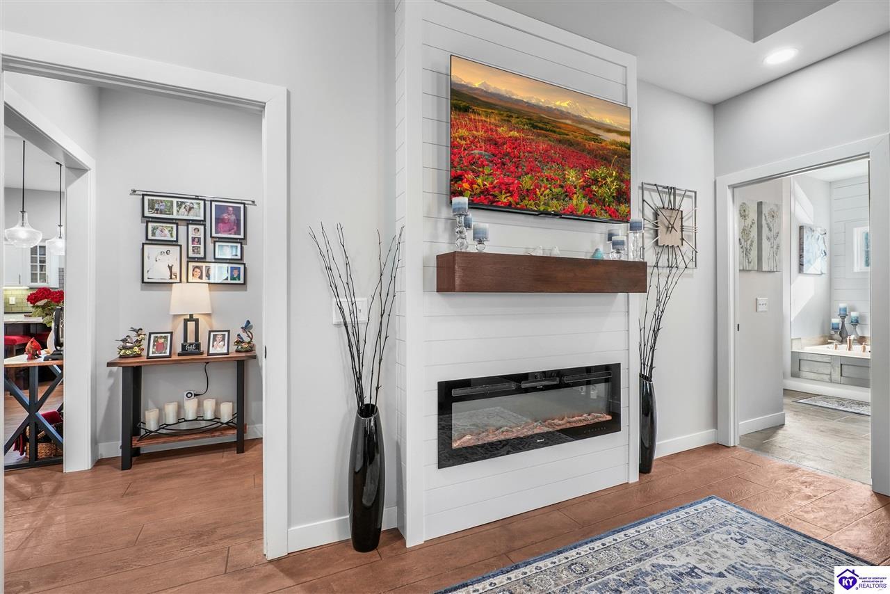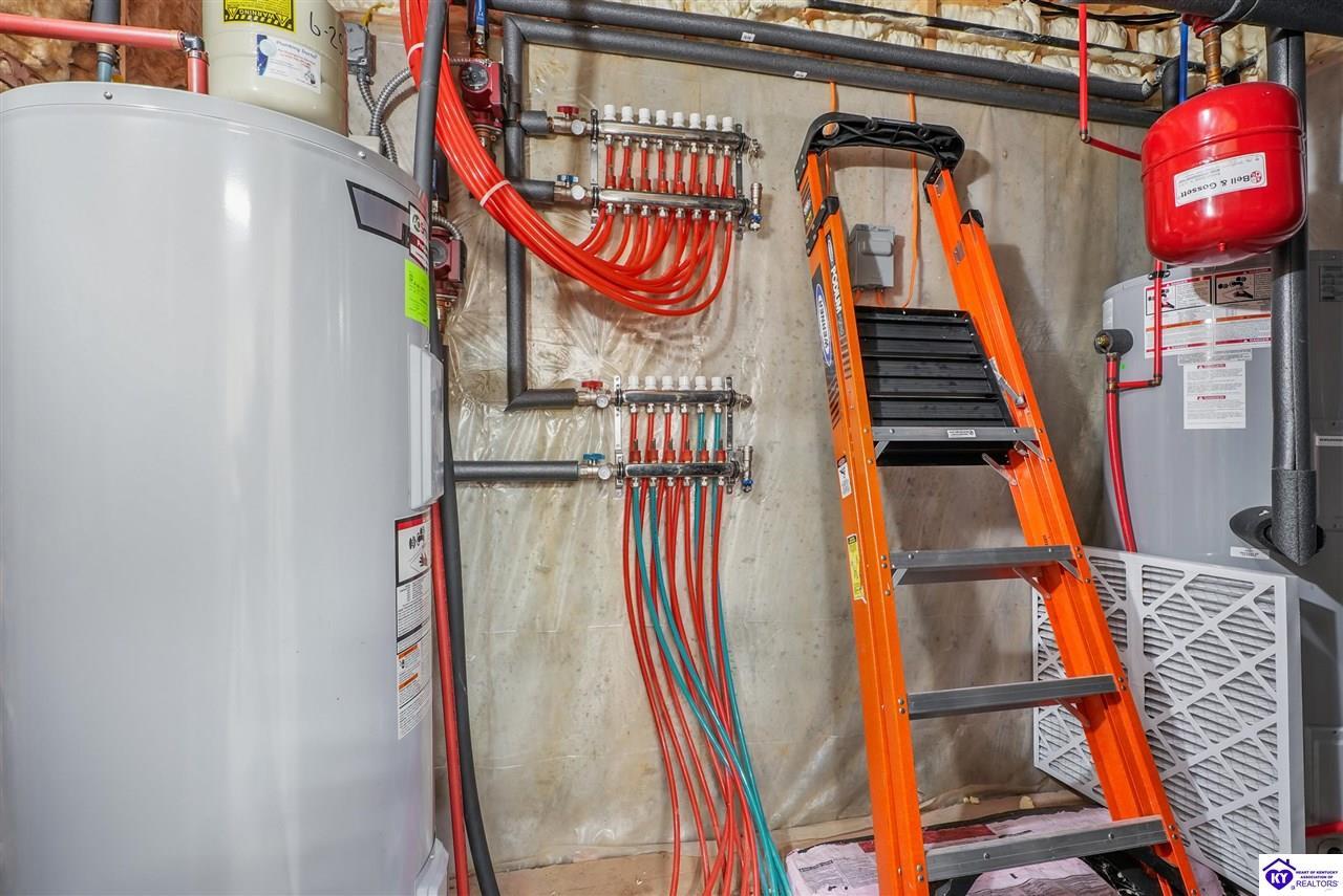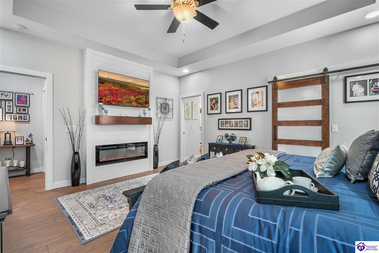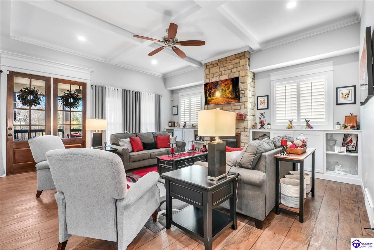 Realtor's notes: Experience luxury living in this stunning custom-built estate featuring geothermal efficiency to include heat, air, floors and water, stamped concrete floors, and exquisite craftsmanship throughout. The open layout showcases soaring ceilings, one ventless gas fireplace, two electric fireplaces, plantation shutters, built-ins, and designer lighting. The gourmet kitchen impresses with Bosch appliances, leathered granite countertops, a double convection oven, subway tile backsplash, stainless farmhouse sink, accent lighting, and a large pantry. Four sets of 8-foot double doors, one leading to a screened in porch with pull-down shades, creating seamless indoor-outdoor living. The primary suite offers a retreat with tray ceiling, electric fireplace, barn doors to a custom closet, and a spa-style four-piece bath with a huge walk-in shower featuring a rain head and wand. A main level guest suite includes it's own private bath, while the lower level provides a full second living area with kitchenette, bar, theater, dining space and guest suite-which also includes an expansive four piece bath-perfect for guests or muliti-generational living. Enjoy outdoor entertaining with a natural gas-heated/salt water in-ground pool with a waterfall, firepit, and a beautiful landscaping that backs to a natural spring-fed creek, complete with a charming bridge. The creek flows year round, preventing flooding and mosquitos. The pool has a safety guard for peace of mind. This home offers two laundry/mudrooms, dual furnaces, dual water heaters, a whole house natural gas generator, six-camera security system, safe room, and two attached garages, upper garage includes a utility bay. Smart irrigation with rain gauge controls, concrete-edged landscaping, an aggregate driveway enhance curb appeal and functionality. Meticulously designed with ship-lap walls, accent lighting, and superior finishes, this estate blends efficiency, elegance, and comfort. Every detail-from the geothermal system to the luxurious living spaces-reflects quality and care. A true masterpiece offering resort style living on a breathtaking property.