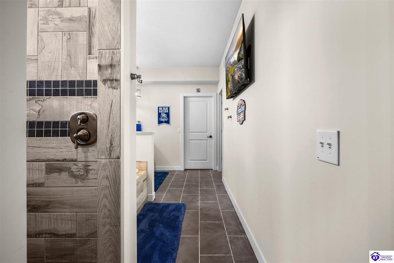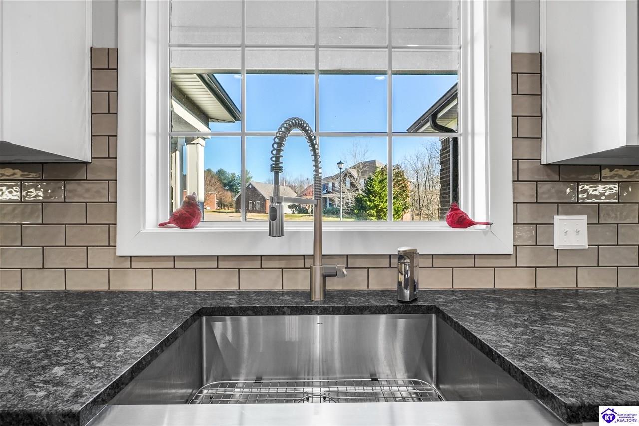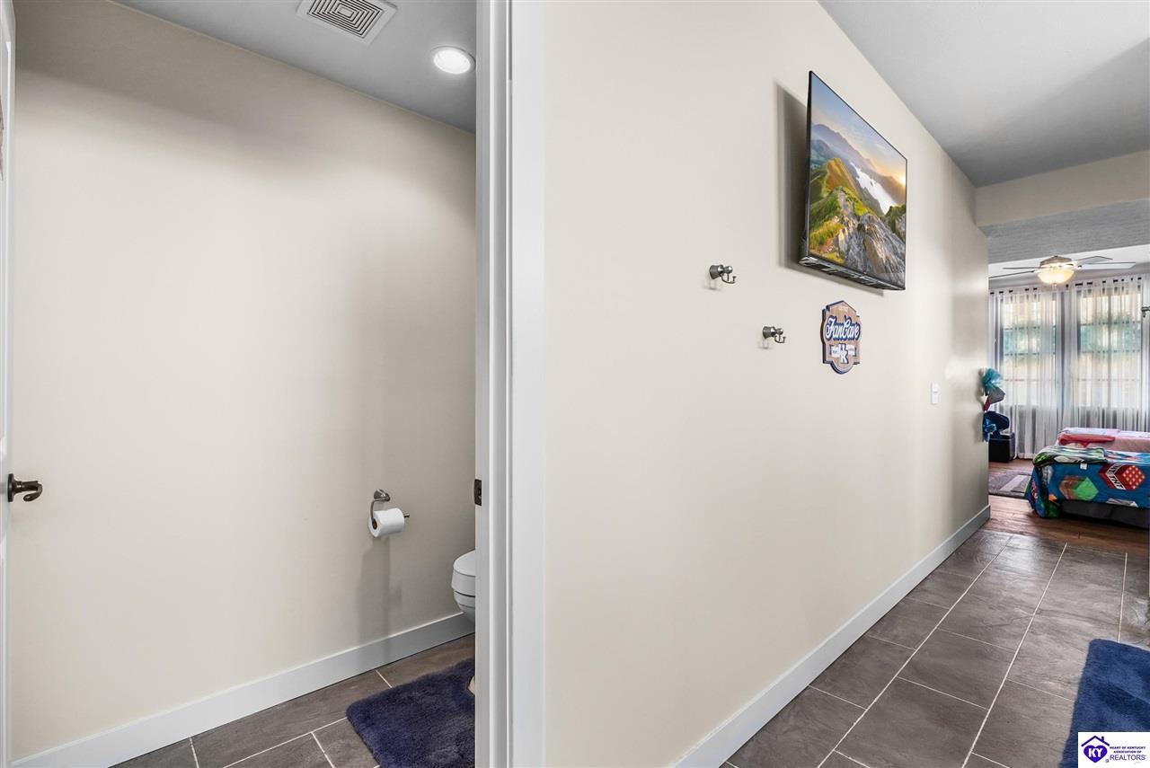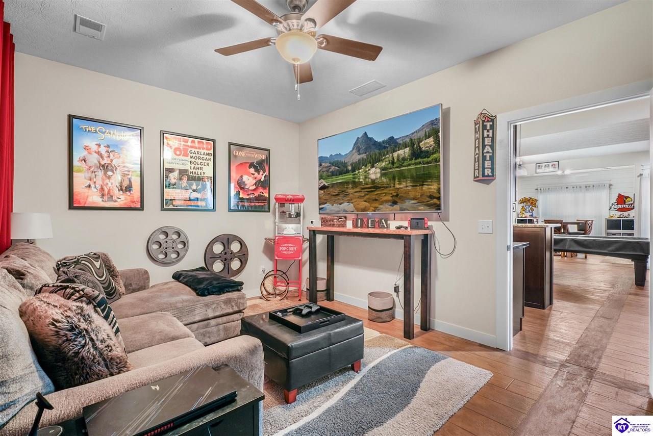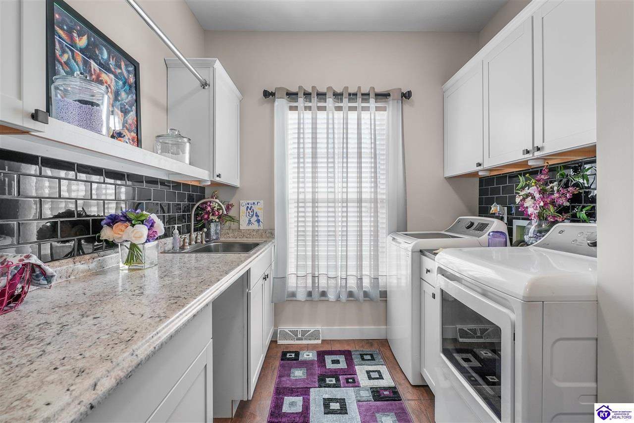 Realtor's notes: Experience luxury living in this stunning custom-built estate featuring geothermal efficiency to include heat, air, floors and water, stamped concrete floors, and exquisite craftsmanship throughout. The open layout showcases soaring ceilings, one ventless gas fireplace, two electric fireplaces, plantation shutters, built-ins, and designer lighting. The gourmet kitchen impresses with Bosch appliances, leathered granite countertops, a double convection oven, subway tile backsplash, stainless farmhouse sink, accent lighting, and a large pantry. Four sets of 8-foot double doors, one leading to a screened in porch with pull-down shades, creating seamless indoor-outdoor living. The primary suite offers a retreat with tray ceiling, electric fireplace, barn doors to a custom closet, and a spa-style four-piece bath with a huge walk-in shower featuring a rain head and wand. A main level guest suite includes it's own private bath, while the lower level provides a full second living area with kitchenette, bar, theater, dining space and guest suite-which also includes an expansive four piece bath-perfect for guests or muliti-generational living. Enjoy outdoor entertaining with a natural gas-heated/salt water in-ground pool with a waterfall, firepit, and a beautiful landscaping that backs to a natural spring-fed creek, complete with a charming bridge. The creek flows year round, preventing flooding and mosquitos. The pool has a safety guard for peace of mind. This home offers two laundry/mudrooms, dual furnaces, dual water heaters, a whole house natural gas generator, six-camera security system, safe room, and two attached garages, upper garage includes a utility bay. Smart irrigation with rain gauge controls, concrete-edged landscaping, an aggregate driveway enhance curb appeal and functionality. Meticulously designed with ship-lap walls, accent lighting, and superior finishes, this estate blends efficiency, elegance, and comfort. Every detail-from the geothermal system to the luxurious living spaces-reflects quality and care. A true masterpiece offering resort style living on a breathtaking property.