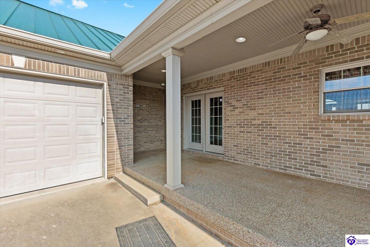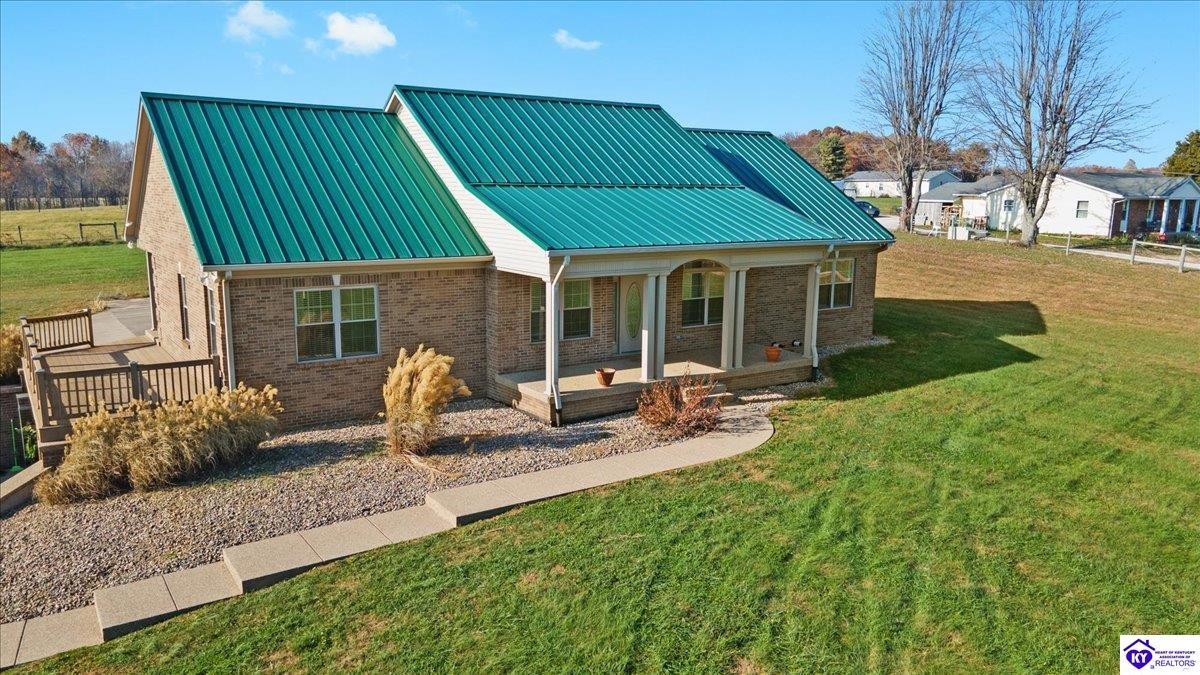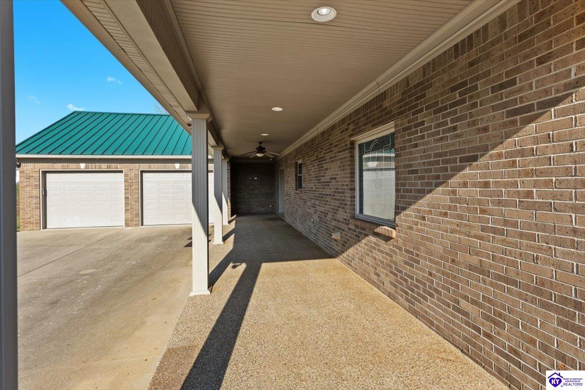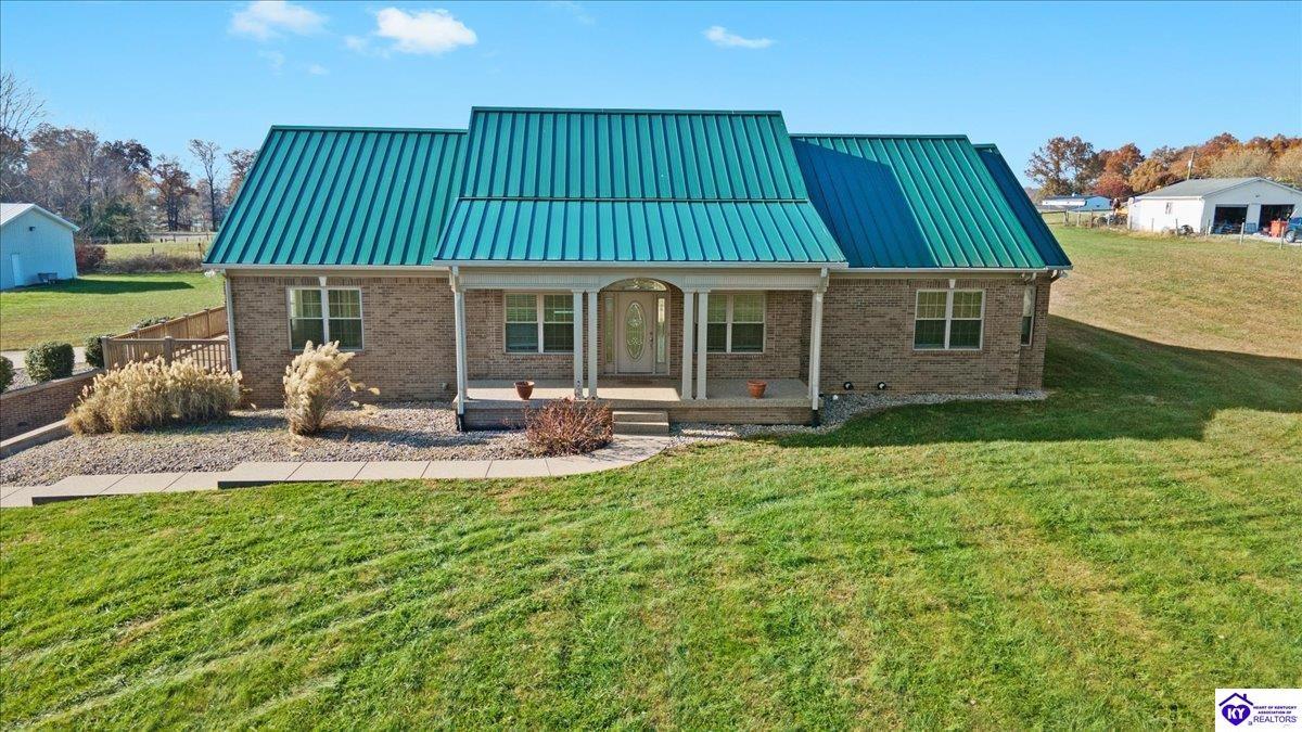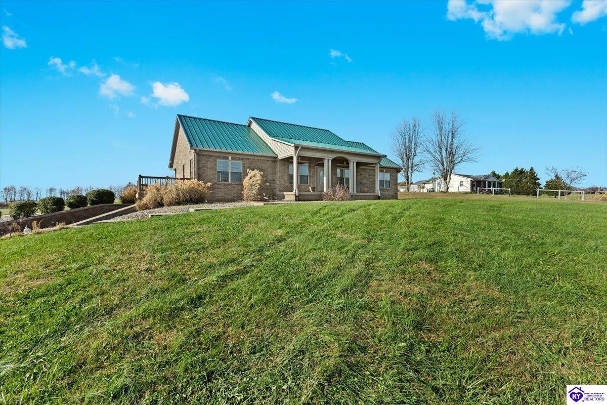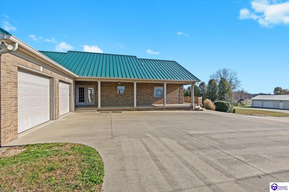 Realtor's notes: Custom brick ranch on 5.5 fenced acres with two stocked ponds, over 4,000 sq ft of finished living space, and a fully finished walkout basement. Built in 2007 with 2x6 exterior walls, this home features geothermal heating, 3-zone HVAC, tankless water heater, and is wired for security—designed for efficiency and long-term durability. The open-concept main level offers real hardwood floors, solid white oak cabinetry, granite countertops, stainless steel appliances, a large island with bar seating, double ovens, vented hood, and walk-in pantry. The main floor includes 3 bedrooms, 2 full baths, and a tiled laundry room. The primary suite features a tray ceiling, oversized walk-in closet, double vanity, jetted soaking tub, and walk-in tile shower. The walkout basement adds exceptional flexibility with a large recreation space, bar area, bonus room, third full bath, and oversized storage rooms, including one secured with a fireproof safe door. Double patio doors lead to a spacious concrete patio. Exterior highlights include a metal roof, covered front and back concrete patios, attached 2-car garage, all-concrete driveway, and two detached shop buildings with electric and water: a 40x30 three-bay shop and a 30x60 four-bay shop. Peaceful rural setting with quick access to Elizabethtown, Fort Knox, Rineyville, and Radcliff. A rare opportunity offering acreage, energy efficiency, shop space, and timeless construction.