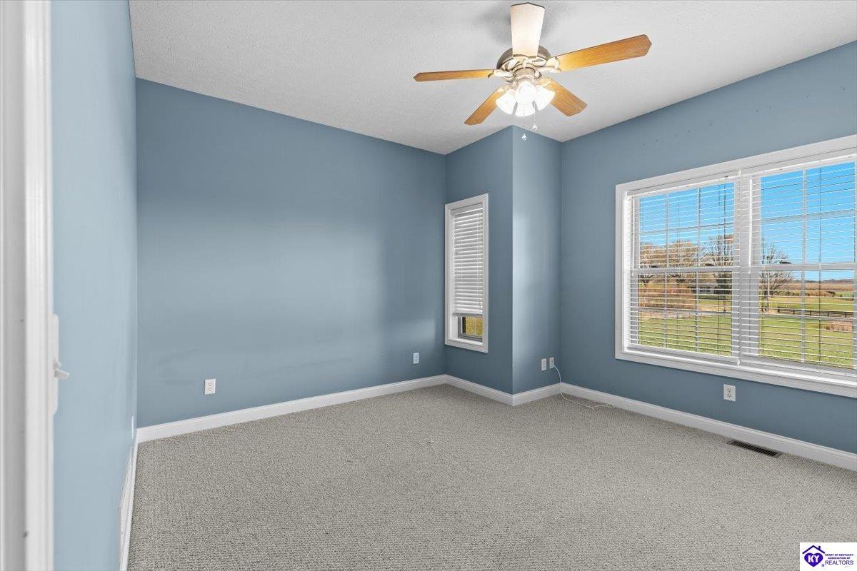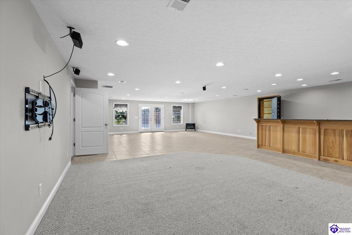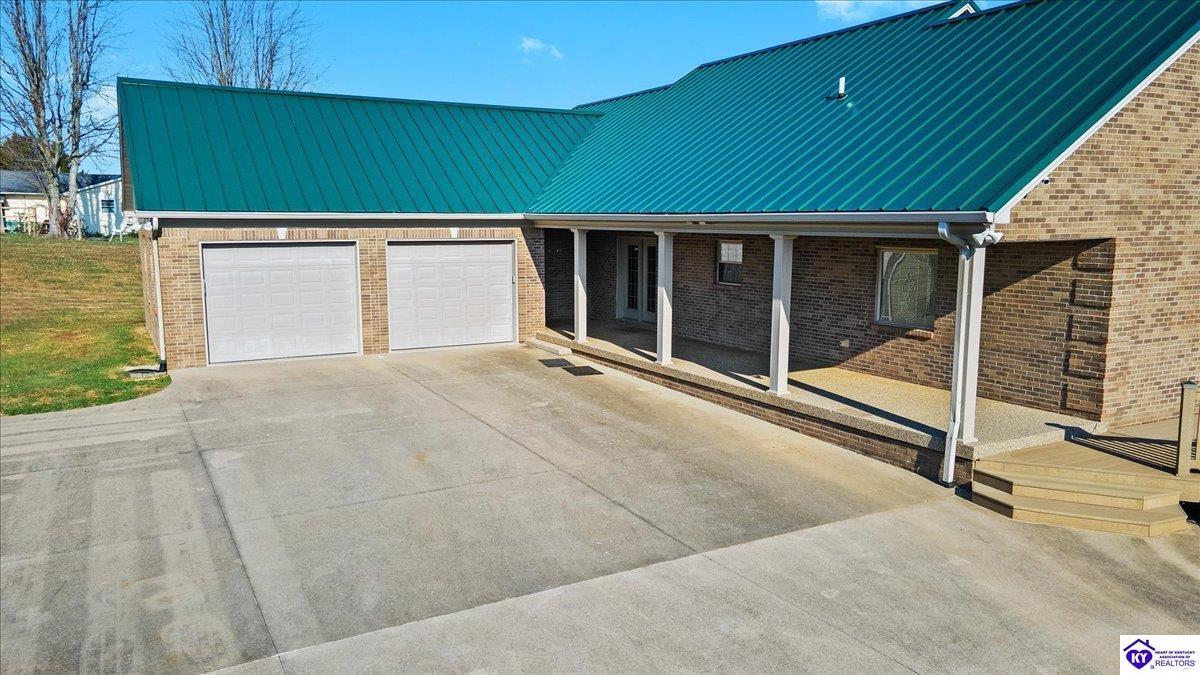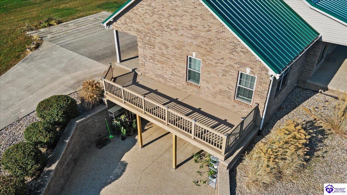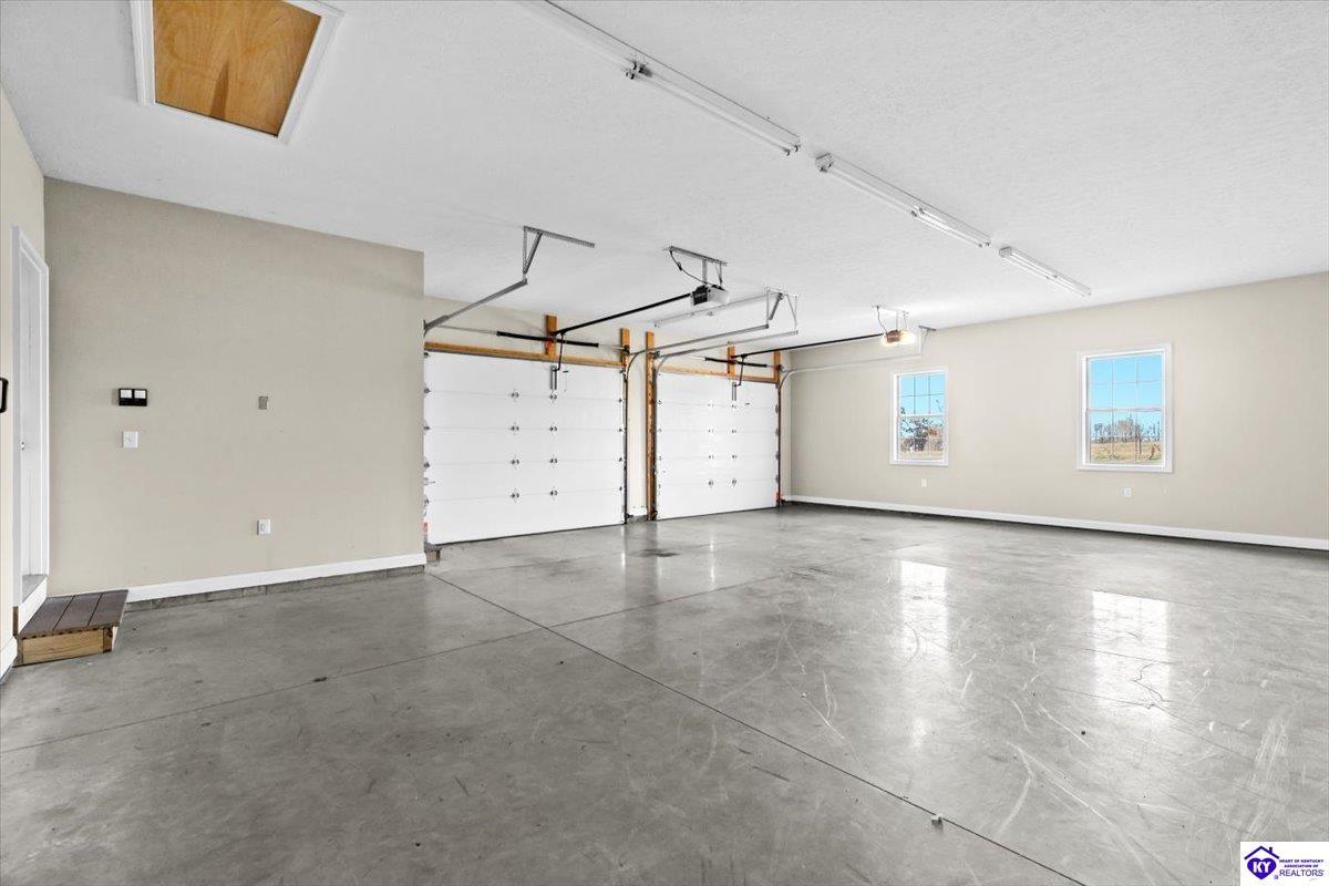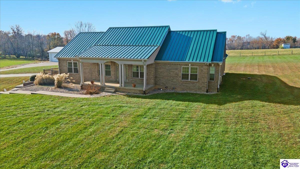 Realtor's notes: Custom brick ranch on 5.5 fenced acres with two stocked ponds, over 4,000 sq ft of finished living space, and a fully finished walkout basement. Built in 2007 with 2x6 exterior walls, this home features geothermal heating, 3-zone HVAC, tankless water heater, and is wired for security—designed for efficiency and long-term durability. The open-concept main level offers real hardwood floors, solid white oak cabinetry, granite countertops, stainless steel appliances, a large island with bar seating, double ovens, vented hood, and walk-in pantry. The main floor includes 3 bedrooms, 2 full baths, and a tiled laundry room. The primary suite features a tray ceiling, oversized walk-in closet, double vanity, jetted soaking tub, and walk-in tile shower. The walkout basement adds exceptional flexibility with a large recreation space, bar area, bonus room, third full bath, and oversized storage rooms, including one secured with a fireproof safe door. Double patio doors lead to a spacious concrete patio. Exterior highlights include a metal roof, covered front and back concrete patios, attached 2-car garage, all-concrete driveway, and two detached shop buildings with electric and water: a 40x30 three-bay shop and a 30x60 four-bay shop. Peaceful rural setting with quick access to Elizabethtown, Fort Knox, Rineyville, and Radcliff. A rare opportunity offering acreage, energy efficiency, shop space, and timeless construction.