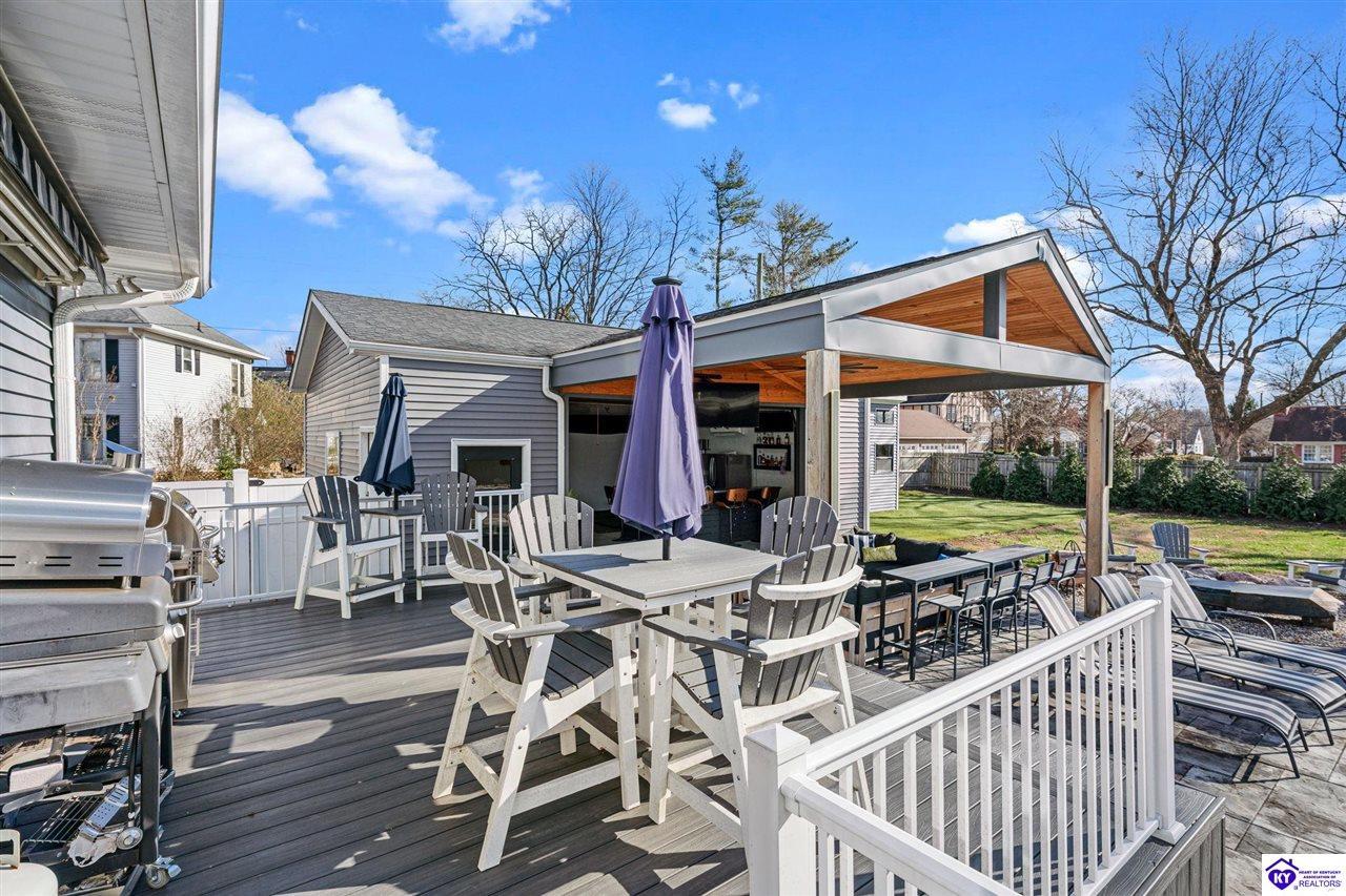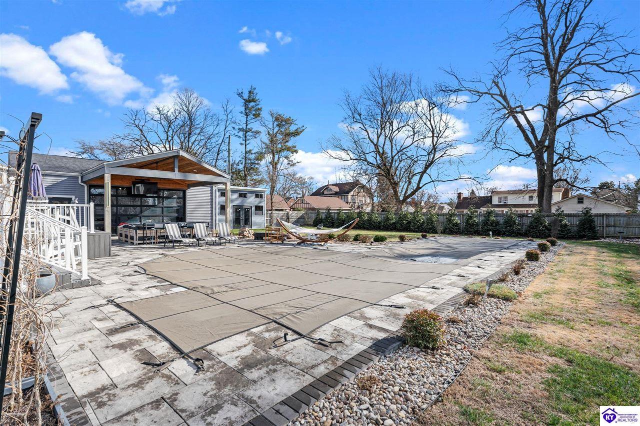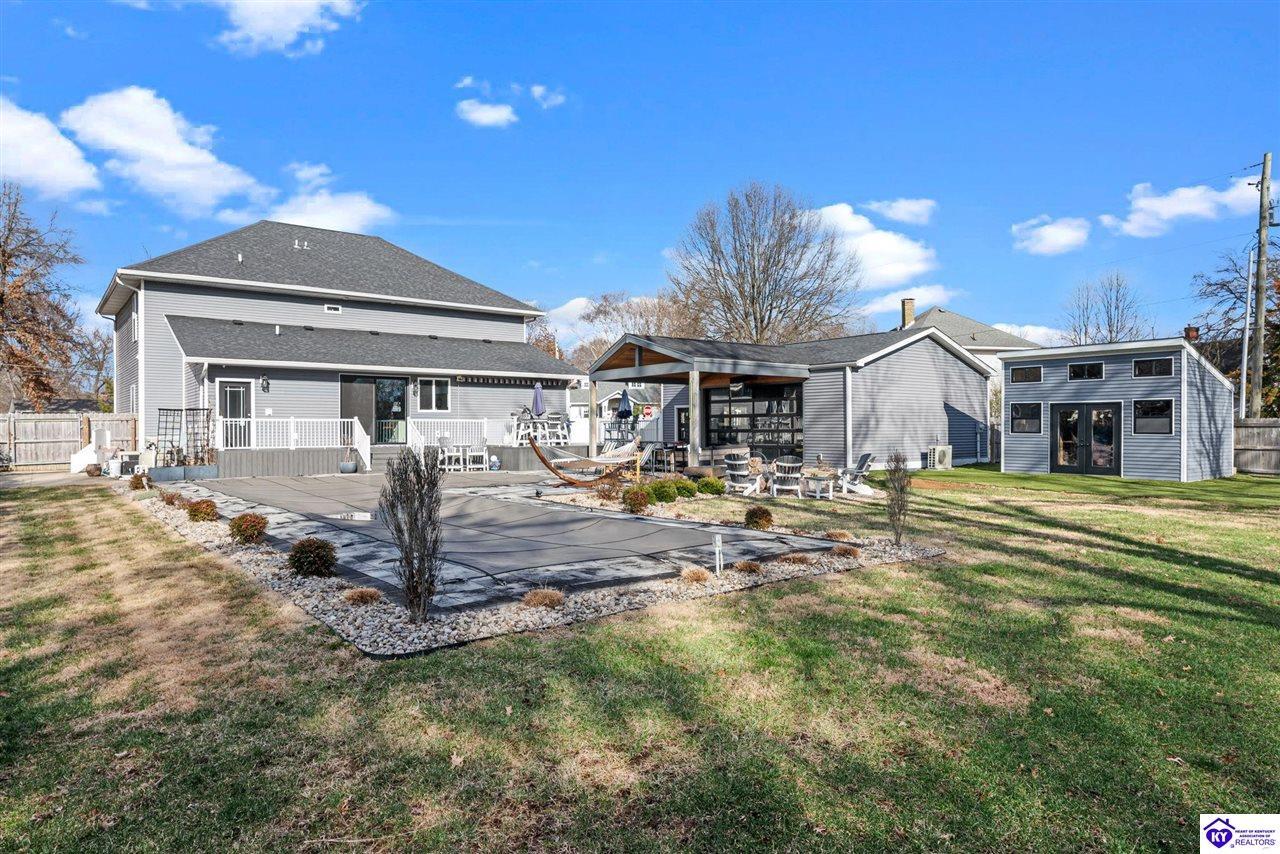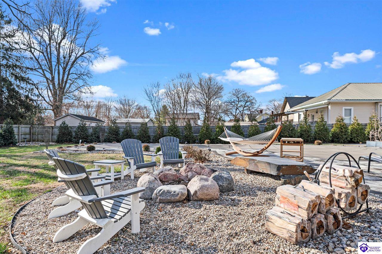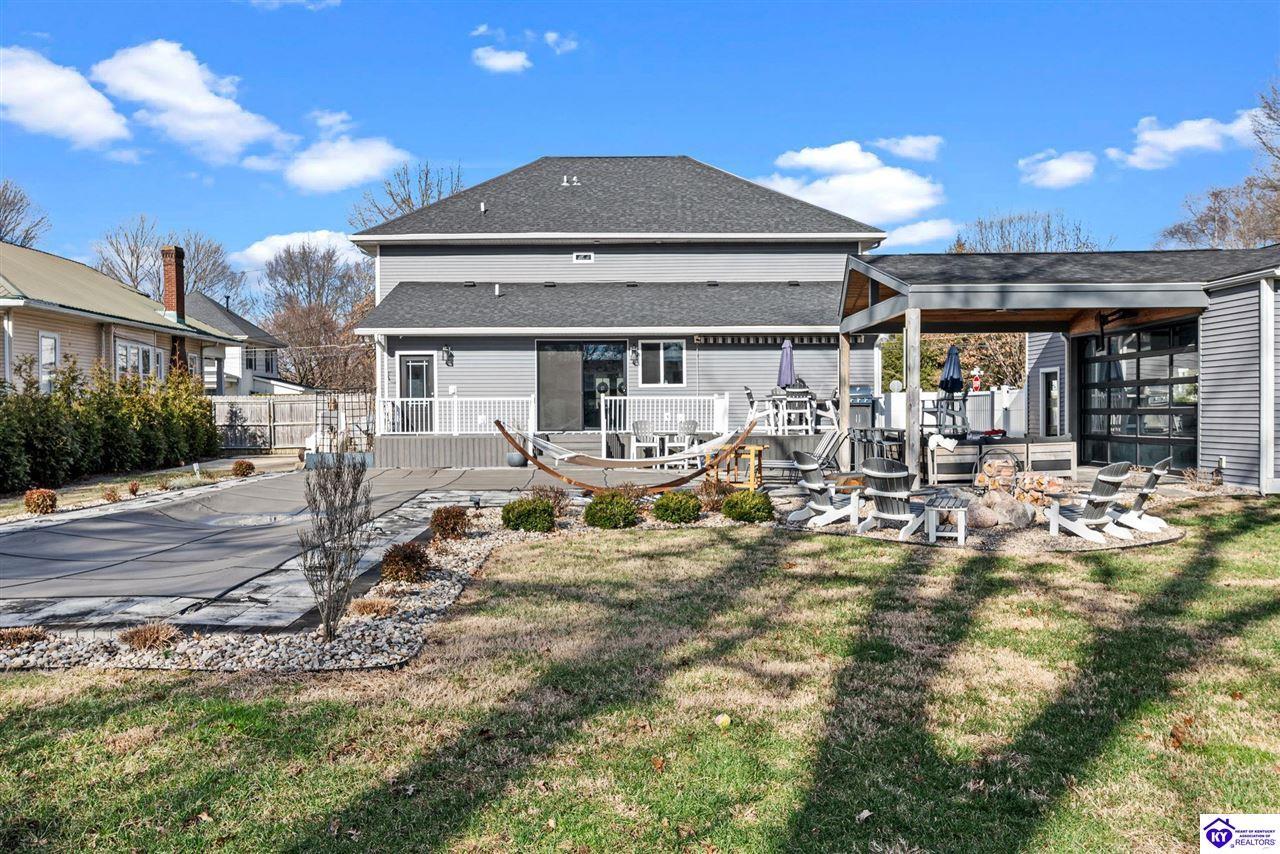 Realtor's notes: Chic modern design meets exceptional outdoor living in this beautifully remodeled home, where large windows frame sweeping views of the custom in-ground pool by Dixie Yard Works, multiple outdoor patios, and the striking pool house. Situated on a desirable corner lot within walking distance of downtown Elizabethtown, the home is filled with natural light, soaring ceilings, and hardwood floors that flow effortlessly throughout, creating a bright and welcoming atmosphere ideal for both everyday living and entertaining. The open-concept layout centers around a gourmet kitchen with granite countertops, high-end appliances, and stylish cabinetry, seamlessly connecting the kitchen, dining, and living areas. The primary suite offers a true retreat with a spa-inspired bathroom featuring modern finishes, a soaking tub, and a tiled walk-in shower with multiple shower heads. Thoughtfully designed for functionality, the home includes laundry rooms on both the main and second levels, along with a dedicated office, large mudroom, Jack-and-Jill bathroom, and a third-level flex space that adapts easily to your needs. Outdoor living truly sets this home apart. Enjoy summer days by the sparkling custom pool or unwind in the private pool house, complete with sleek glass garage doors, a bar area, and flexible space for a game room or fitness studio. The exterior is equally impressive with a covered patio featuring wood ceiling details, custom hardscaping, and an expansive front porch, making this exceptional property a rare opportunity in a prime location.