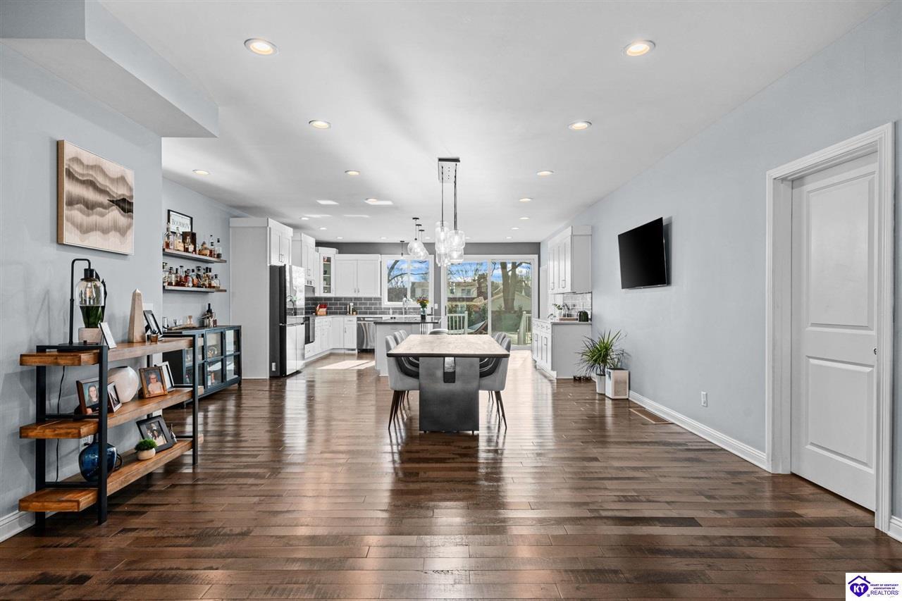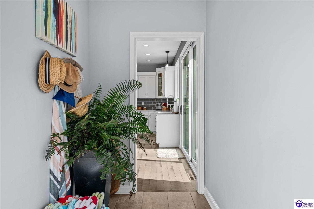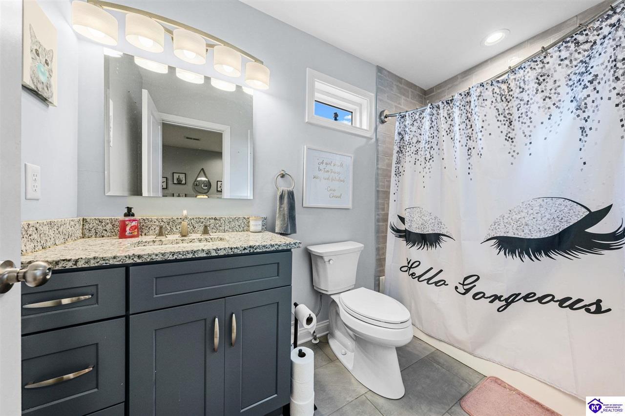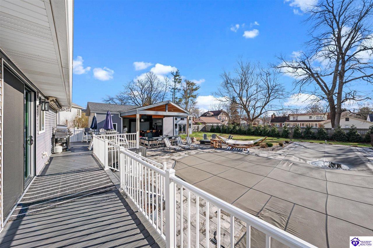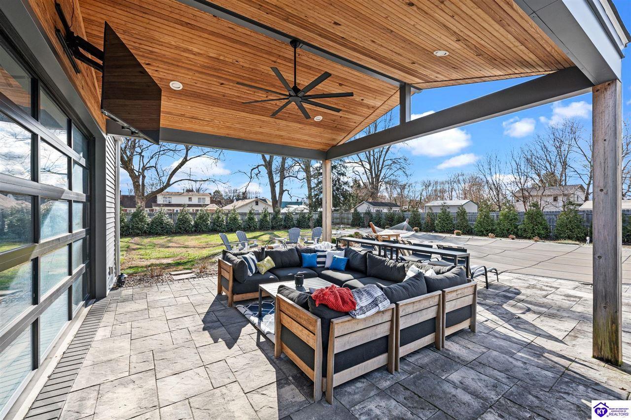Realtor's notes: Chic modern design meets exceptional outdoor living in this beautifully remodeled home, where large windows frame sweeping views of the custom in-ground pool by Dixie Yard Works, multiple outdoor patios, and the striking pool house. Situated on a desirable corner lot within walking distance of downtown Elizabethtown, the home is filled with natural light, soaring ceilings, and hardwood floors that flow effortlessly throughout, creating a bright and welcoming atmosphere ideal for both everyday living and entertaining. The open-concept layout centers around a gourmet kitchen with granite countertops, high-end appliances, and stylish cabinetry, seamlessly connecting the kitchen, dining, and living areas. The primary suite offers a true retreat with a spa-inspired bathroom featuring modern finishes, a soaking tub, and a tiled walk-in shower with multiple shower heads. Thoughtfully designed for functionality, the home includes laundry rooms on both the main and second levels, along with a dedicated office, large mudroom, Jack-and-Jill bathroom, and a third-level flex space that adapts easily to your needs. Outdoor living truly sets this home apart. Enjoy summer days by the sparkling custom pool or unwind in the private pool house, complete with sleek glass garage doors, a bar area, and flexible space for a game room or fitness studio. The exterior is equally impressive with a covered patio featuring wood ceiling details, custom hardscaping, and an expansive front porch, making this exceptional property a rare opportunity in a prime location.
