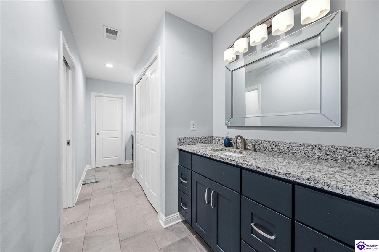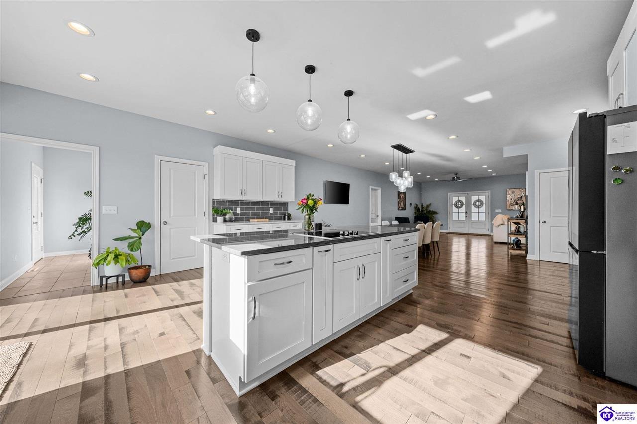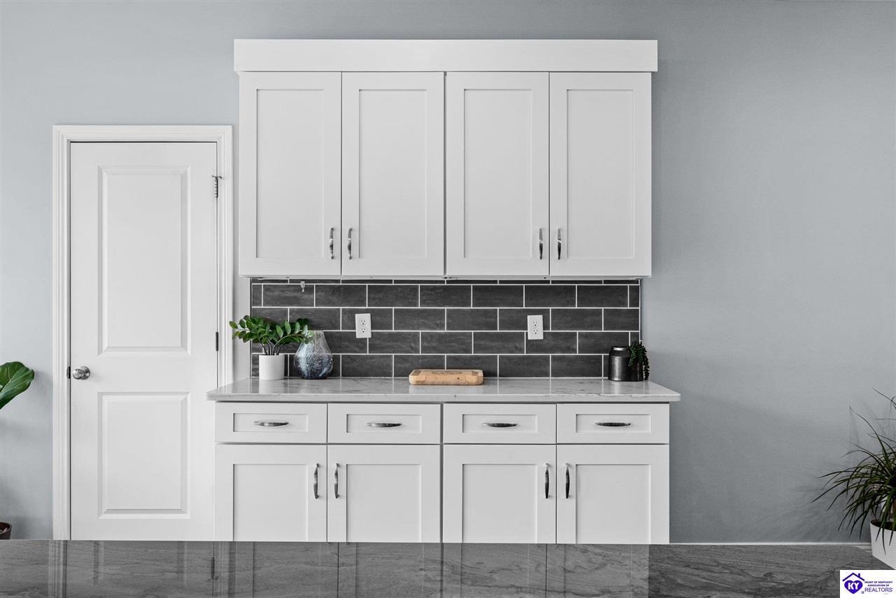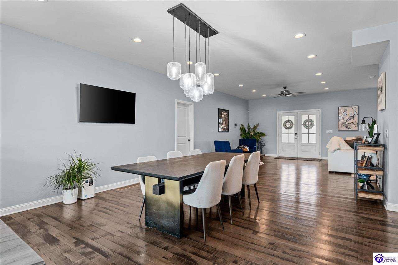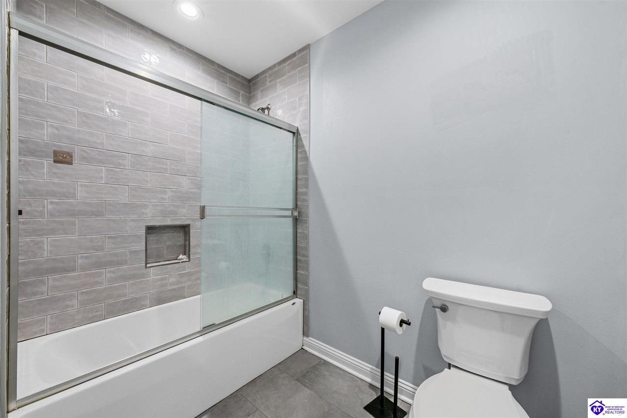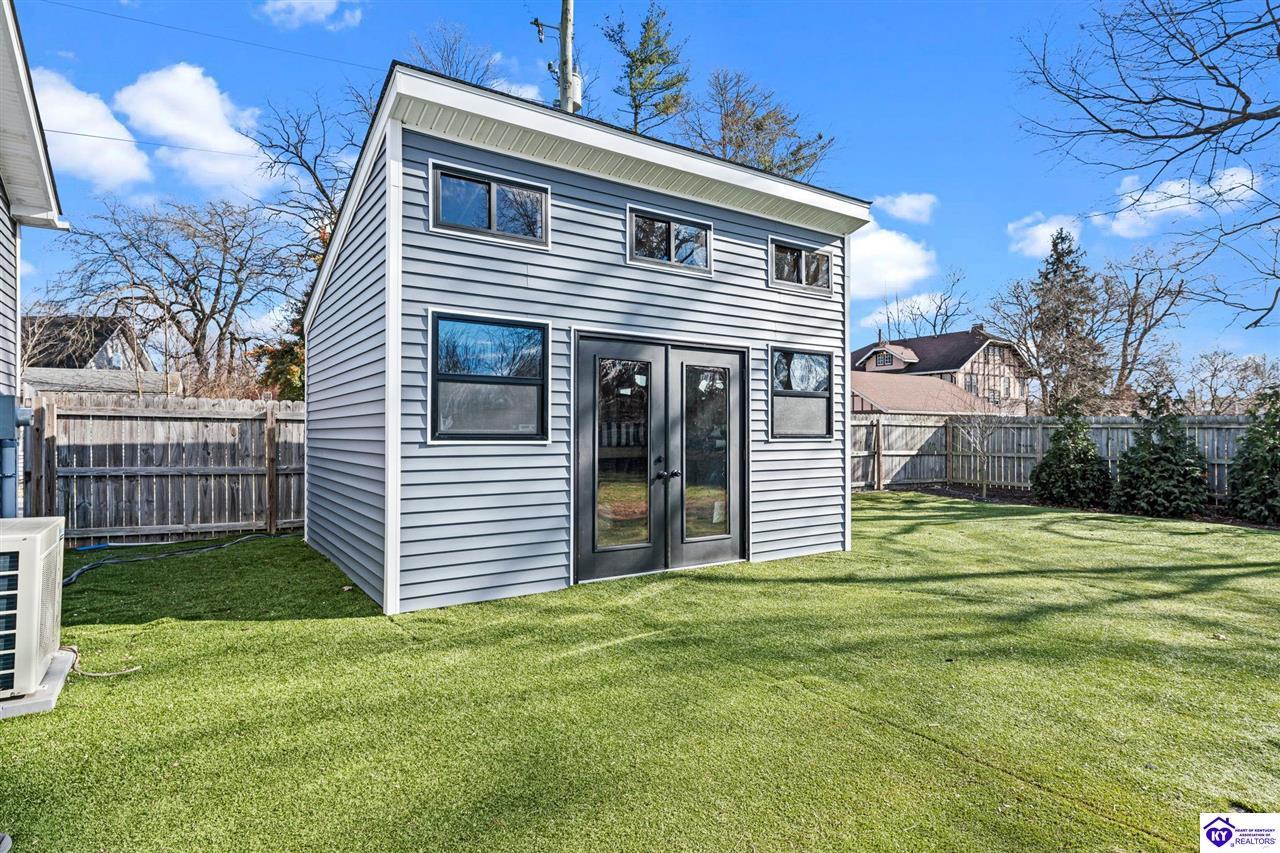 Realtor's notes: Chic modern design meets exceptional outdoor living in this beautifully remodeled home, where large windows frame sweeping views of the custom in-ground pool by Dixie Yard Works, multiple outdoor patios, and the striking pool house. Situated on a desirable corner lot within walking distance of downtown Elizabethtown, the home is filled with natural light, soaring ceilings, and hardwood floors that flow effortlessly throughout, creating a bright and welcoming atmosphere ideal for both everyday living and entertaining. The open-concept layout centers around a gourmet kitchen with granite countertops, high-end appliances, and stylish cabinetry, seamlessly connecting the kitchen, dining, and living areas. The primary suite offers a true retreat with a spa-inspired bathroom featuring modern finishes, a soaking tub, and a tiled walk-in shower with multiple shower heads. Thoughtfully designed for functionality, the home includes laundry rooms on both the main and second levels, along with a dedicated office, large mudroom, Jack-and-Jill bathroom, and a third-level flex space that adapts easily to your needs. Outdoor living truly sets this home apart. Enjoy summer days by the sparkling custom pool or unwind in the private pool house, complete with sleek glass garage doors, a bar area, and flexible space for a game room or fitness studio. The exterior is equally impressive with a covered patio featuring wood ceiling details, custom hardscaping, and an expansive front porch, making this exceptional property a rare opportunity in a prime location.