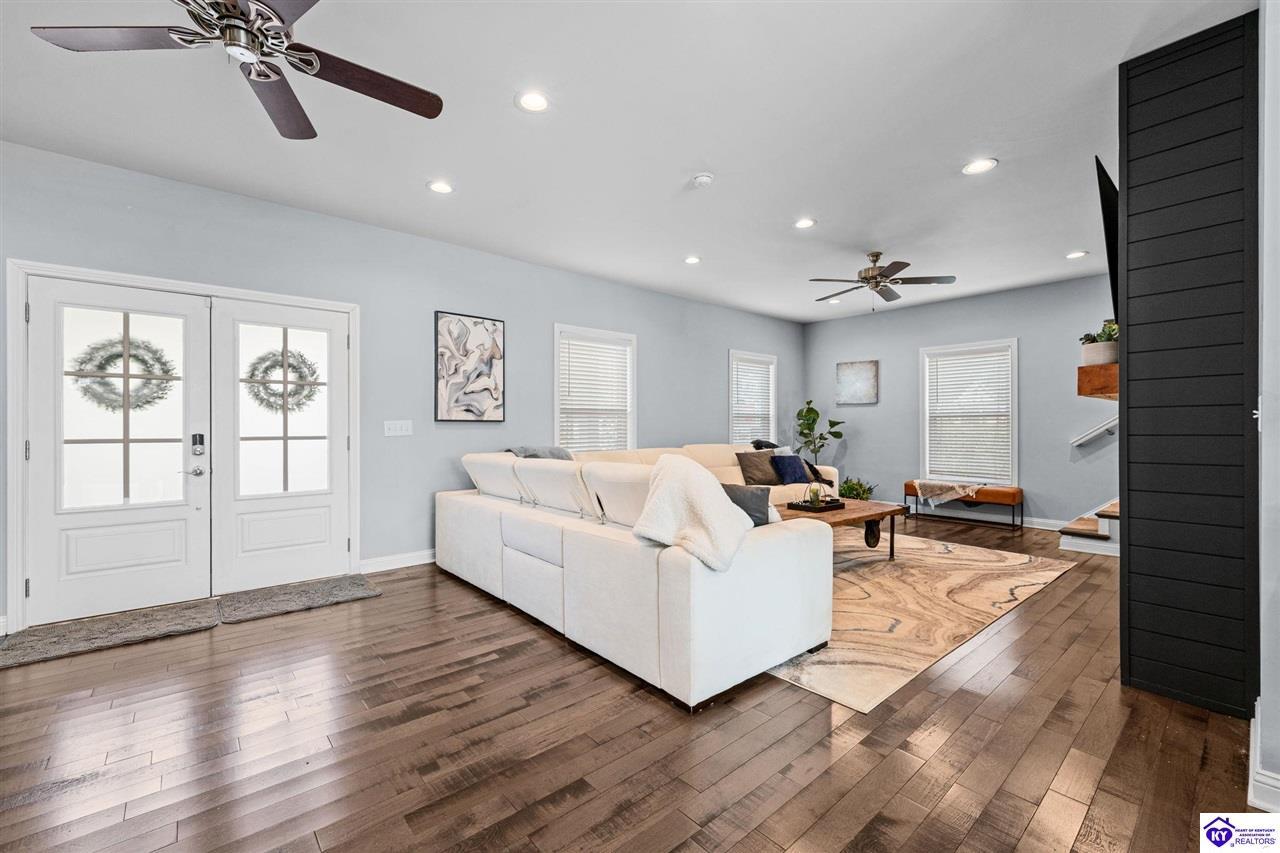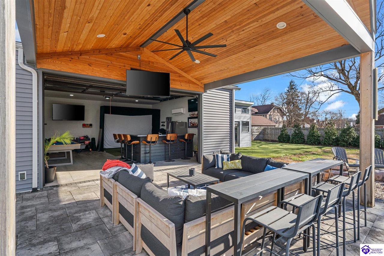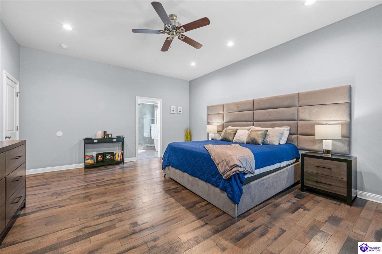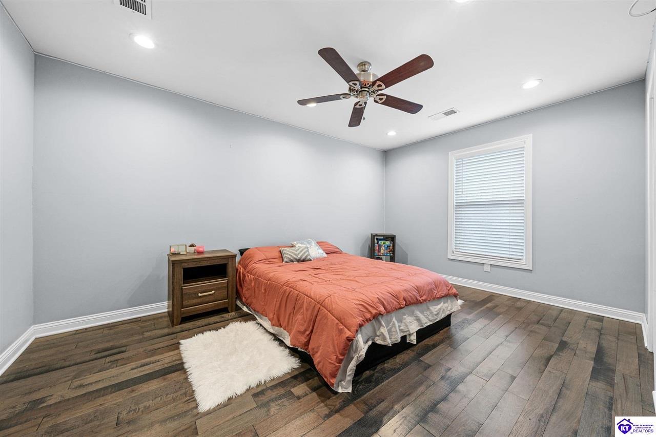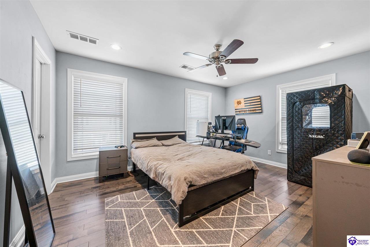 Realtor's notes: Chic modern design meets exceptional outdoor living in this beautifully remodeled home, where large windows frame sweeping views of the custom in-ground pool by Dixie Yard Works, multiple outdoor patios, and the striking pool house. Situated on a desirable corner lot within walking distance of downtown Elizabethtown, the home is filled with natural light, soaring ceilings, and hardwood floors that flow effortlessly throughout, creating a bright and welcoming atmosphere ideal for both everyday living and entertaining. The open-concept layout centers around a gourmet kitchen with granite countertops, high-end appliances, and stylish cabinetry, seamlessly connecting the kitchen, dining, and living areas. The primary suite offers a true retreat with a spa-inspired bathroom featuring modern finishes, a soaking tub, and a tiled walk-in shower with multiple shower heads. Thoughtfully designed for functionality, the home includes laundry rooms on both the main and second levels, along with a dedicated office, large mudroom, Jack-and-Jill bathroom, and a third-level flex space that adapts easily to your needs. Outdoor living truly sets this home apart. Enjoy summer days by the sparkling custom pool or unwind in the private pool house, complete with sleek glass garage doors, a bar area, and flexible space for a game room or fitness studio. The exterior is equally impressive with a covered patio featuring wood ceiling details, custom hardscaping, and an expansive front porch, making this exceptional property a rare opportunity in a prime location.