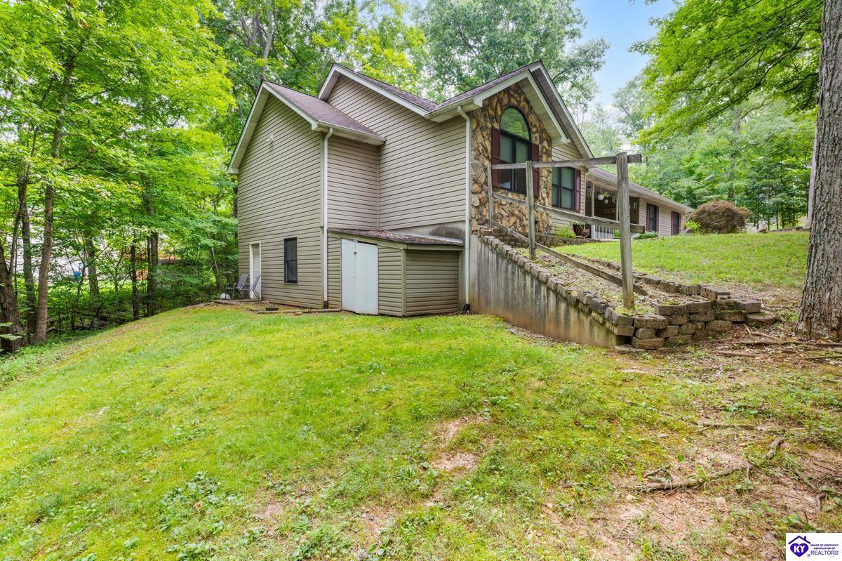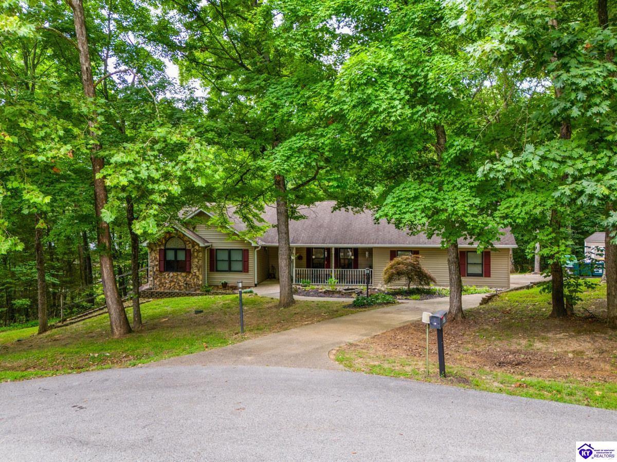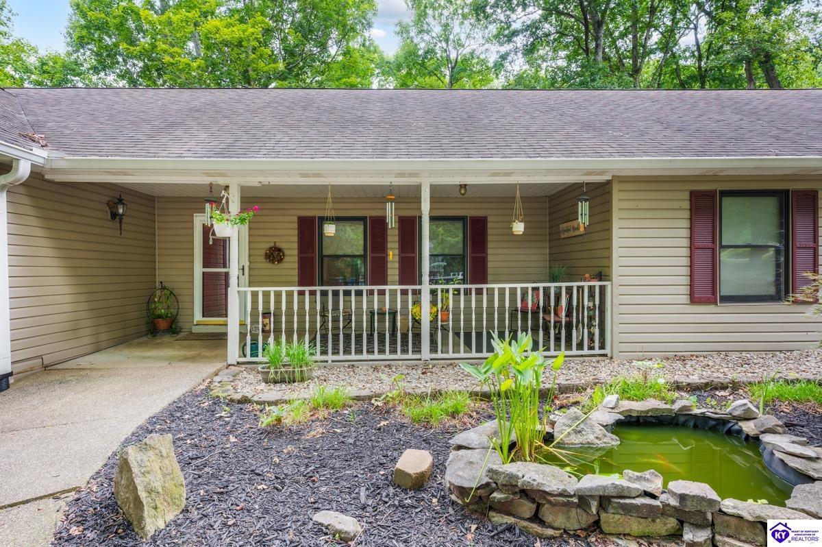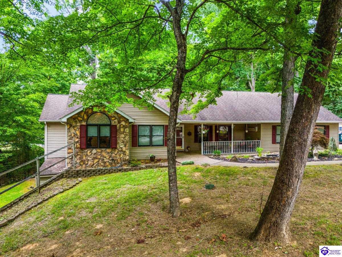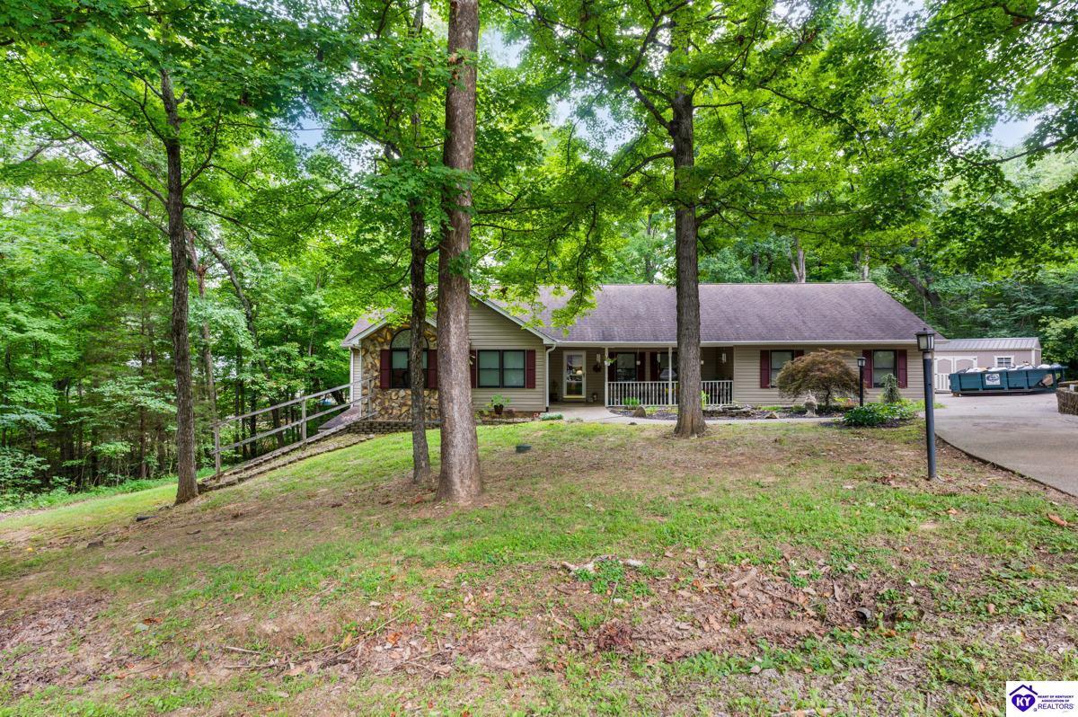 Realtor's notes: This inviting 3-bedroom, 2-bath ranch home is nestled among mature trees on a peaceful half-acre lot in the gated community of Doe Valley, conveniently located between Elizabethtown and Louisville. The exterior offers charming curb appeal with natural stone accents and a welcoming front porch. Inside, vaulted ceilings create a bright, open feel, while the partially finished basement provides flexible space for hobbies, storage, or future expansion. While the home reflects its original character, it presents a wonderful opportunity for updates to suit your personal style. Residents of Doe Valley enjoy access to a golf course, lake, restaurant, and additional community amenities, making this property a perfect blend of comfort, setting, and potential.