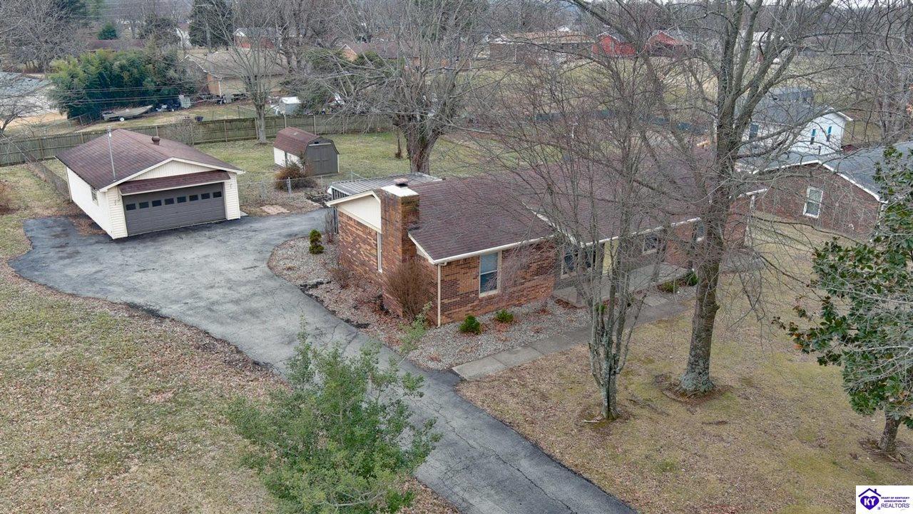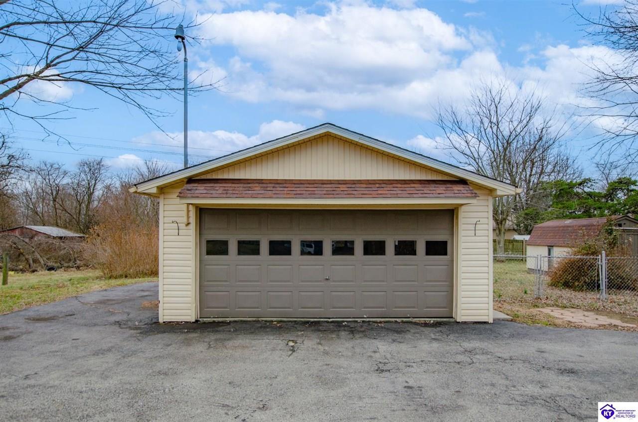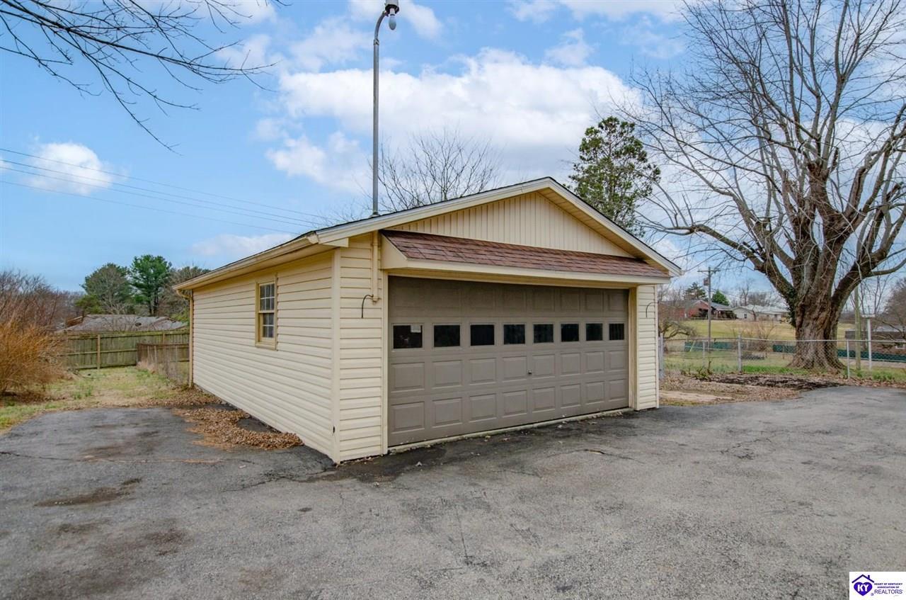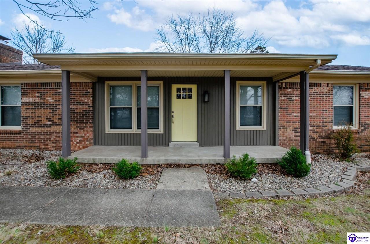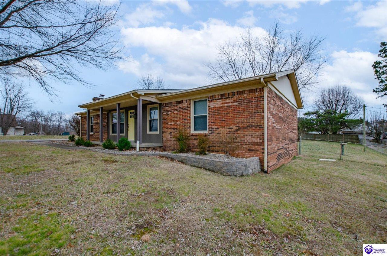 Realtor's notes: Beautiful all-brick ranch offering space, flexibility, and a prime location just outside the city limits of Elizabethtown! This well-maintained 3 bedroom, 3 full bath home features hardwood flooring and tile throughout for a clean, timeless look. The updated kitchen showcases modern countertops and ample cabinetry, making it both stylish and functional. With 2 of the bedrooms offering private full baths, there’s potential for dual primary suites — perfect for multi-generational living, guests, or added privacy. The split bedroom floor plan provides separation and comfort for everyone. Step outside to enjoy a large fenced rear yard, ideal for pets or outdoor gatherings. The covered back patio offers privacy and a great space to relax or entertain. Additional features include a detached 2-car garage, storage shed, and blacktop driveway for added convenience. Located just minutes from shopping, dining, and everyday amenities, this home combines peaceful living with quick access to everything Elizabethtown has to offer. Don’t miss your opportunity to make it yours!