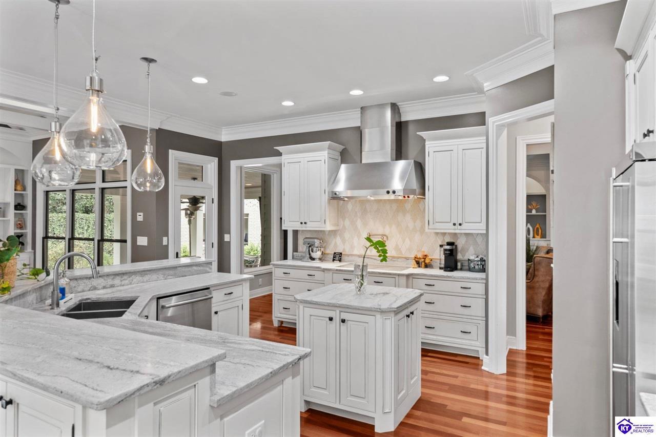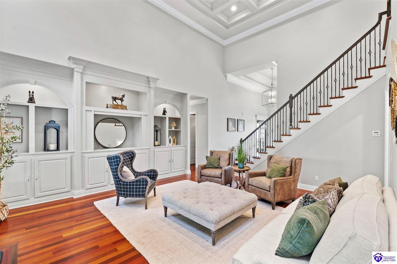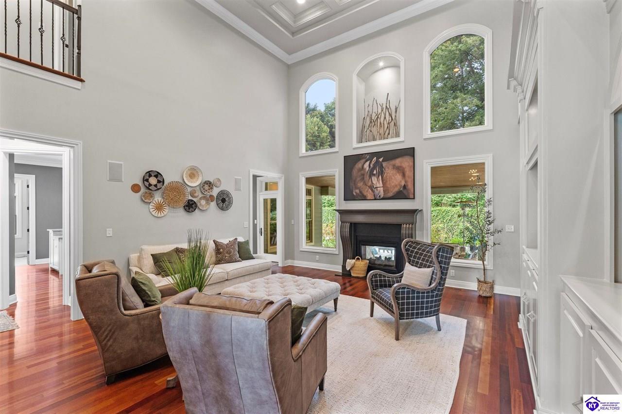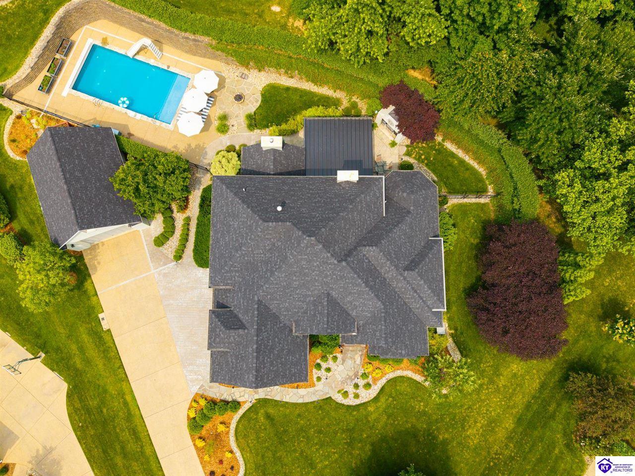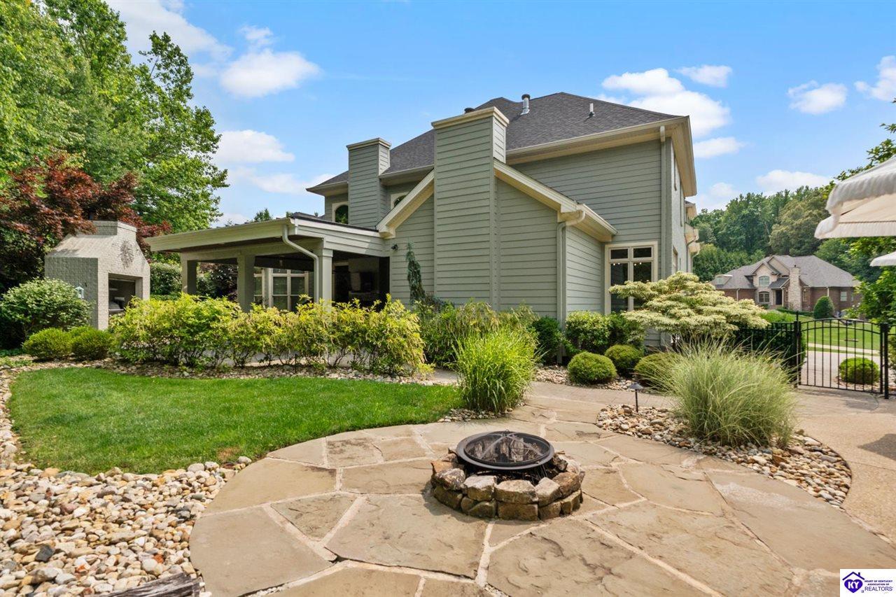 Realtor's notes: Experience refined luxury in this exceptional custom-built estate offering over 6,000 square feet of meticulously designed living space on nearly one acre situated on the Heartland Golf Course in one of Elizabethtown’s most prestigious settings. This 5-bedroom, 4 full and 2 half-bath luxury home blends timeless architecture with modern upgrades and premium finishes, complete with breathtaking golf course views. Recent improvements include a new roof (2023) on both the main residence and detached garage, whole-home generator, professional landscaping, multi-zone irrigation system, and integrated surround sound. Inside, rich hardwood floors, a dramatic two-story great room with gas fireplace, custom inlaid foyer, formal dining room, and elegant entertaining spaces create an impressive yet inviting atmosphere. The gourmet chef’s kitchen features Mouser inlaid cabinetry, marble countertops, dual islands, stainless steel appliances, and a sunlit breakfast area that opens seamlessly to a cozy family room. The main-level primary suite is a private retreat with tray ceilings, sitting area, spa-inspired bath with soaking tub, oversized tiled shower, dual vanities with dedicated makeup station, and separate walk-in closets. Upstairs, three spacious bedrooms each offer ensuite baths and access to a large bonus room. The finished walkout basement is an entertainer’s dream with a custom bourbon bar, home theater, game room, fitness room, executive office, and convenient pool bath. Step outside to your backyard oasis overlooking the golf course, featuring an expansive covered terrace with stone fireplace, built-in Firemagic outdoor kitchen, heated saltwater pool with fountains and waterslide, and professionally landscaped grounds, perfect for hosting and relaxing alike. A 2.5-car attached garage and oversized detached garage with upper loft storage complete this move-in ready, resort-style property. Luxury, privacy, golf course living, and prime Elizabethtown location near shopping, dining, and Fort Knox, this is more than a home, it’s a lifestyle.