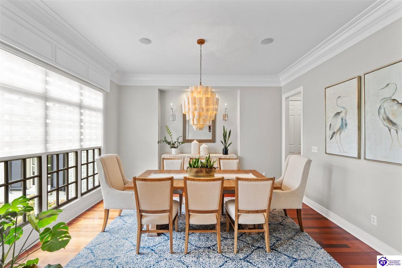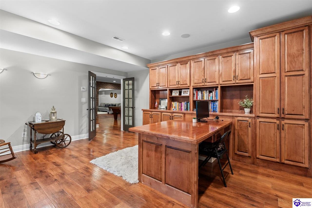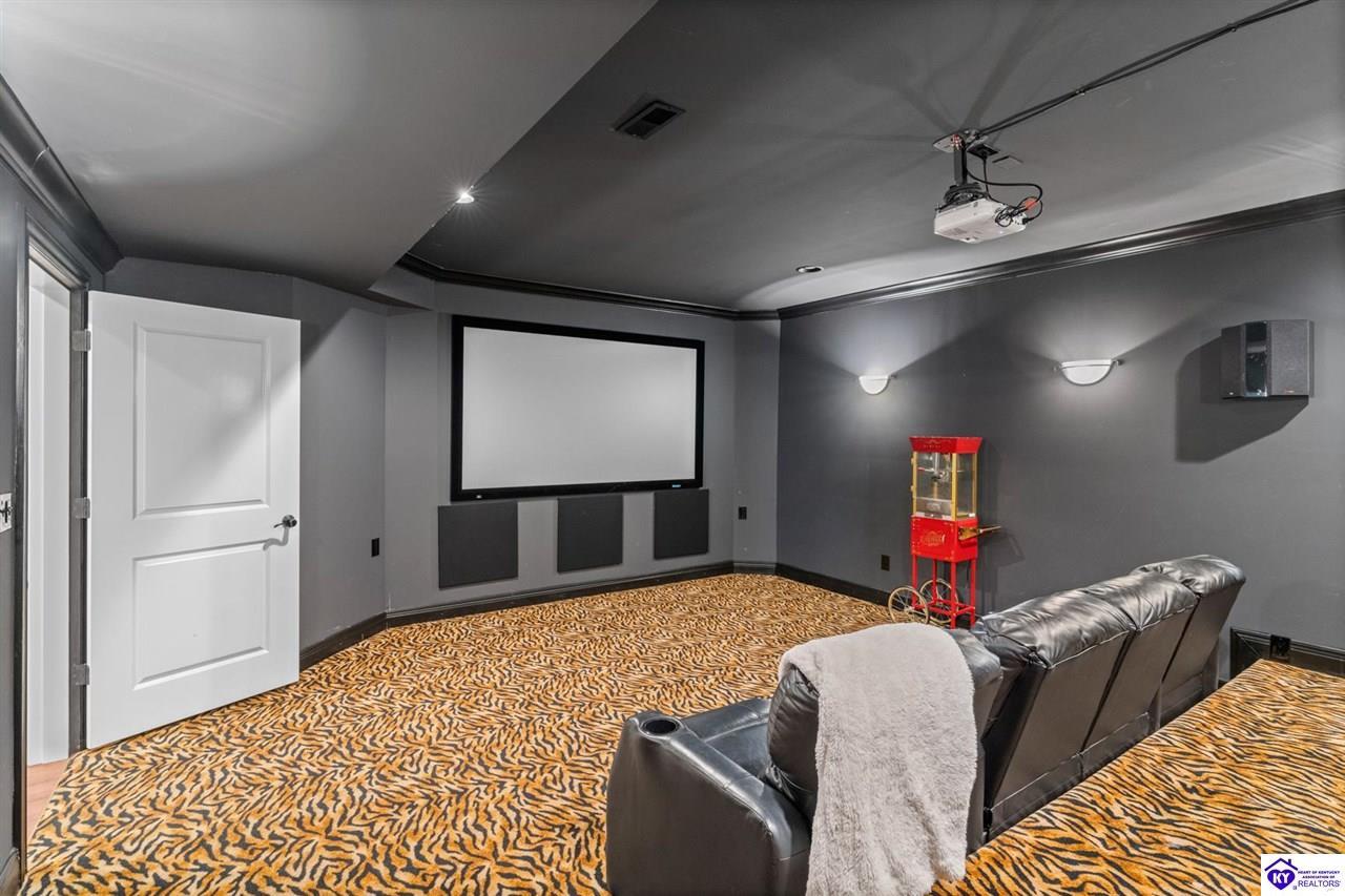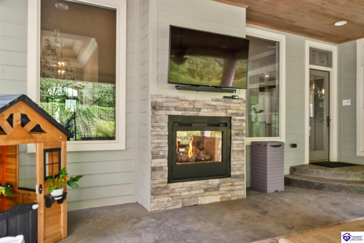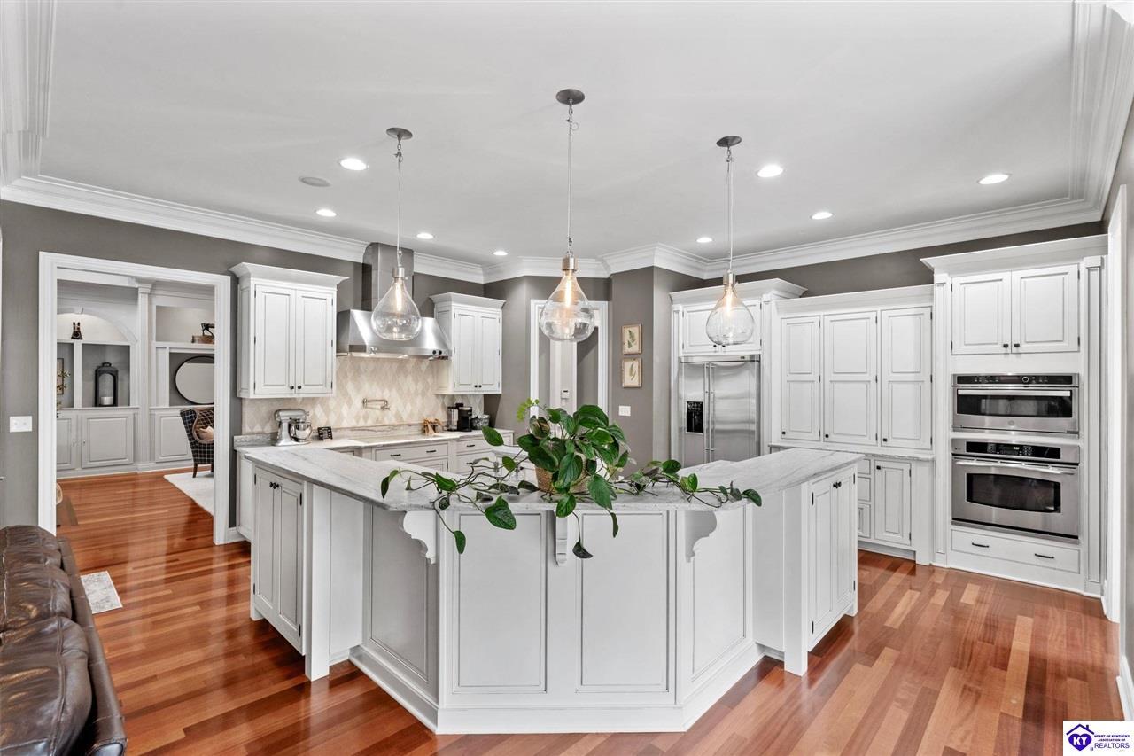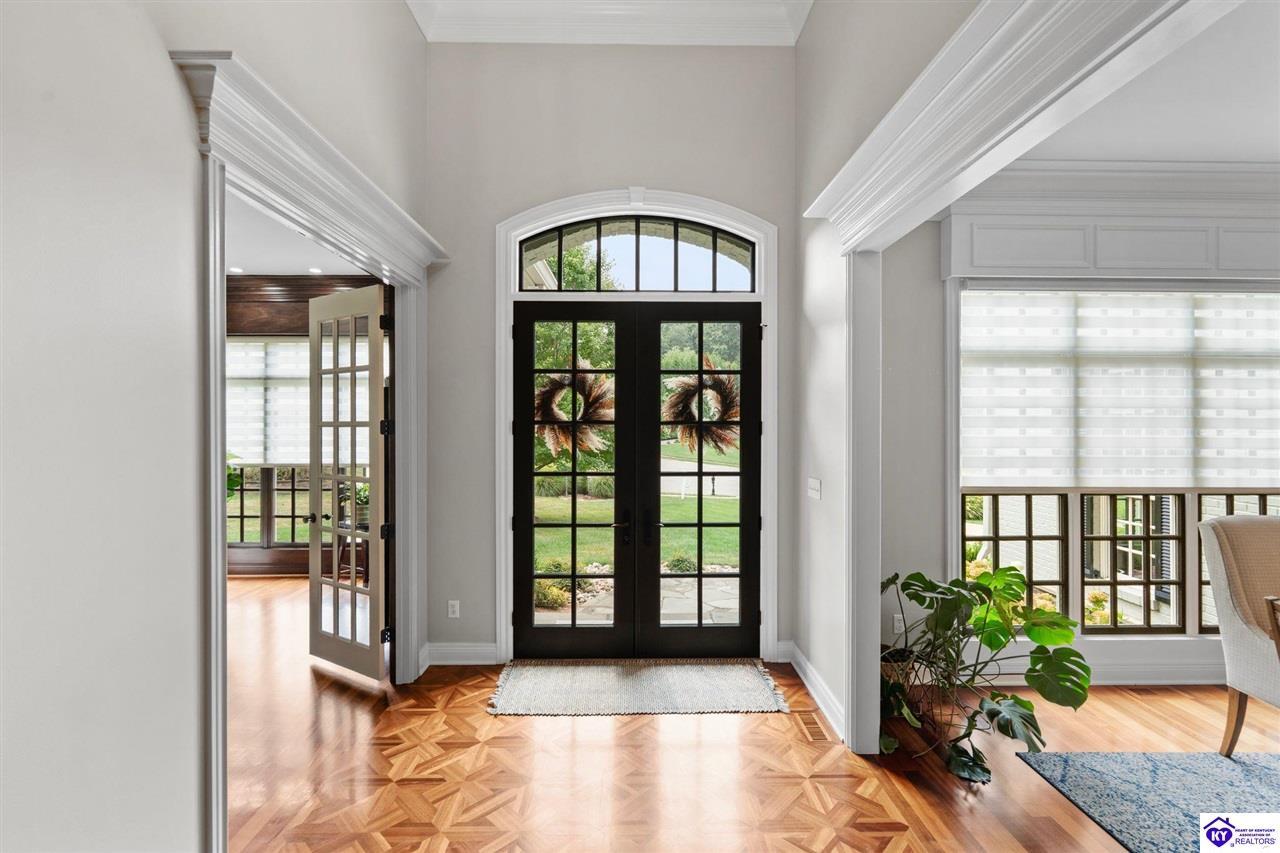 Realtor's notes: Experience refined luxury in this exceptional custom-built estate offering over 6,000 square feet of meticulously designed living space on nearly one acre situated on the Heartland Golf Course in one of Elizabethtown’s most prestigious settings. This 5-bedroom, 4 full and 2 half-bath luxury home blends timeless architecture with modern upgrades and premium finishes, complete with breathtaking golf course views. Recent improvements include a new roof (2023) on both the main residence and detached garage, whole-home generator, professional landscaping, multi-zone irrigation system, and integrated surround sound. Inside, rich hardwood floors, a dramatic two-story great room with gas fireplace, custom inlaid foyer, formal dining room, and elegant entertaining spaces create an impressive yet inviting atmosphere. The gourmet chef’s kitchen features Mouser inlaid cabinetry, marble countertops, dual islands, stainless steel appliances, and a sunlit breakfast area that opens seamlessly to a cozy family room. The main-level primary suite is a private retreat with tray ceilings, sitting area, spa-inspired bath with soaking tub, oversized tiled shower, dual vanities with dedicated makeup station, and separate walk-in closets. Upstairs, three spacious bedrooms each offer ensuite baths and access to a large bonus room. The finished walkout basement is an entertainer’s dream with a custom bourbon bar, home theater, game room, fitness room, executive office, and convenient pool bath. Step outside to your backyard oasis overlooking the golf course, featuring an expansive covered terrace with stone fireplace, built-in Firemagic outdoor kitchen, heated saltwater pool with fountains and waterslide, and professionally landscaped grounds, perfect for hosting and relaxing alike. A 2.5-car attached garage and oversized detached garage with upper loft storage complete this move-in ready, resort-style property. Luxury, privacy, golf course living, and prime Elizabethtown location near shopping, dining, and Fort Knox, this is more than a home, it’s a lifestyle.