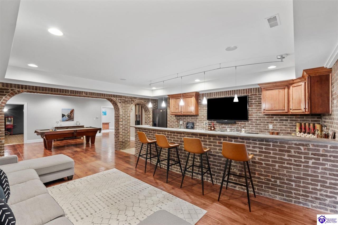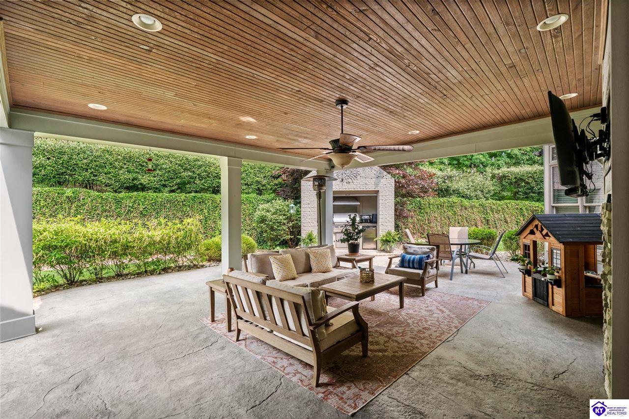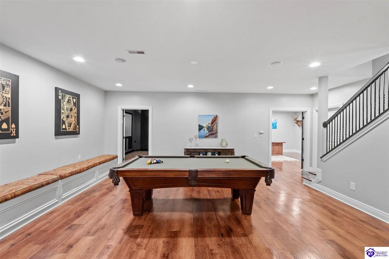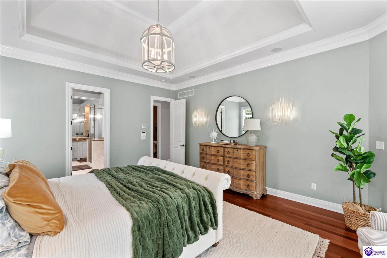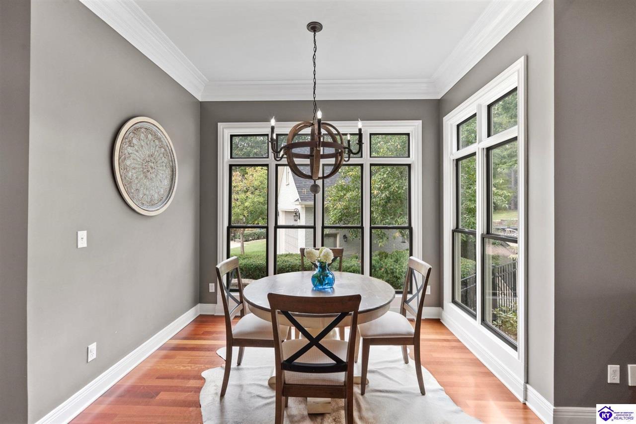 Realtor's notes: Experience refined luxury in this exceptional custom-built estate offering over 6,000 square feet of meticulously designed living space on nearly one acre situated on the Heartland Golf Course in one of Elizabethtown’s most prestigious settings. This 5-bedroom, 4 full and 2 half-bath luxury home blends timeless architecture with modern upgrades and premium finishes, complete with breathtaking golf course views. Recent improvements include a new roof (2023) on both the main residence and detached garage, whole-home generator, professional landscaping, multi-zone irrigation system, and integrated surround sound. Inside, rich hardwood floors, a dramatic two-story great room with gas fireplace, custom inlaid foyer, formal dining room, and elegant entertaining spaces create an impressive yet inviting atmosphere. The gourmet chef’s kitchen features Mouser inlaid cabinetry, marble countertops, dual islands, stainless steel appliances, and a sunlit breakfast area that opens seamlessly to a cozy family room. The main-level primary suite is a private retreat with tray ceilings, sitting area, spa-inspired bath with soaking tub, oversized tiled shower, dual vanities with dedicated makeup station, and separate walk-in closets. Upstairs, three spacious bedrooms each offer ensuite baths and access to a large bonus room. The finished walkout basement is an entertainer’s dream with a custom bourbon bar, home theater, game room, fitness room, executive office, and convenient pool bath. Step outside to your backyard oasis overlooking the golf course, featuring an expansive covered terrace with stone fireplace, built-in Firemagic outdoor kitchen, heated saltwater pool with fountains and waterslide, and professionally landscaped grounds, perfect for hosting and relaxing alike. A 2.5-car attached garage and oversized detached garage with upper loft storage complete this move-in ready, resort-style property. Luxury, privacy, golf course living, and prime Elizabethtown location near shopping, dining, and Fort Knox, this is more than a home, it’s a lifestyle.